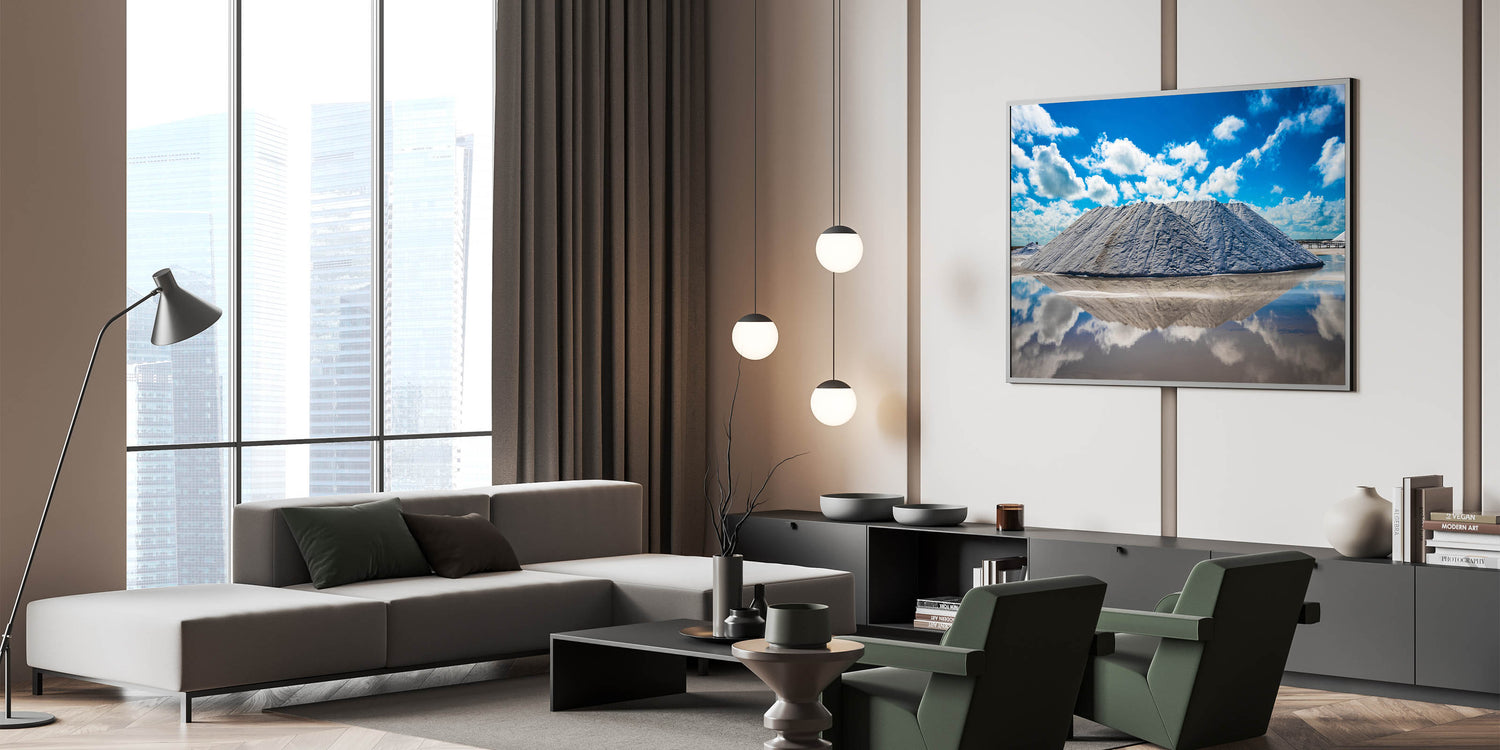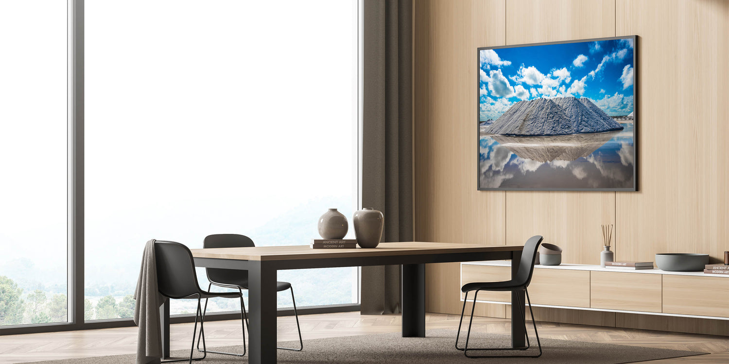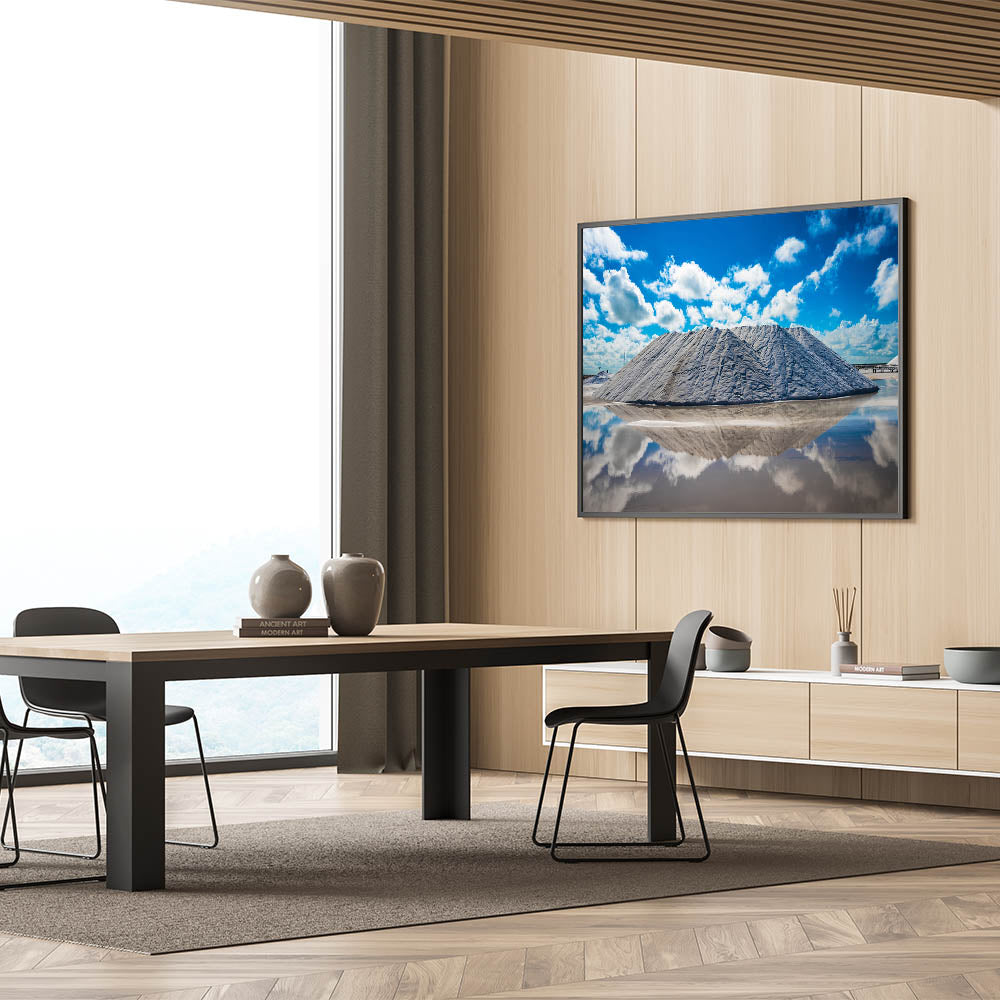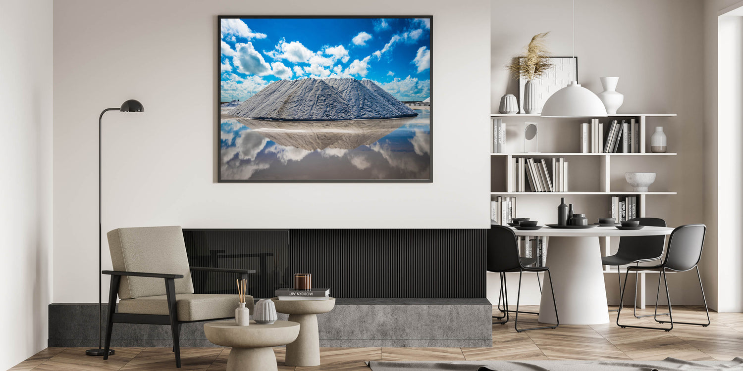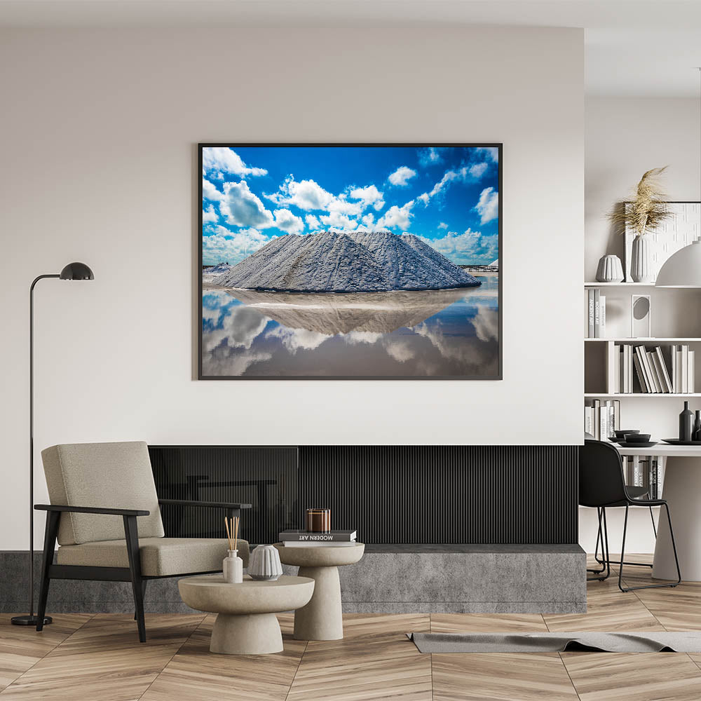 Experience the breathtaking beauty of Yucatan’s salt flats with this stunning Yucatan canvas art. Featuring towering salt mounds reflected in the clear water below, this Mexico Yucatan print showcases the unique and dramatic landscapes found in the region. The bright blue sky and fluffy clouds create a perfect contrast against the crisp white salt, producing a mesmerizing, almost surreal scene. Perfect for nature lovers and travel enthusiasts, this Yucatan print adds a touch of modern elegance and natural beauty to any space.