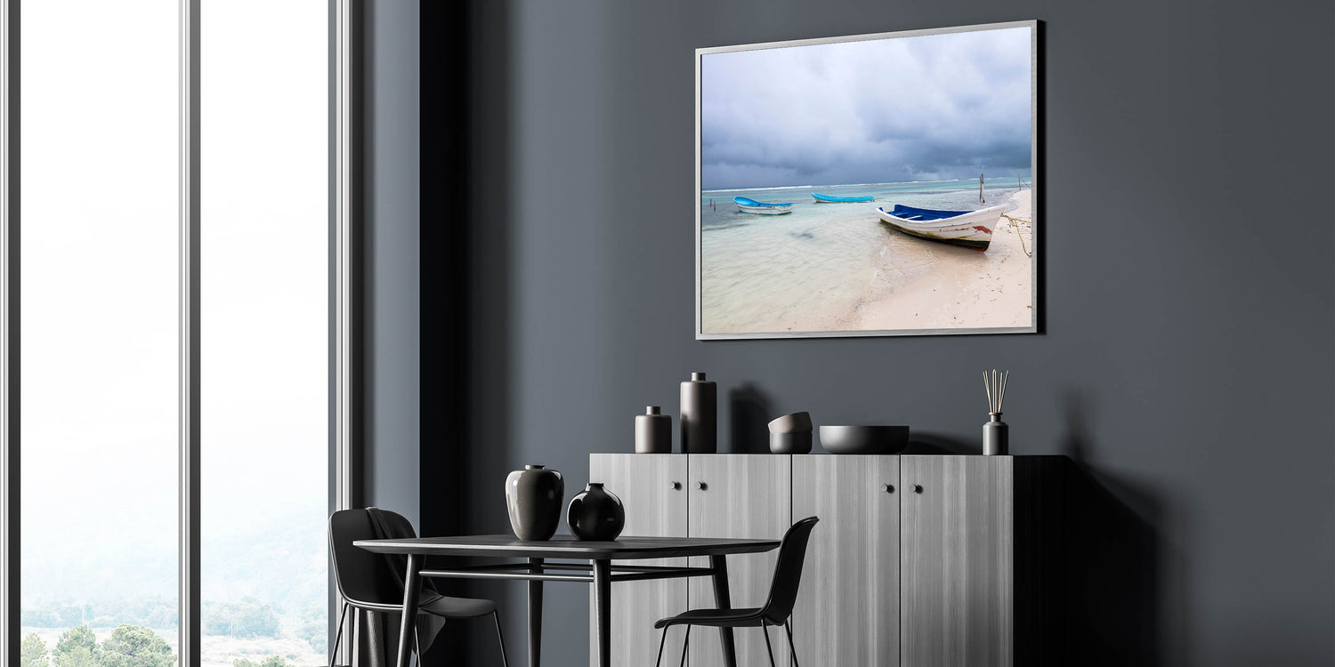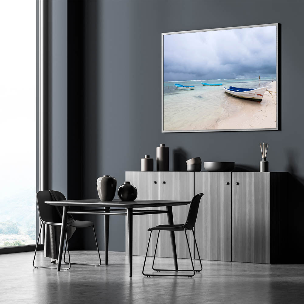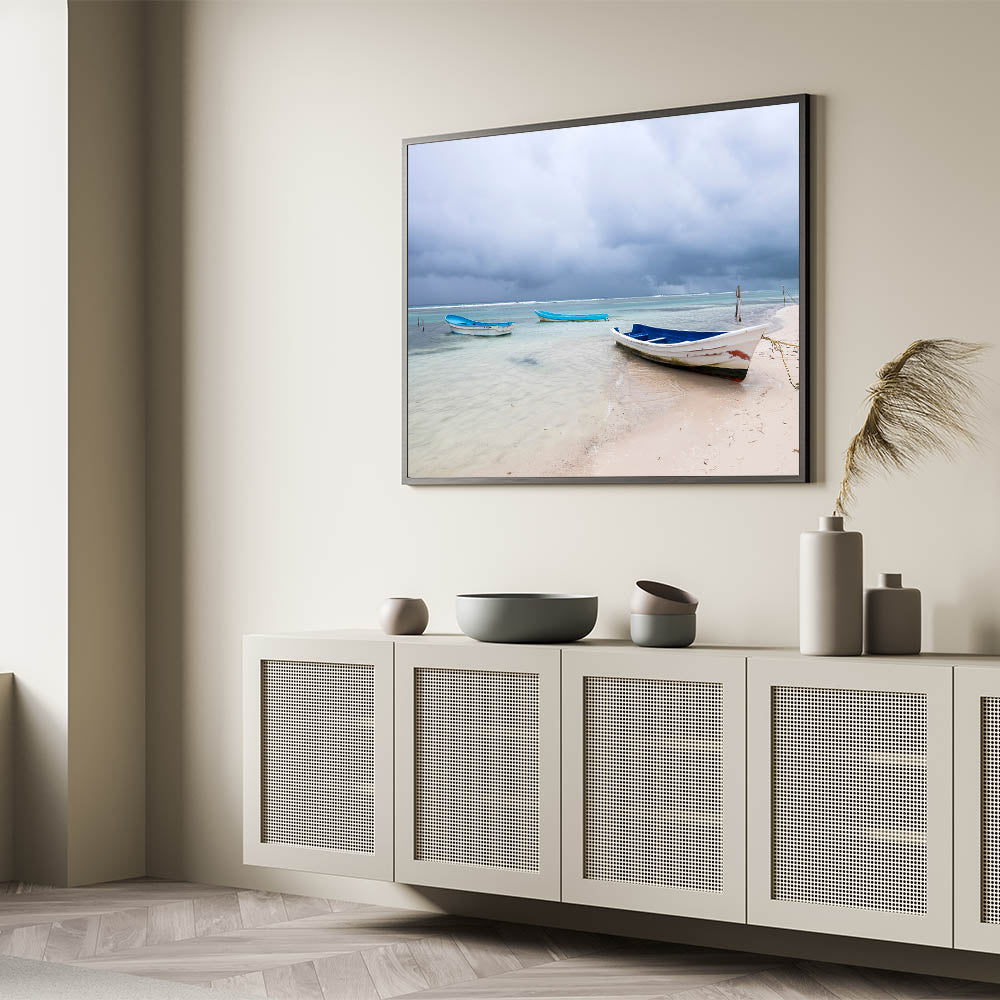 Immerse yourself in the tranquil beauty of the Yucatan Peninsula with this serene beach scene. Featuring calm waters and rustic boats, this Scenic Yucatan photography print captures the peaceful charm of Mexico’s coastal life. Ideal for adding a soothing, coastal vibe to any room, this Yucatan Peninsula decor piece evokes the serenity and simplicity of life by the sea. The soft hues of blue and white paired with the dramatic skies create a beautiful contrast that will enhance your home decor with a touch of natural beauty.