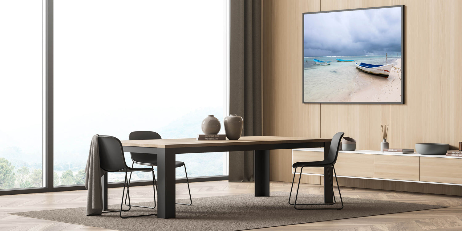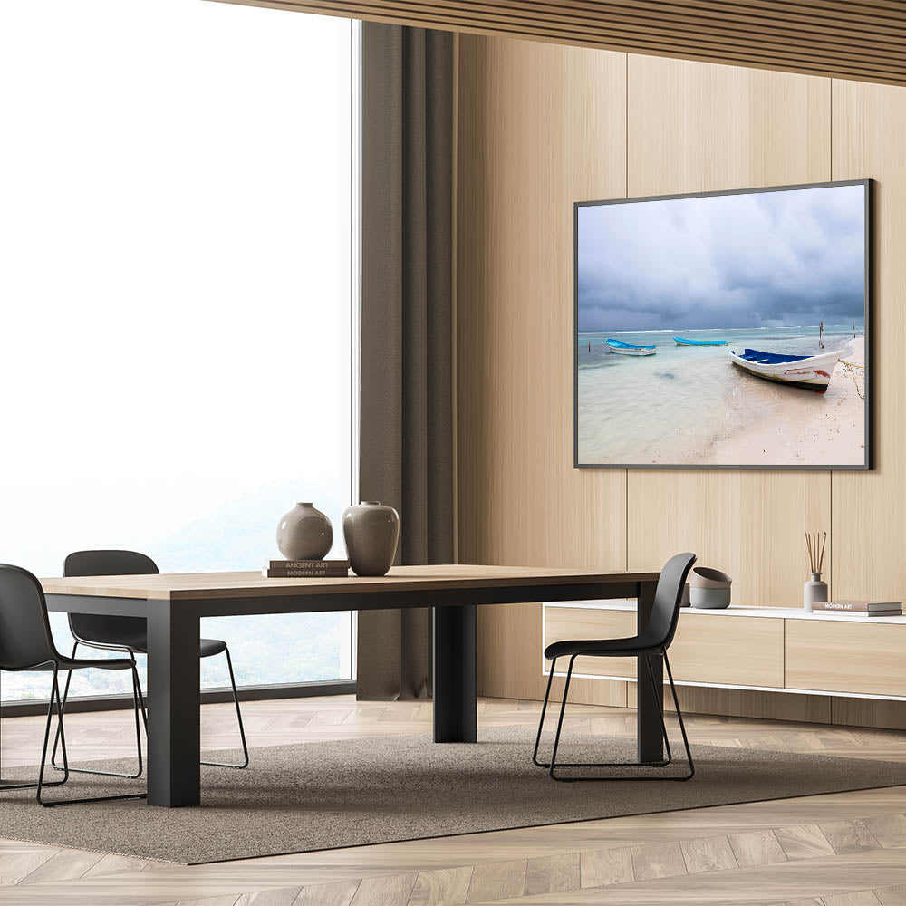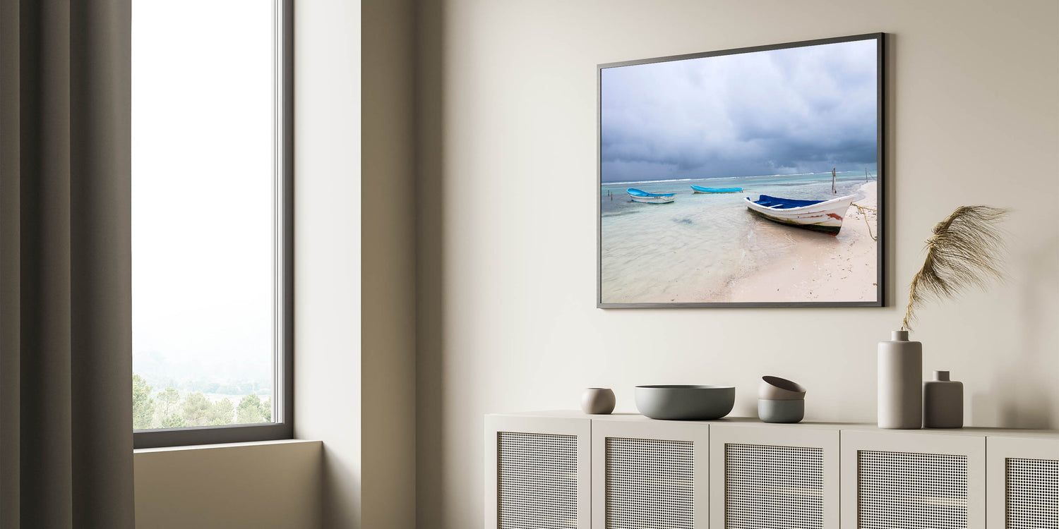 Immerse yourself in the tranquil beauty of the Yucatan Peninsula with this serene beach scene. Featuring calm waters and rustic boats, this Scenic Yucatan photography print captures the peaceful charm of Mexico’s coastal life. Ideal for adding a soothing, coastal vibe to any room, this Yucatan Peninsula decor piece evokes the serenity and simplicity of life by the sea. The soft hues of blue and white paired with the dramatic skies create a beautiful contrast that will enhance your home decor with a touch of natural beauty.
