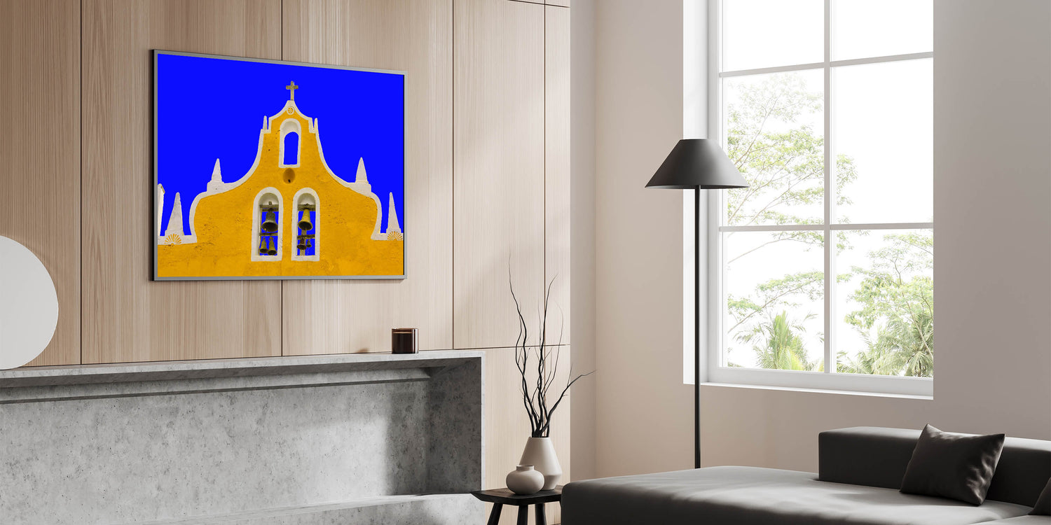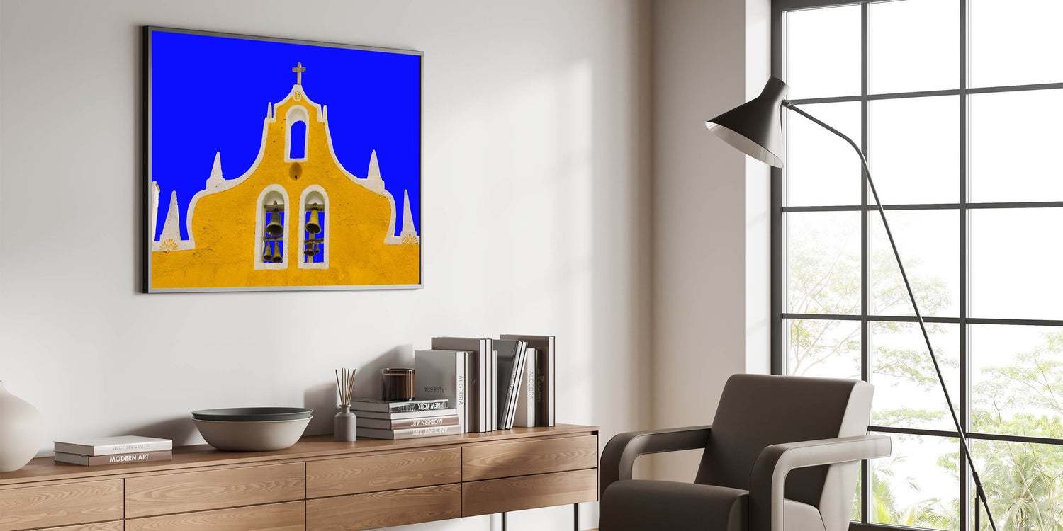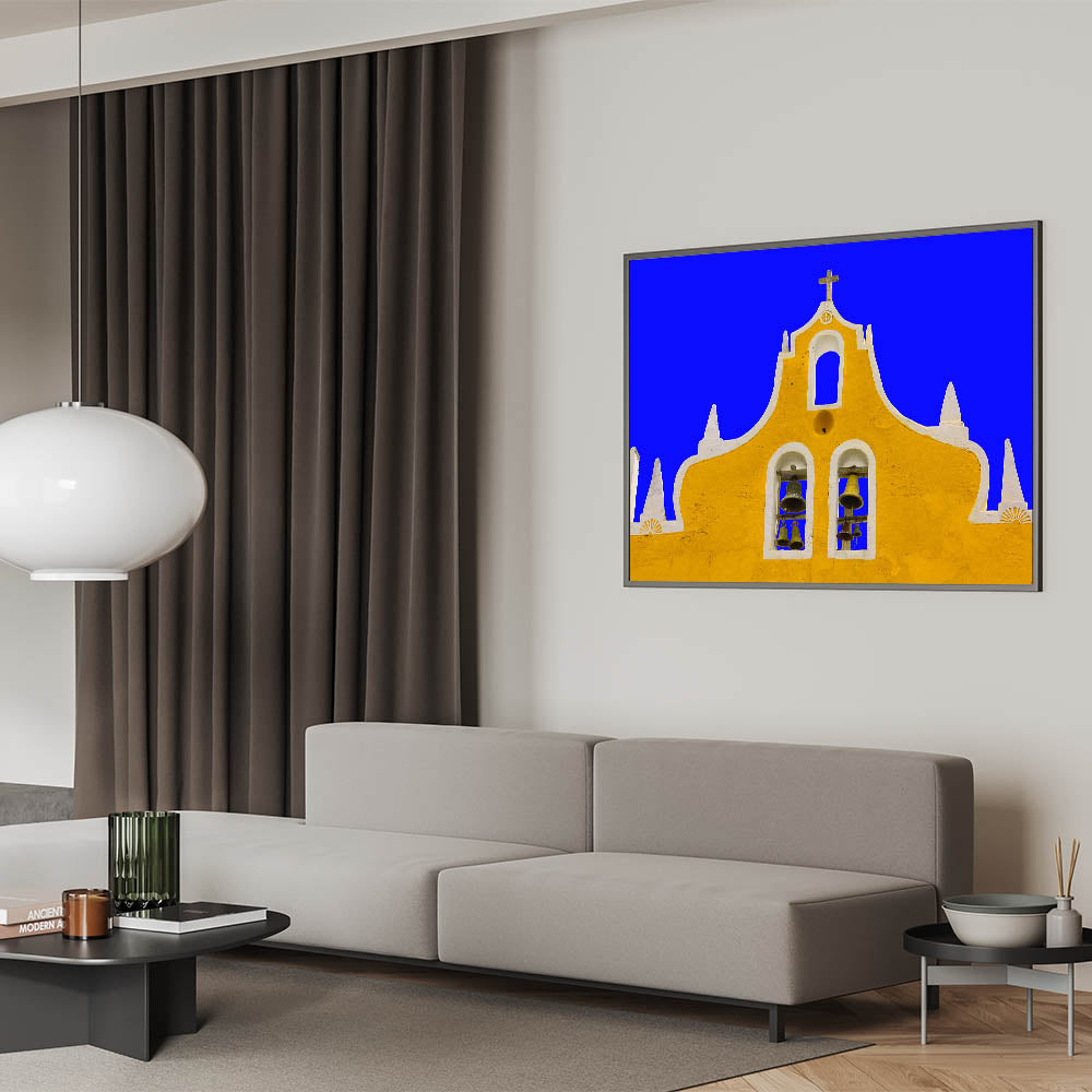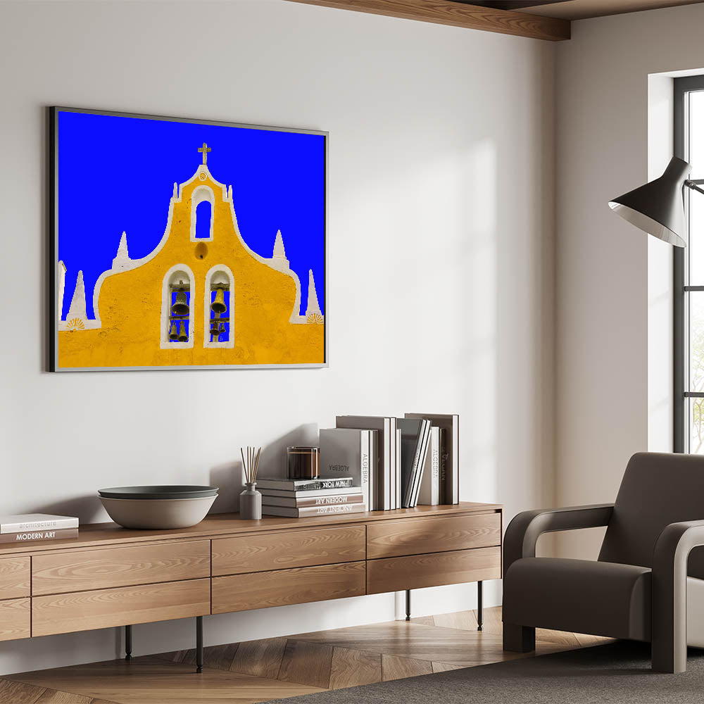 Bring the vibrant essence of Mexico's Yucatan Peninsula into your space with this stunning Yucatan Wall Art. Featuring the striking architecture of a traditional bell tower set against a bold, bright blue sky, this piece celebrates both Mexico Yucatan Prints and Mayan Ruins Art. Perfect for anyone who loves Yucatan travel photography or wants to add a touch of Mexican cultural art to their home.