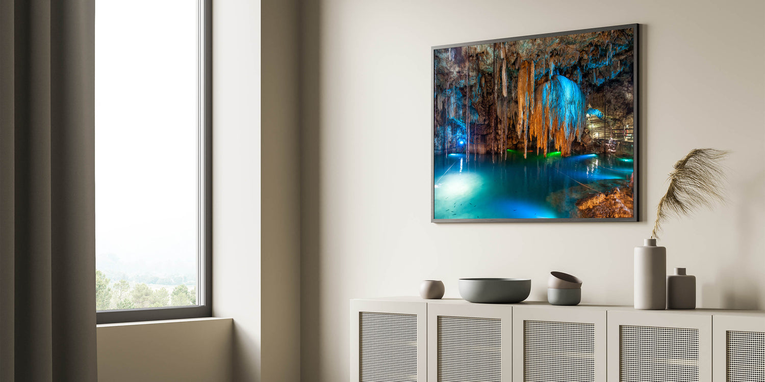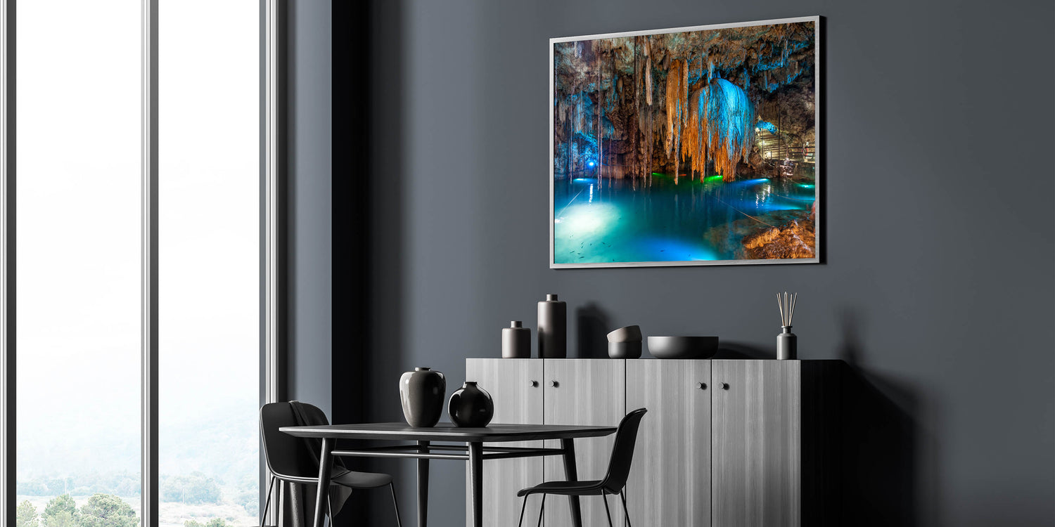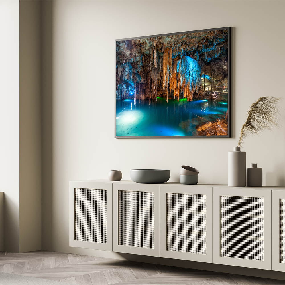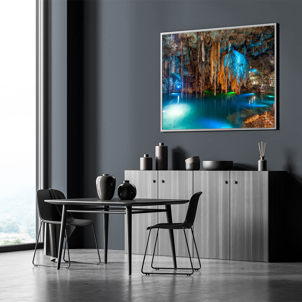 Discover the enchanting beauty of Mexico with this Yucatan Wall Art. Featuring a stunning cenote from the heart of Yucatan, this scenic Yucatan photography piece captures the vibrant and serene essence of the region. The mystical underground water caves, stalactites, and crystal-clear waters make this design a perfect addition to any space, offering a unique view of Yucatan’s natural beauty. Whether you're decorating your living room, bedroom, or office, this Mexico Yucatan print brings the essence of Yucatan travel photography into your home.