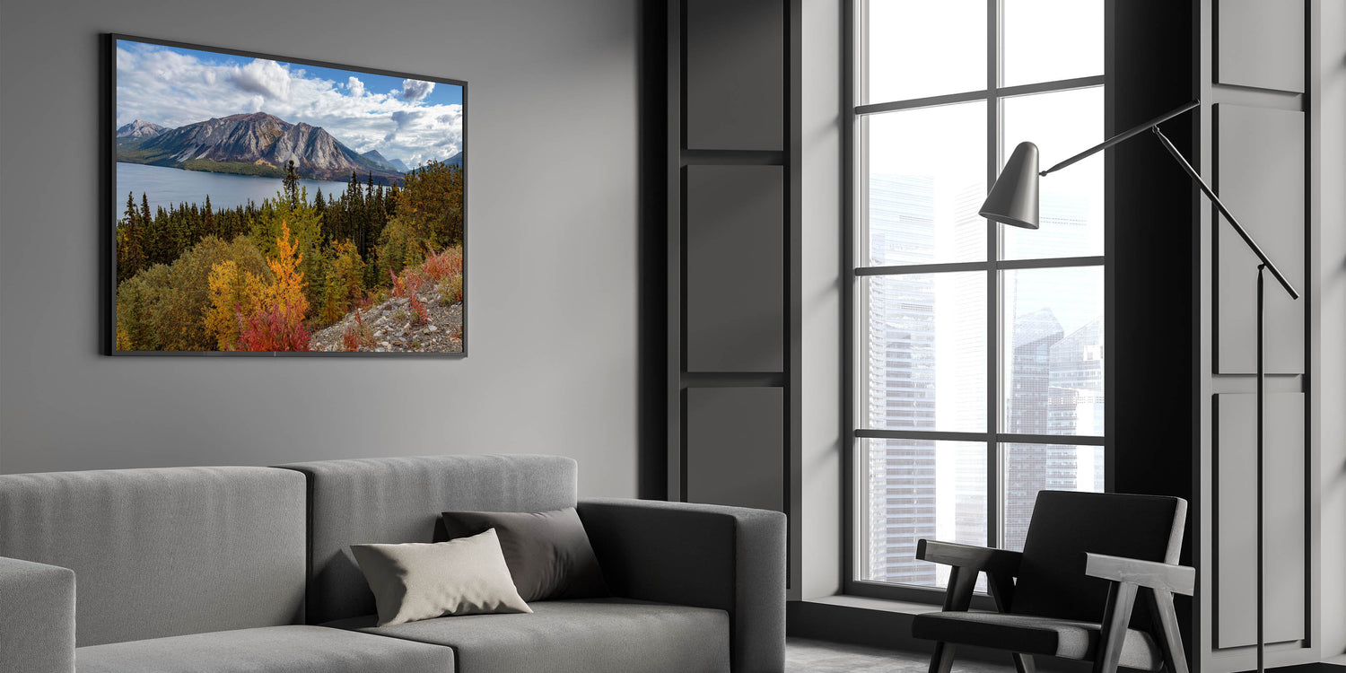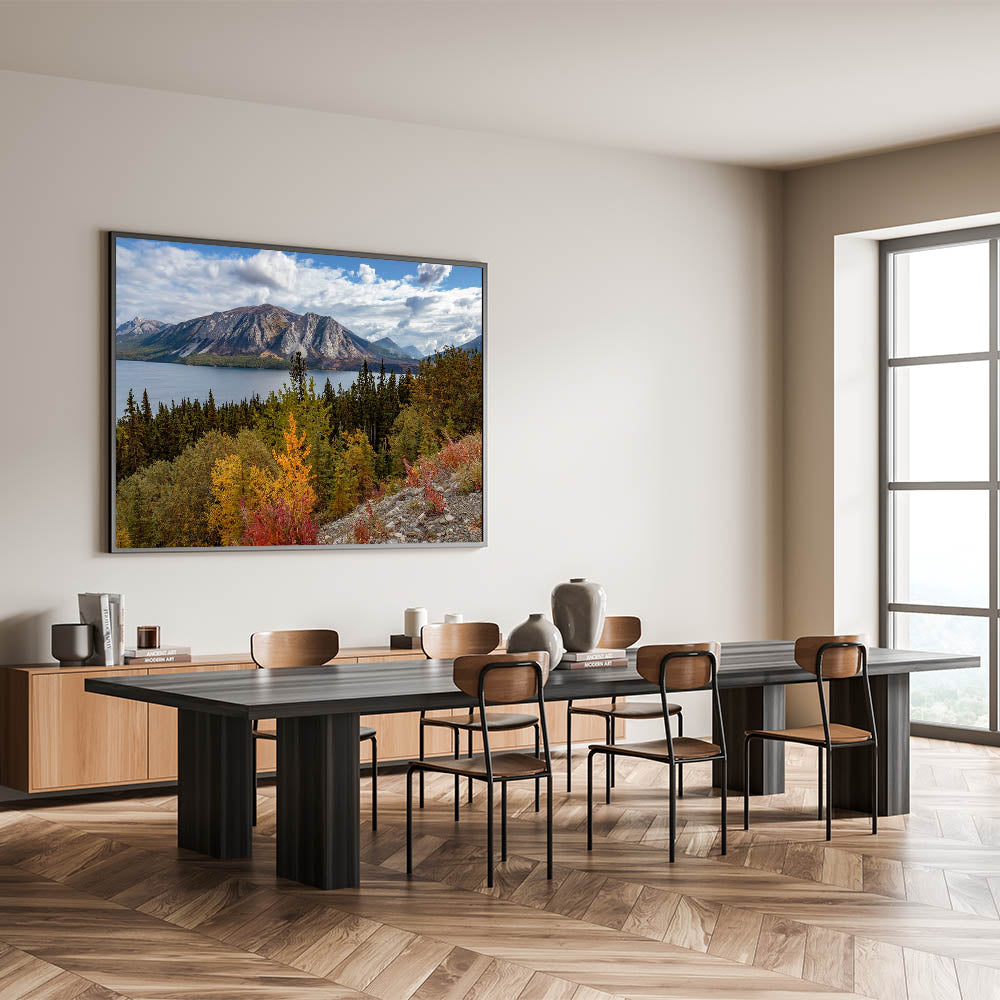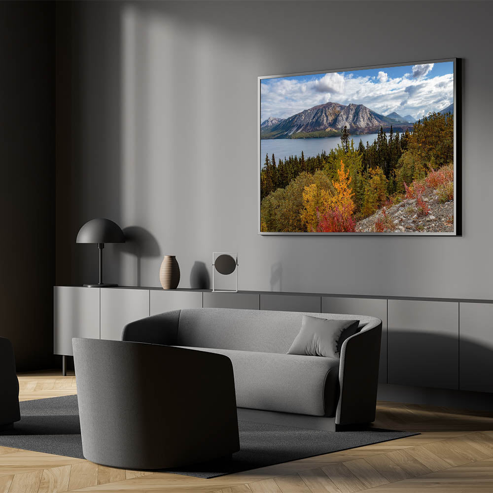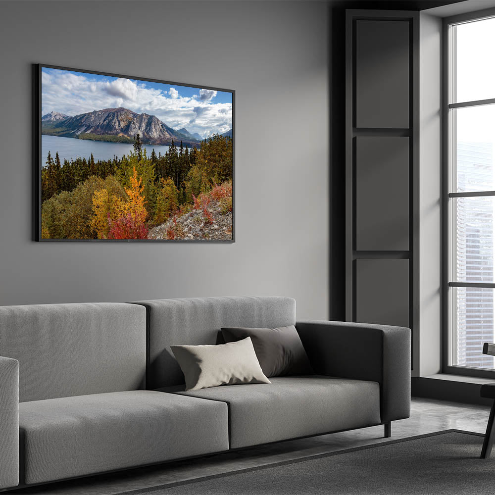 Perfect for any nature enthusiast or anyone looking to bring the tranquil yet vibrant essence of the Yukon's autumn landscape into their space.