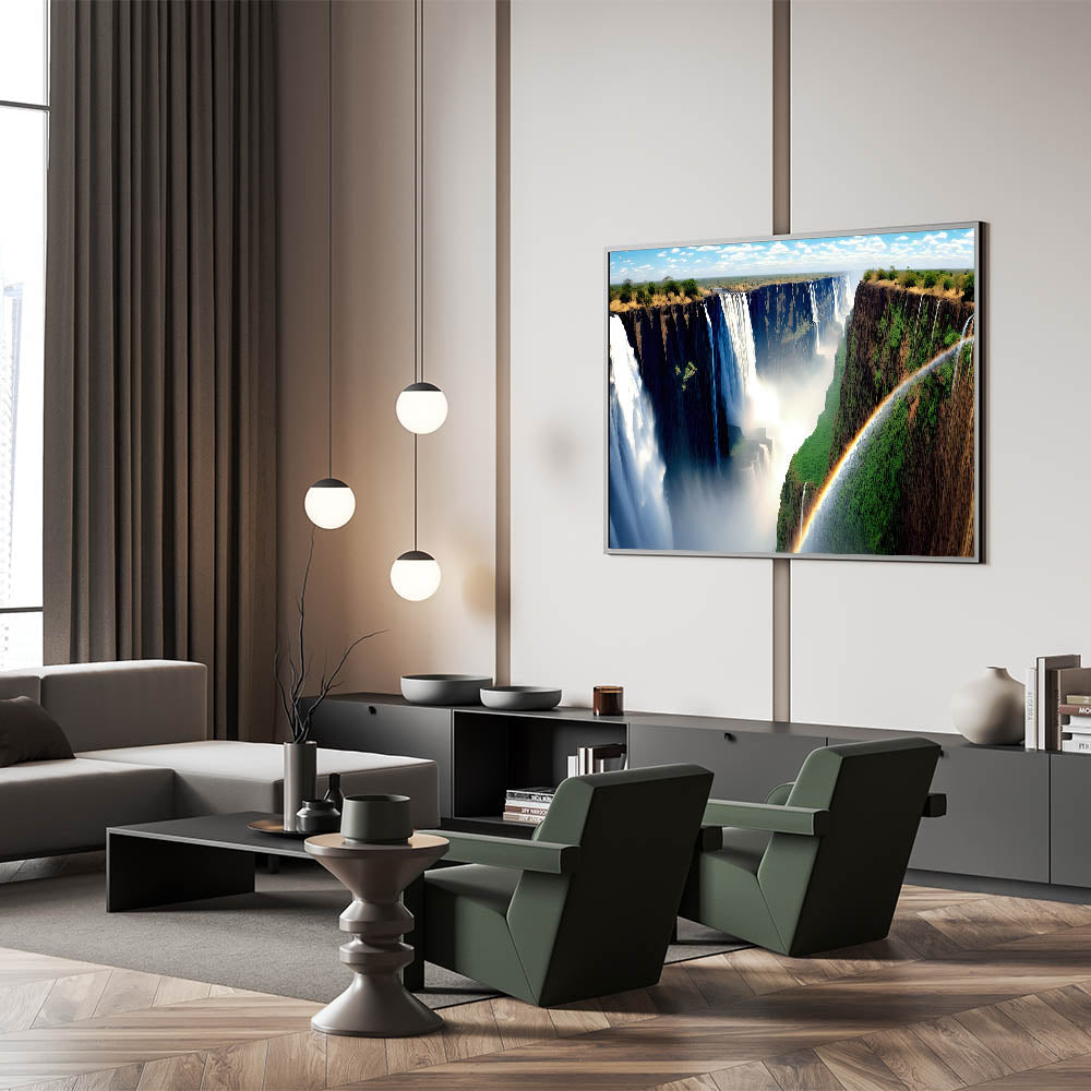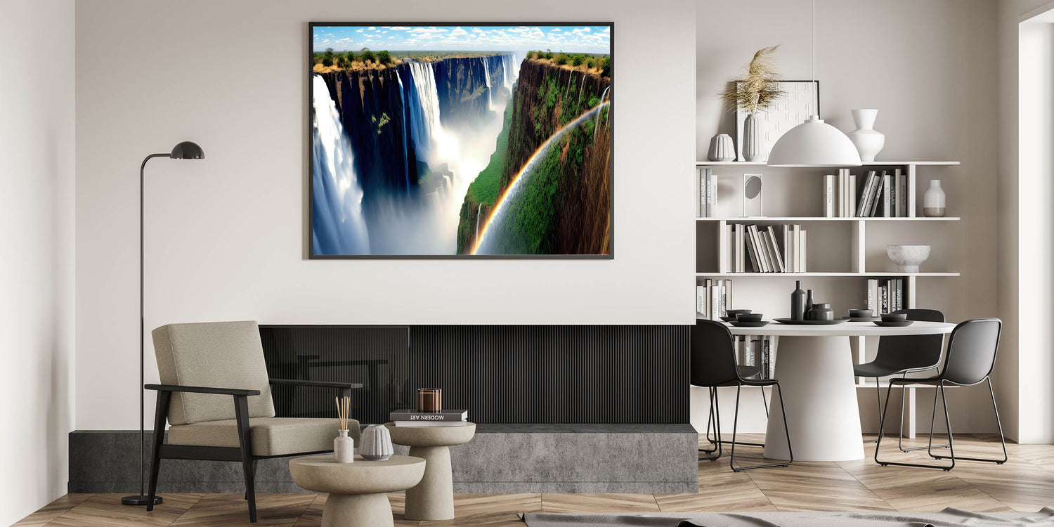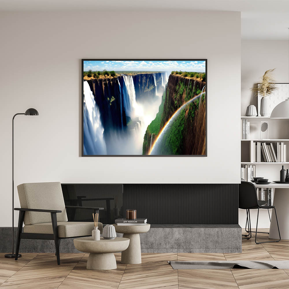 Capture the awe-inspiring beauty of Zambia’s iconic landscape with this breathtaking canvas print featuring majestic waterfalls and a vibrant rainbow arching across the mist. The cascading water, lush greenery, and deep cliffs create a mesmerizing scene that transports you to the heart of Africa's natural wonders. This Zambia landscape art is perfect for those who appreciate nature's grandeur and want to bring a touch of the outdoors into their home.
