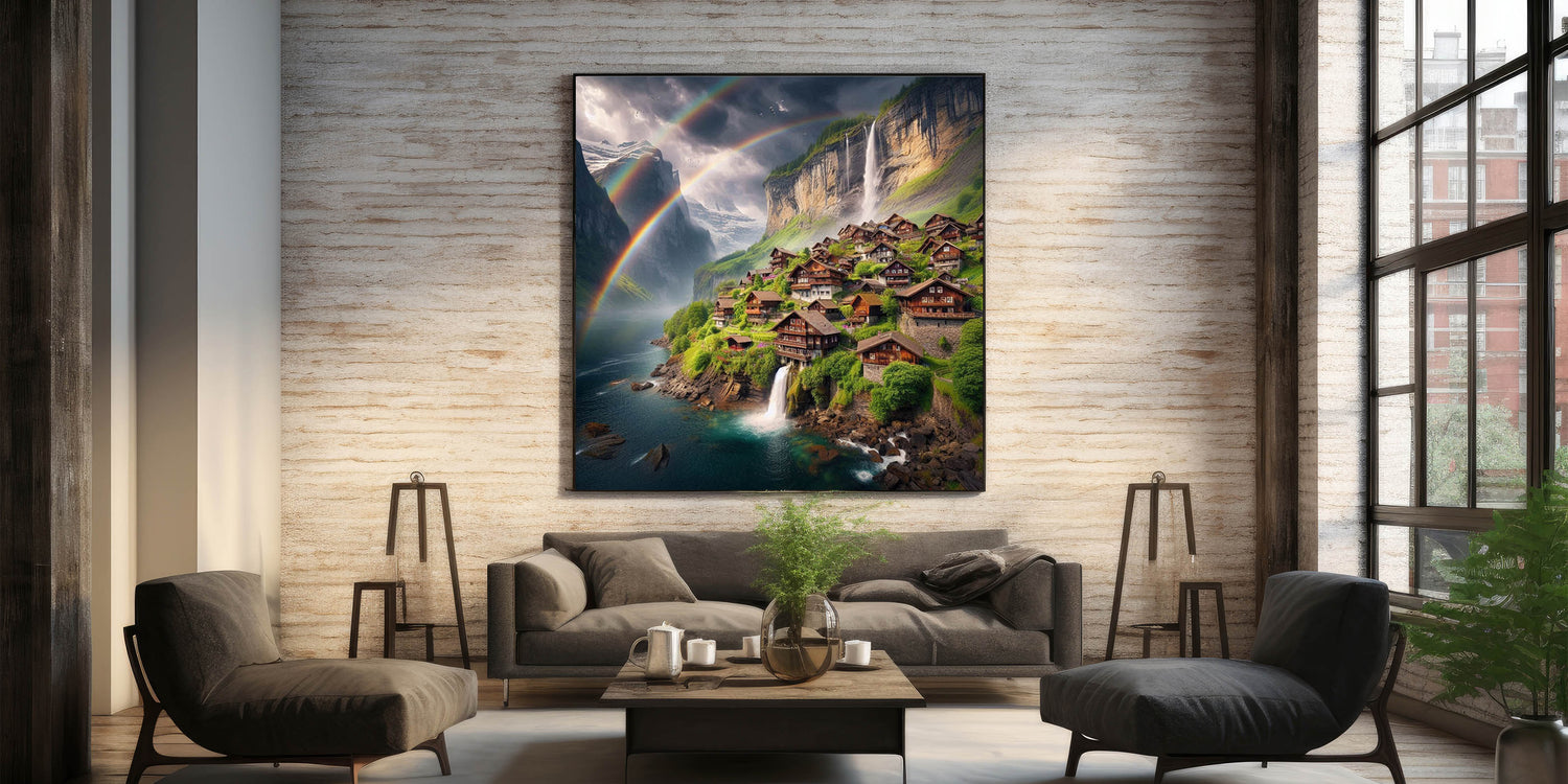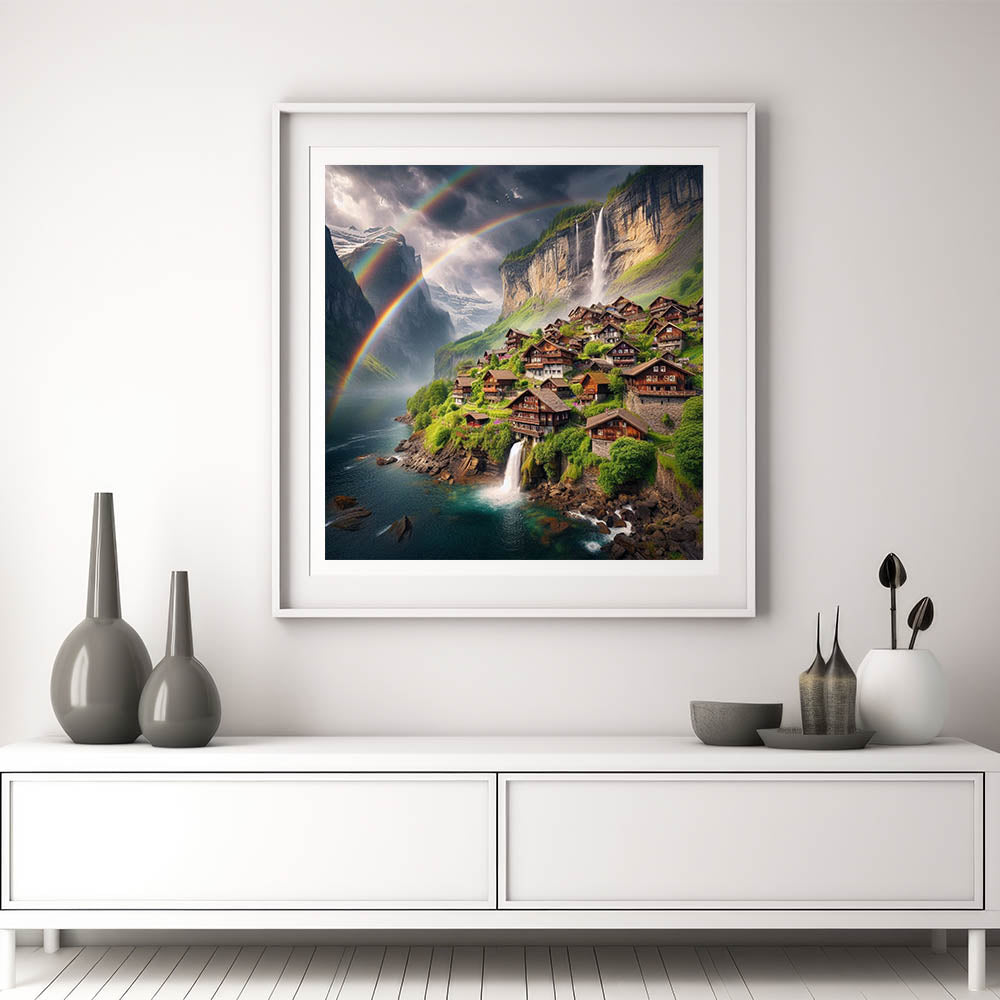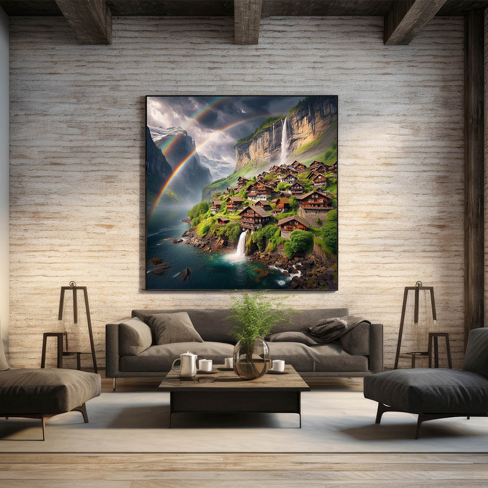 Step into a world of serene beauty with this stunning canvas print, capturing a breathtaking mountain village surrounded by cascading waterfalls and vibrant rainbows. The tranquil setting, with charming wooden houses nestled in lush greenery, creates an idyllic scene that radiates peace and wonder. This Zambia wall art brings the magic of nature and village life together, making it a perfect addition to any space in need of a touch of nature’s splendor.
