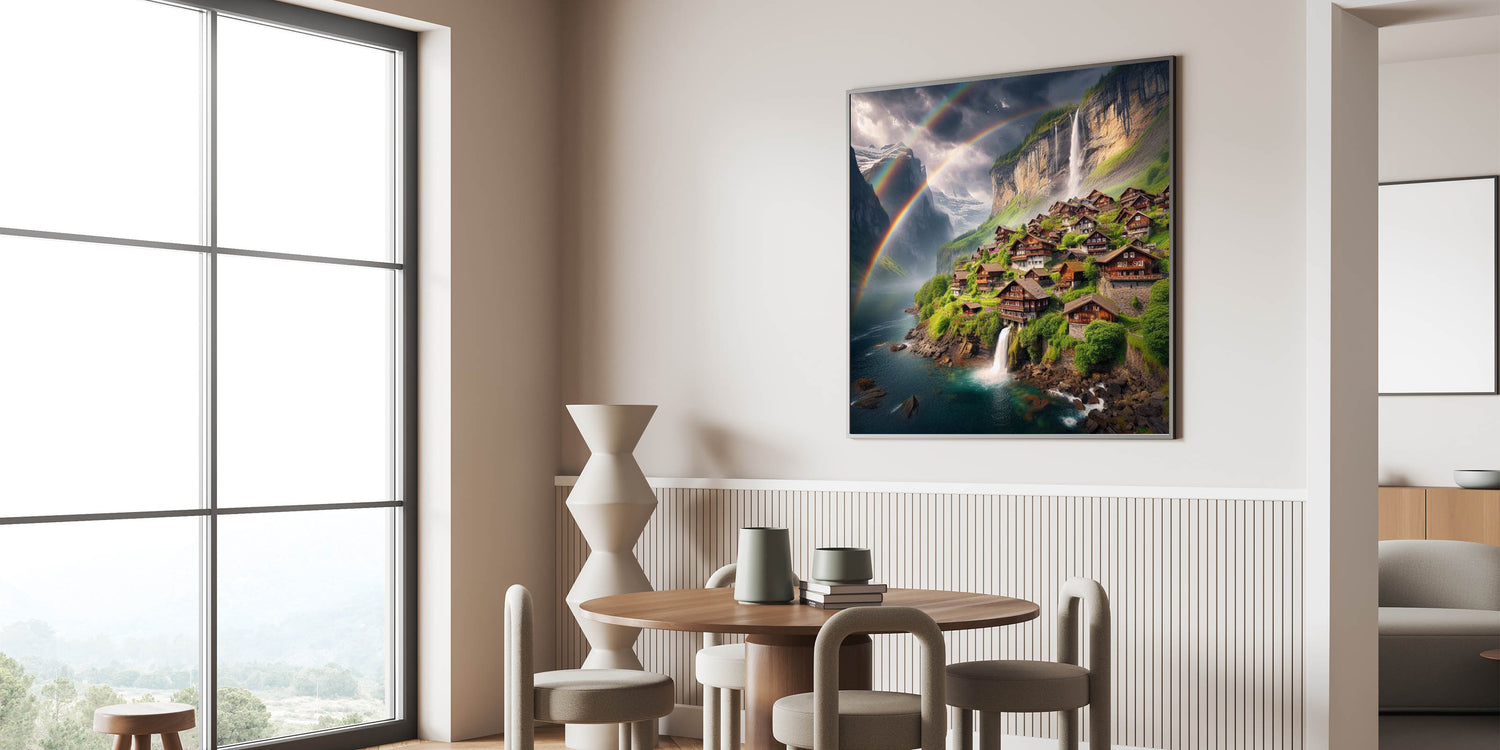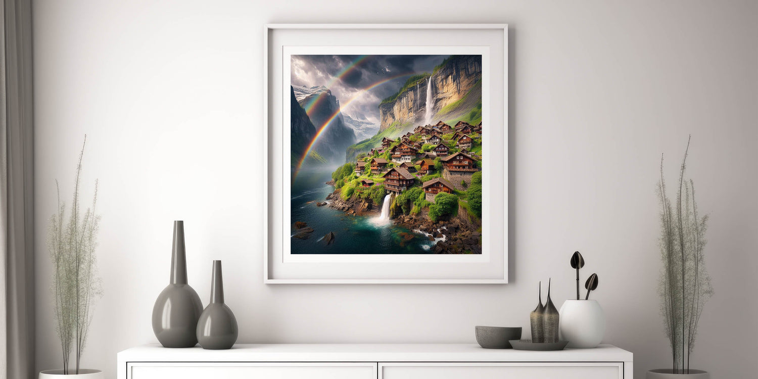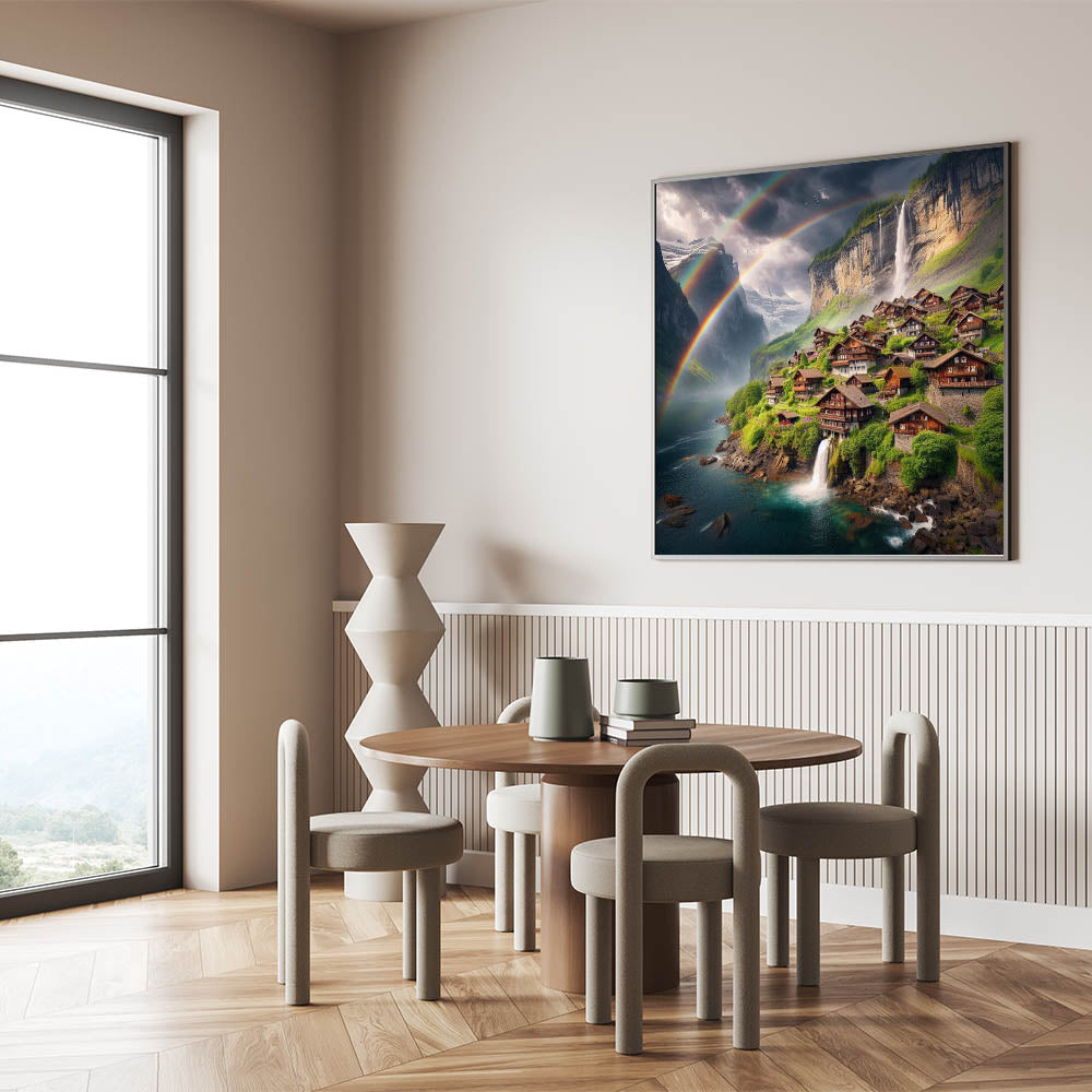 Step into a world of serene beauty with this stunning canvas print, capturing a breathtaking mountain village surrounded by cascading waterfalls and vibrant rainbows. The tranquil setting, with charming wooden houses nestled in lush greenery, creates an idyllic scene that radiates peace and wonder. This Zambia wall art brings the magic of nature and village life together, making it a perfect addition to any space in need of a touch of nature’s splendor.