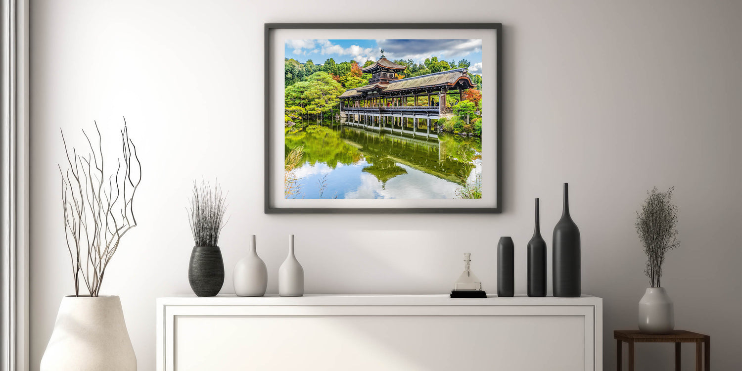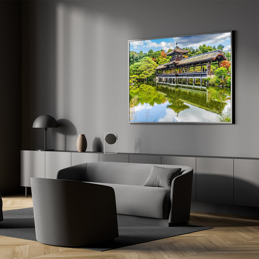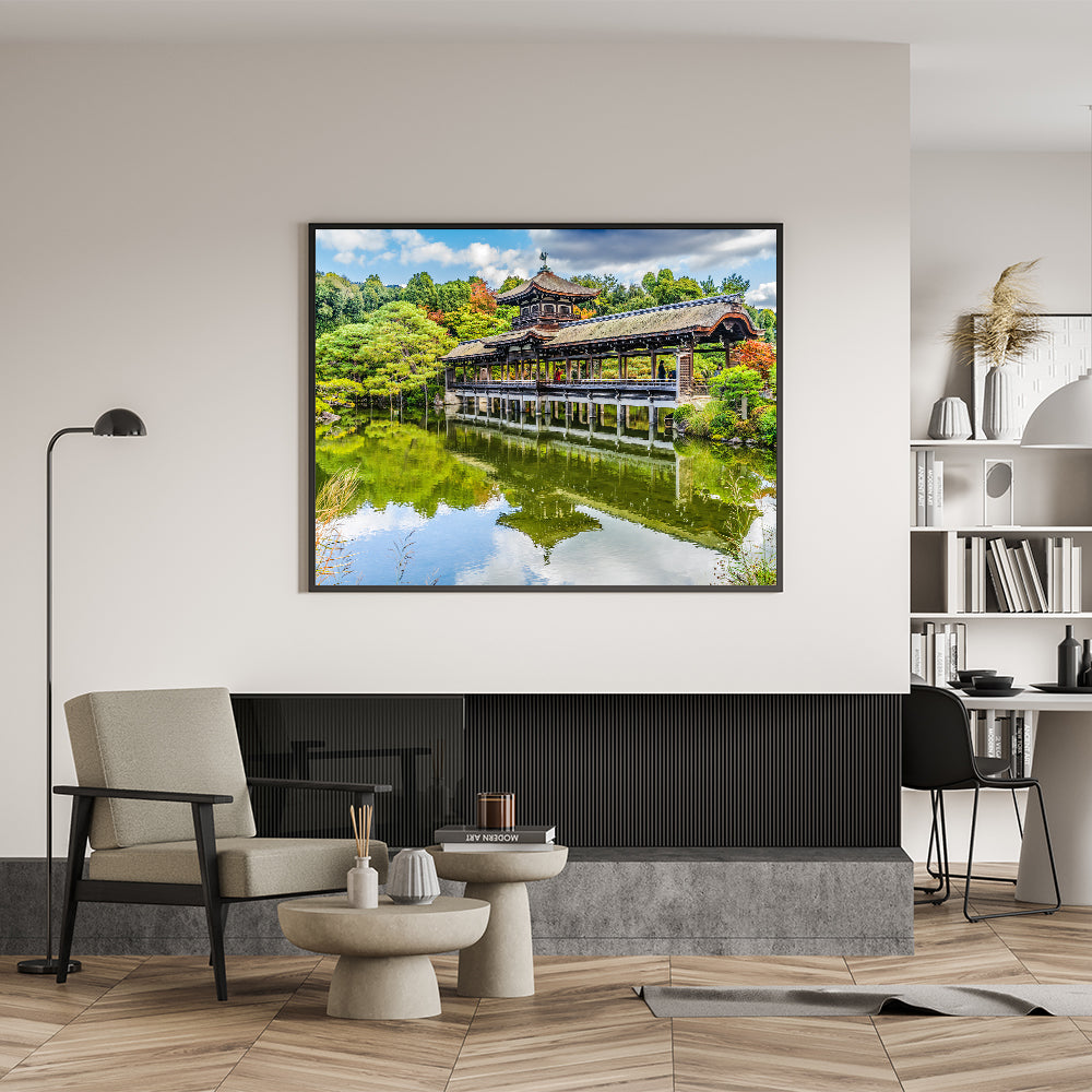 Embrace the tranquility of Japanese gardens with this stunning covered bridge wall art. The peaceful reflection of the historic bridge over the calm waters, surrounded by lush greenery and traditional architecture, creates a serene scene perfect for any space. The vibrant colors of the landscape combined with the detailed structure of the bridge bring a sense of peace and harmony, making it an ideal addition to your home or office decor. This artwork is perfect for those who appreciate nature, culture, and calming landscapes.