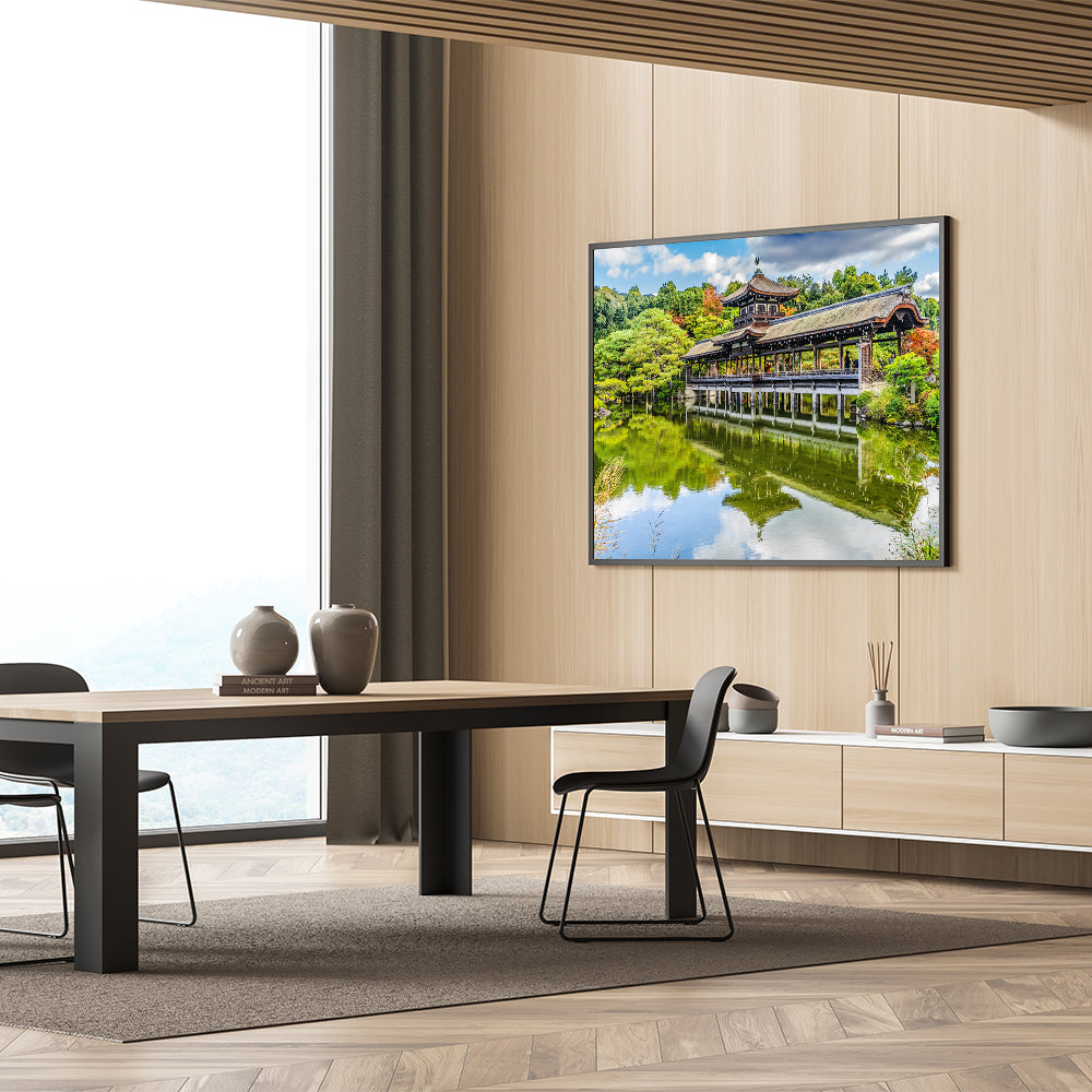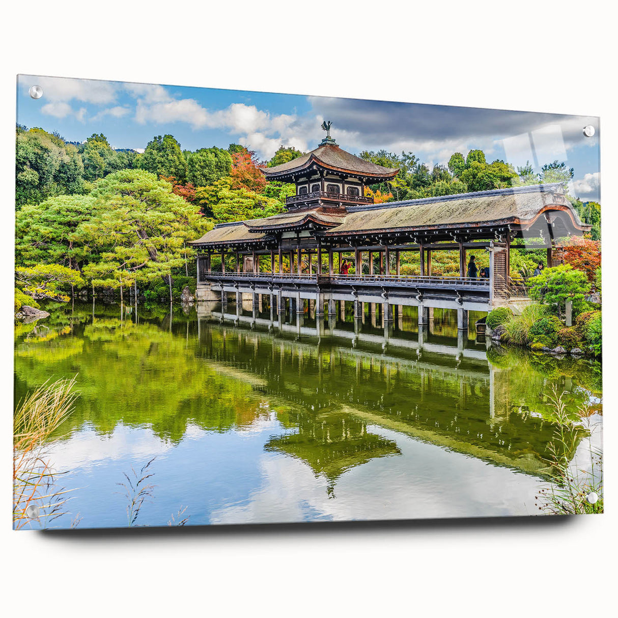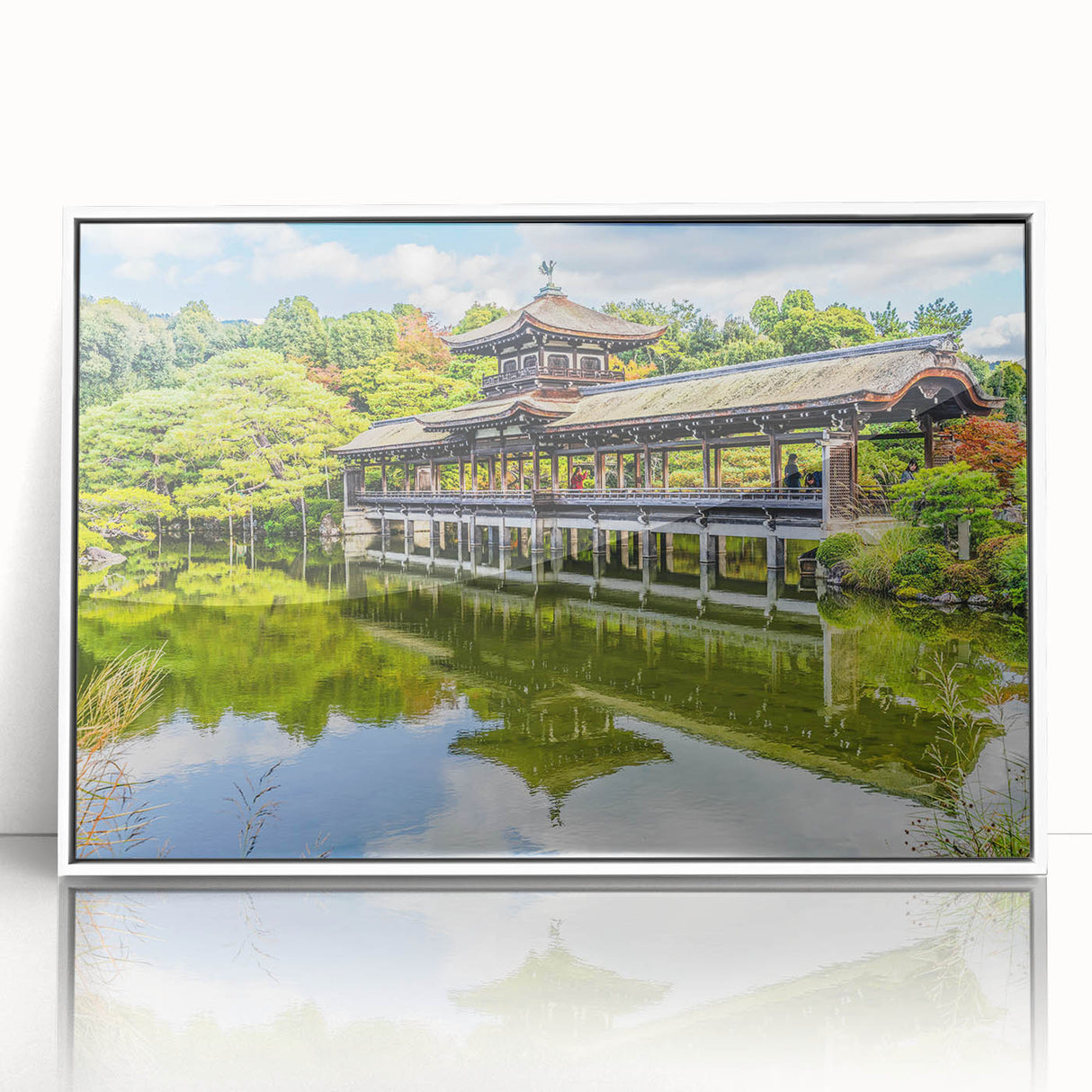 Embrace the tranquility of Japanese gardens with this stunning covered bridge wall art. The peaceful reflection of the historic bridge over the calm waters, surrounded by lush greenery and traditional architecture, creates a serene scene perfect for any space. The vibrant colors of the landscape combined with the detailed structure of the bridge bring a sense of peace and harmony, making it an ideal addition to your home or office decor. This artwork is perfect for those who appreciate nature, culture, and calming landscapes.