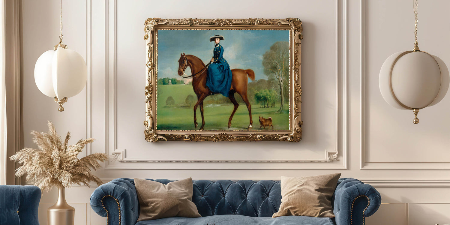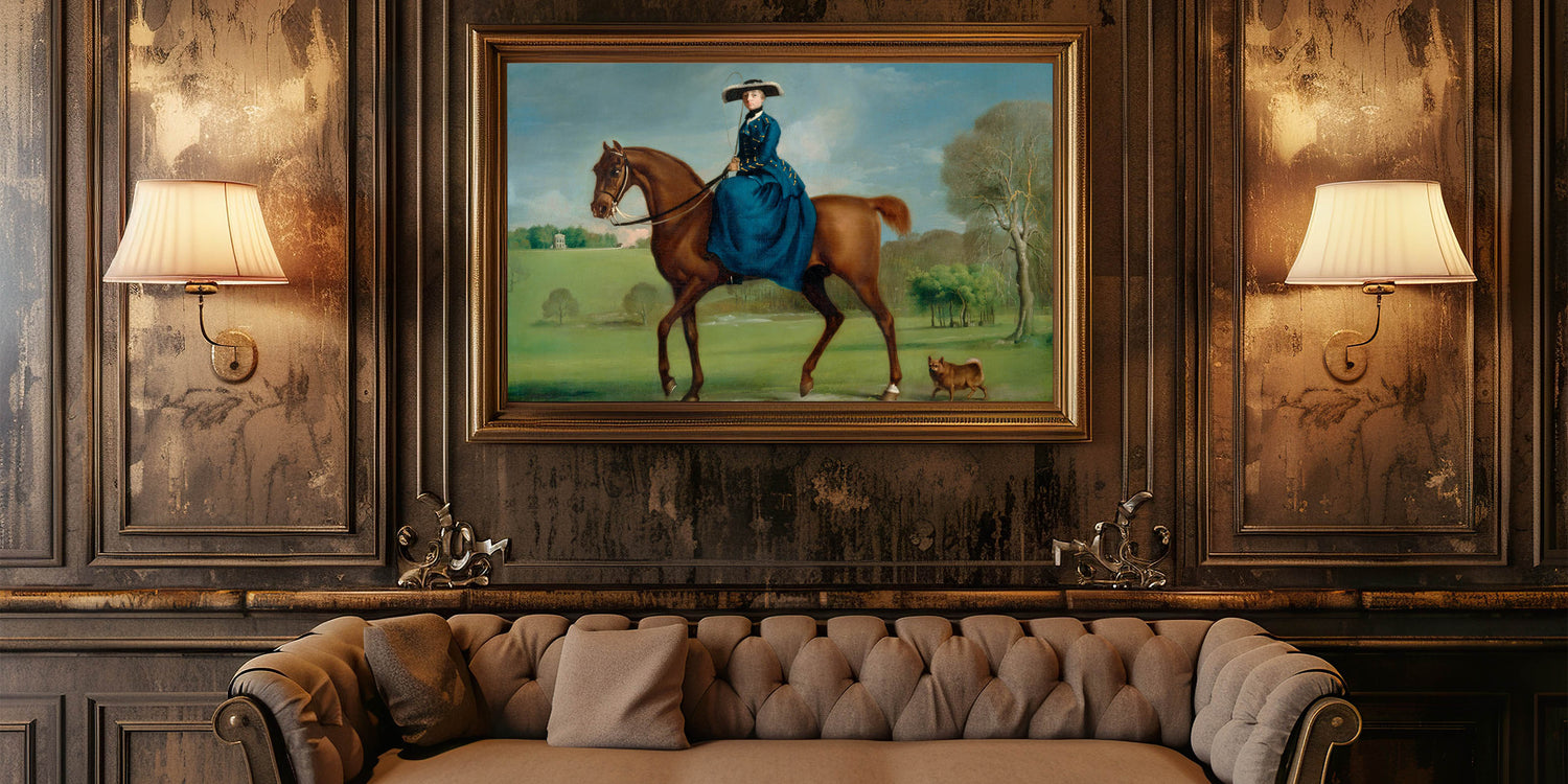 Embrace the timeless elegance of the Neoclassical period with this distinguished Countess portrait. Ideal for lovers of classic art, this piece adds depth and refinement to any room with its serene equestrian scene.