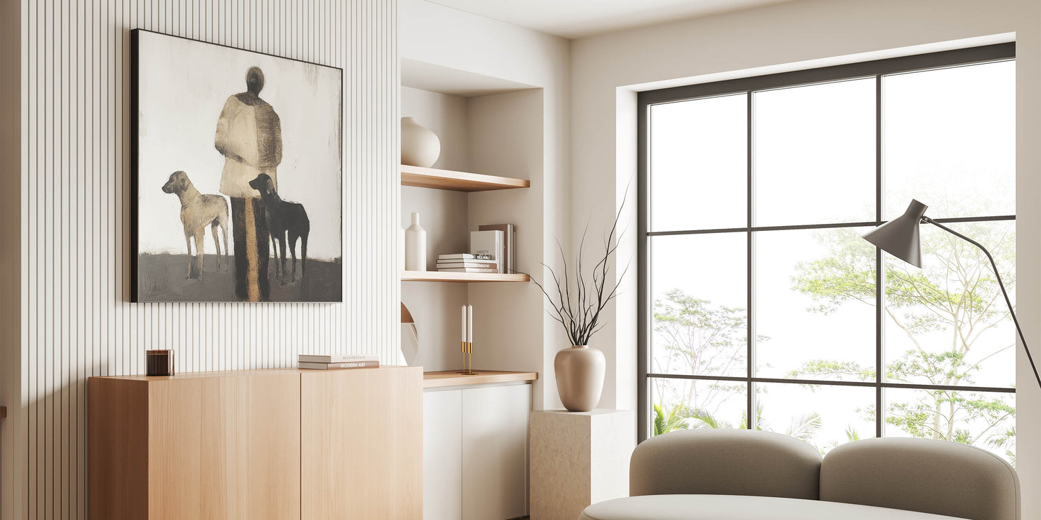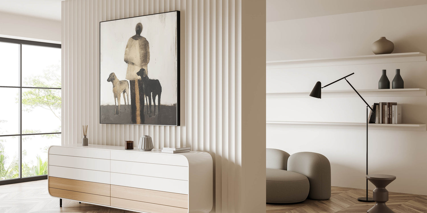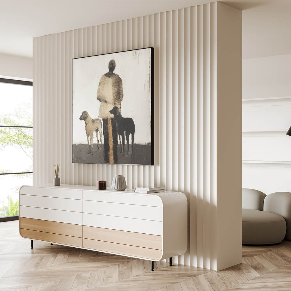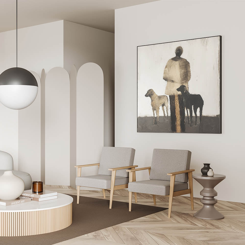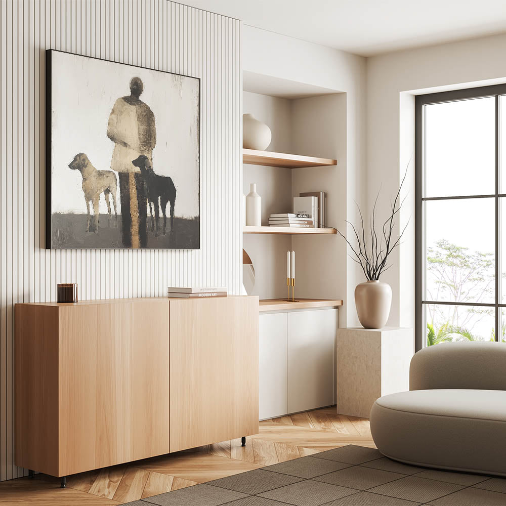 Introduce a sense of storytelling and simplicity to your space with this Abstract Figurative Canvas Art, portraying a serene scene of a human figure accompanied by two dogs. The neutral tones of black, brown, and beige create a harmonious balance, making it perfect for rustic and modern interiors alike.
