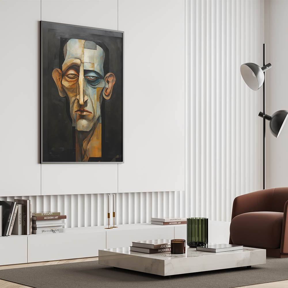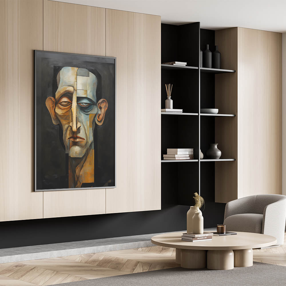 Make a bold statement with this Abstract Human Portrait Art, a modern interpretation of cubism that combines fragmented forms with earthy and muted tones. The intricate details and expressive features evoke raw emotion, making this piece an ideal centerpiece for contemporary interiors.