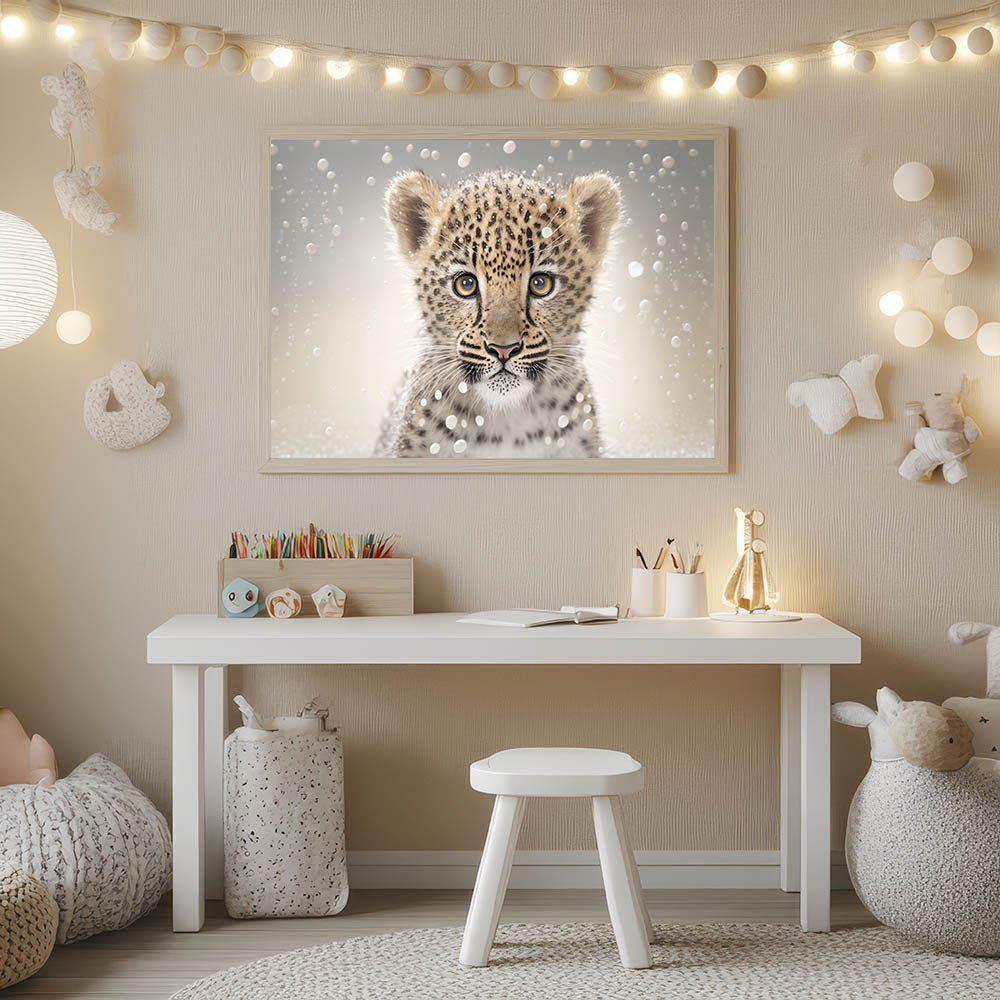 Bring the beauty of the wild into your child’s space with this stunning leopard cub wall art. Featuring a curious and wide-eyed leopard cub surrounded by soft, ethereal details, this artwork captures the essence of nature’s elegance and charm. Perfect for nurseries, playrooms, or kids’ bedrooms, this design inspires adventure and a love for wildlife.