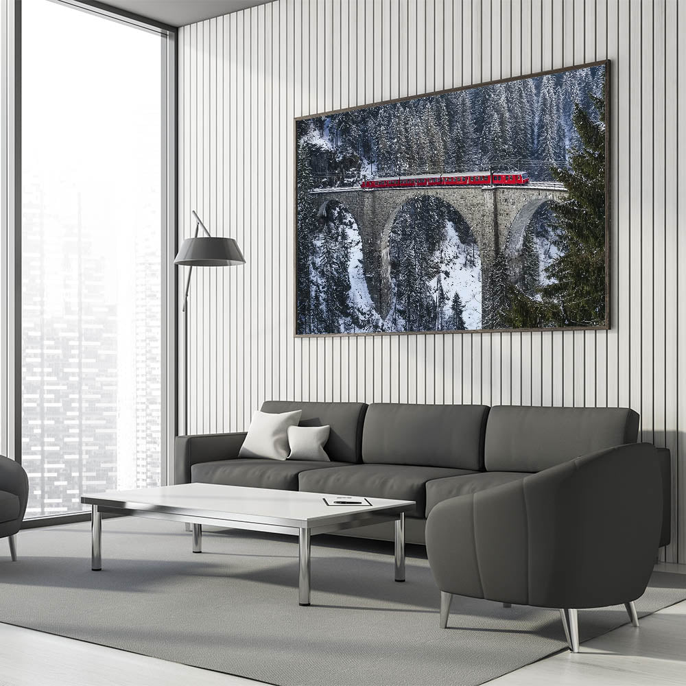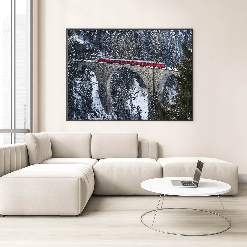 Experience the breathtaking charm of winter with this alpine train bridge artwork. Featuring a vibrant red train crossing a majestic stone bridge surrounded by snow-covered trees and rugged mountain terrain, this piece captures the magic of a winter journey through the Alps. The contrast of the bright red train against the snowy landscape adds a bold and dynamic touch, making it a striking addition to your home or office decor.