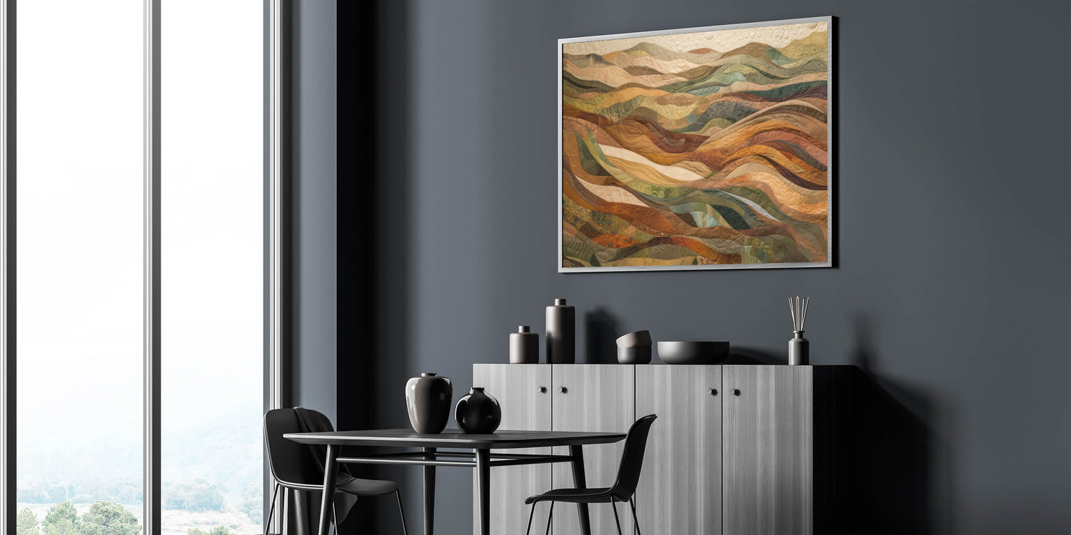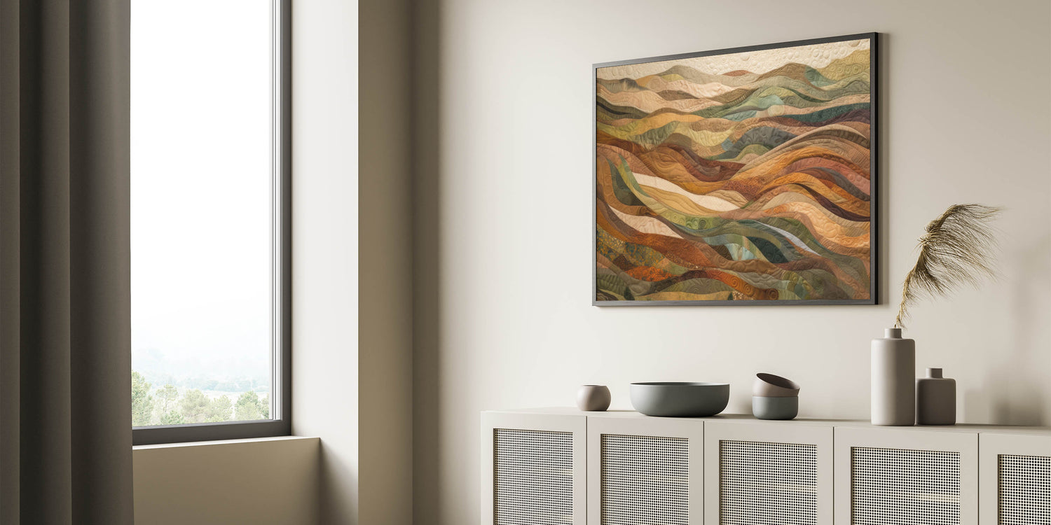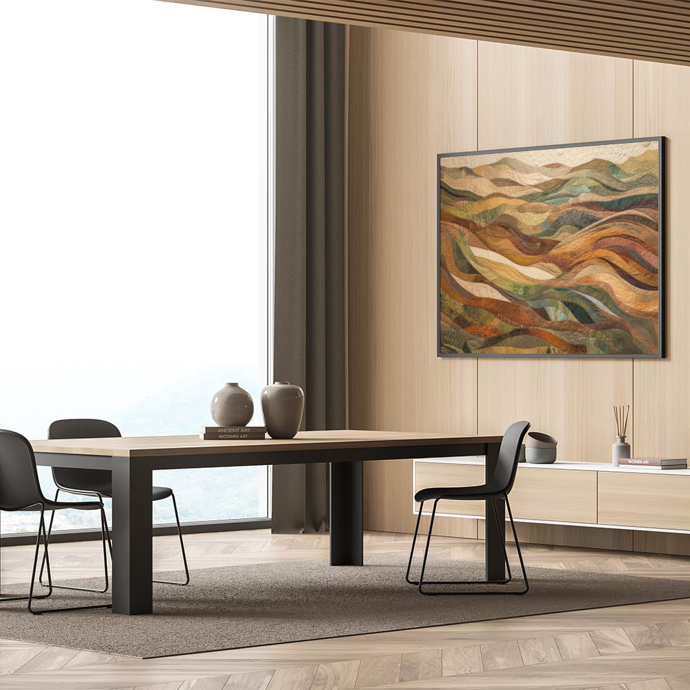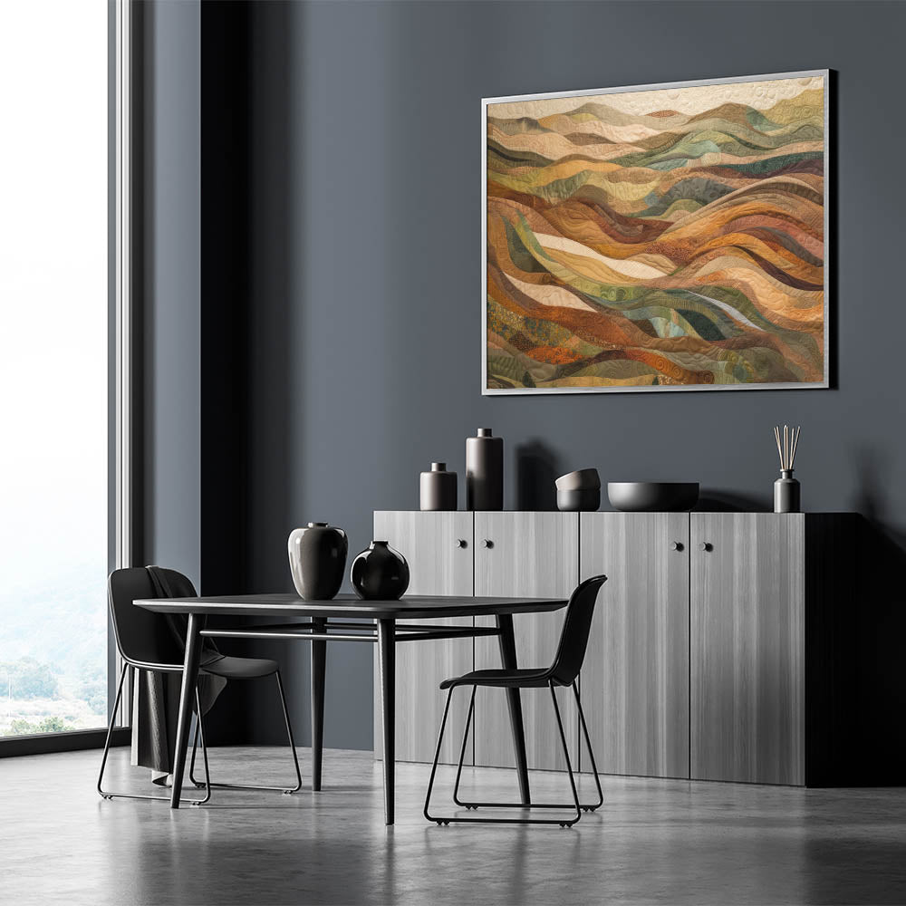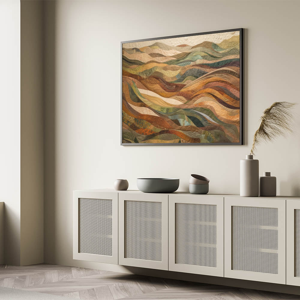 Transform your space with the serene beauty of this abstract fall landscape wall art. The flowing hills, rendered in quilted textures and earthy tones, capture the essence of the autumn season. Shades of brown, beige, olive green, and muted orange create a harmonious palette that brings warmth and tranquility to any room. This unique design offers a blend of modern abstraction and rustic charm, perfect for those who appreciate nature-inspired art.