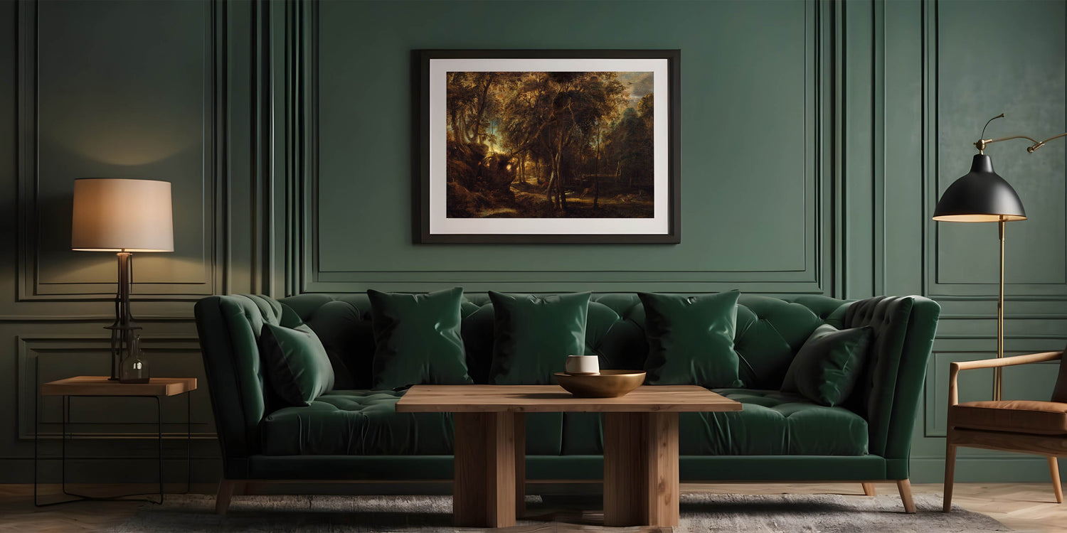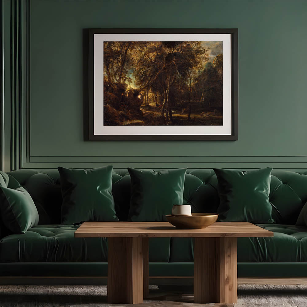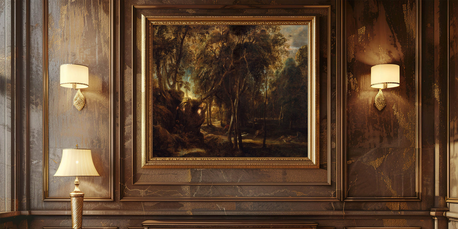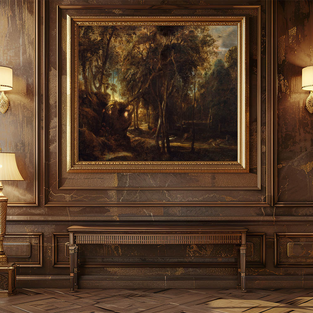 Immerse yourself in the enchanting allure of Baroque artistry with this mesmerizing forest scene. This artwork portrays a richly detailed woodland landscape illuminated by soft golden hues and intricate shadows, embodying the refined elegance of Rococo style. The dynamic composition of trees, light, and subtle wildlife creates an atmosphere of mystery and timeless beauty.
