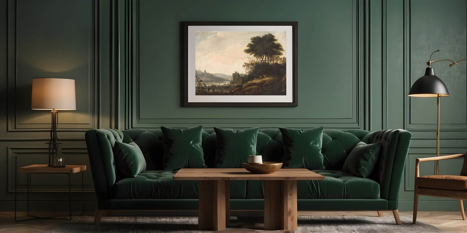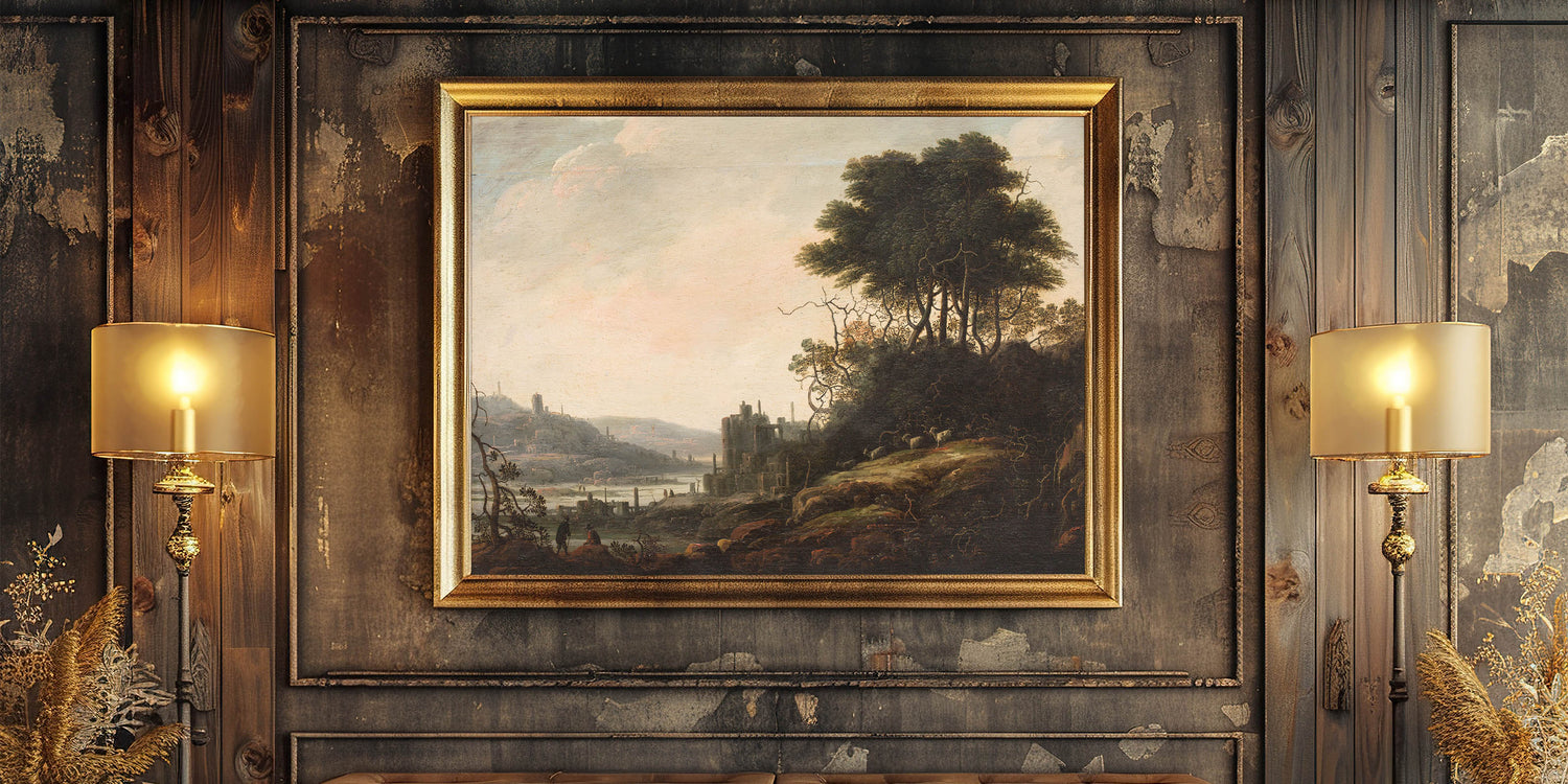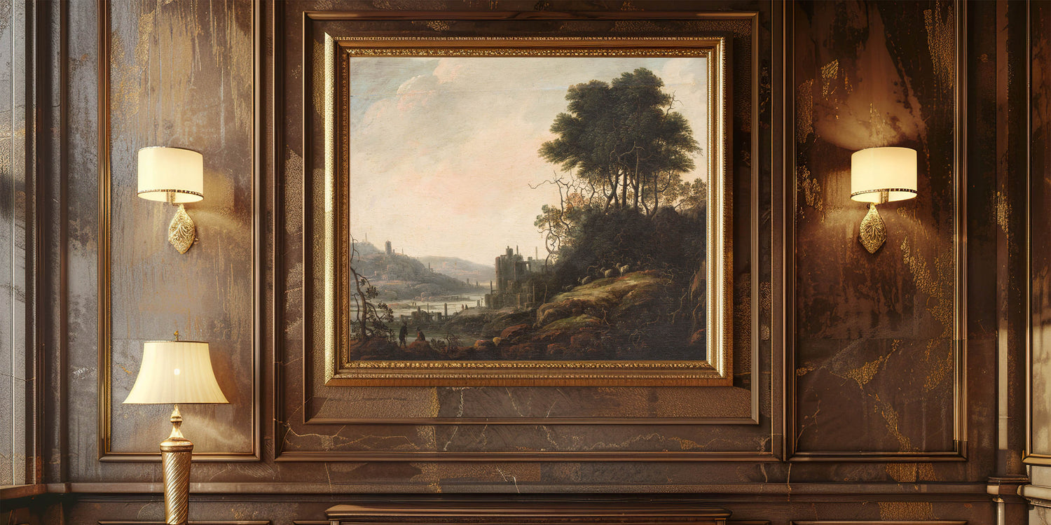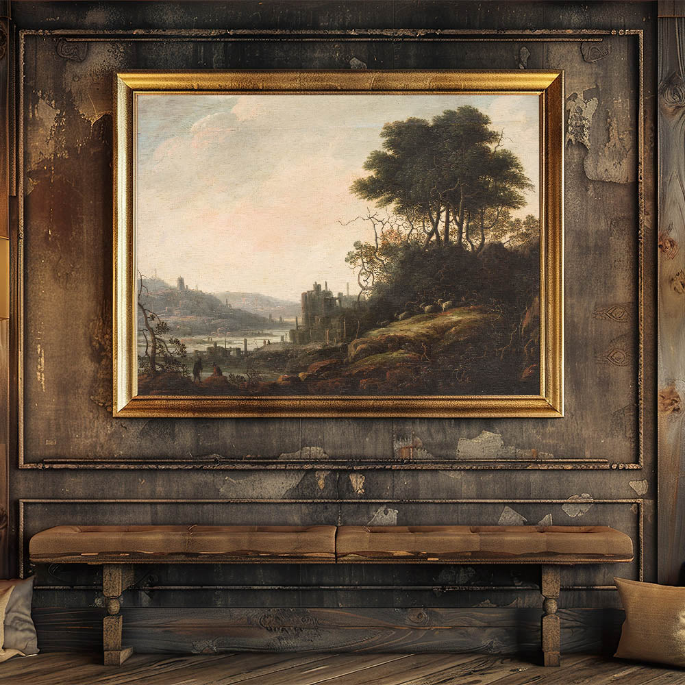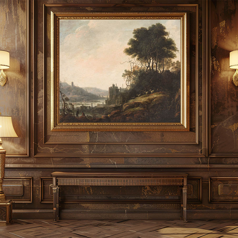 Experience the beauty of Baroque and Rococo wall art with this stunning landscape featuring ancient ruins and nature's elegance. A timeless masterpiece, this artwork captures the essence of historical charm, making it a perfect addition to your home décor. The detailed Baroque designs highlight the natural scenery with soft light, textured trees, and peaceful rolling hills, reflecting period art collections at their finest. This art is ideal for creating a serene yet sophisticated atmosphere.