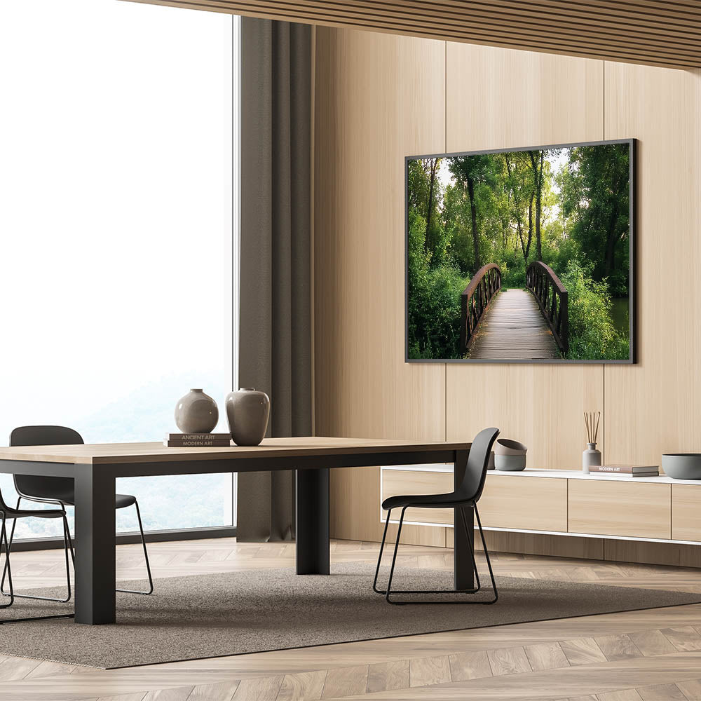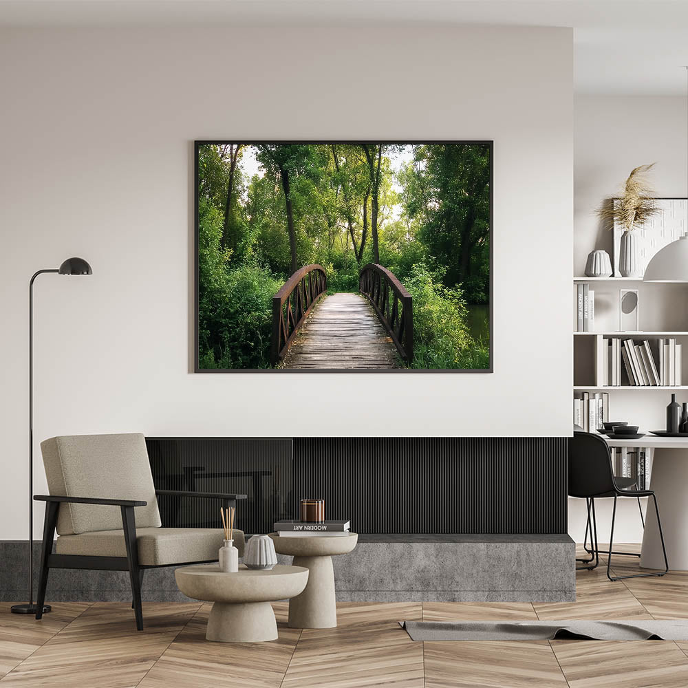 Step into the serenity of nature with this exquisite bridge painting. This artwork features a charming wooden bridge set amidst a lush forest, dappled with sunlight filtering through vibrant green foliage. The scene exudes calmness and connection to the natural world, making it an ideal addition to modern, rustic, or nature-inspired interiors. This bridge artwork beautifully captures the harmony of architectural simplicity and the tranquil beauty of the forest.