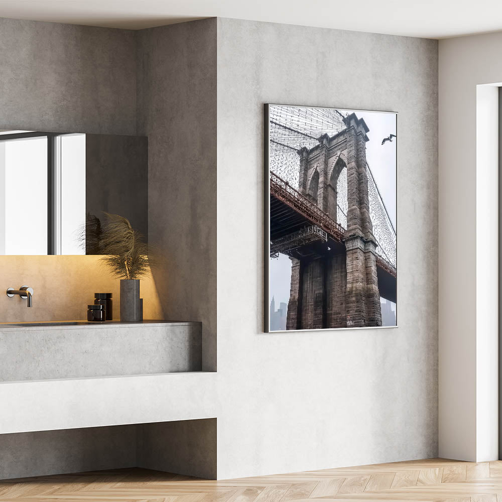 Celebrate the timeless elegance of the Brooklyn Bridge with this decorative bridge wall art. Featuring a close-up view of its intricate stonework and suspension cables, this artwork captures the bridge’s iconic design and historical significance. The muted cityscape in the background adds depth and a touch of modern urban charm, making it a versatile piece for any decor.