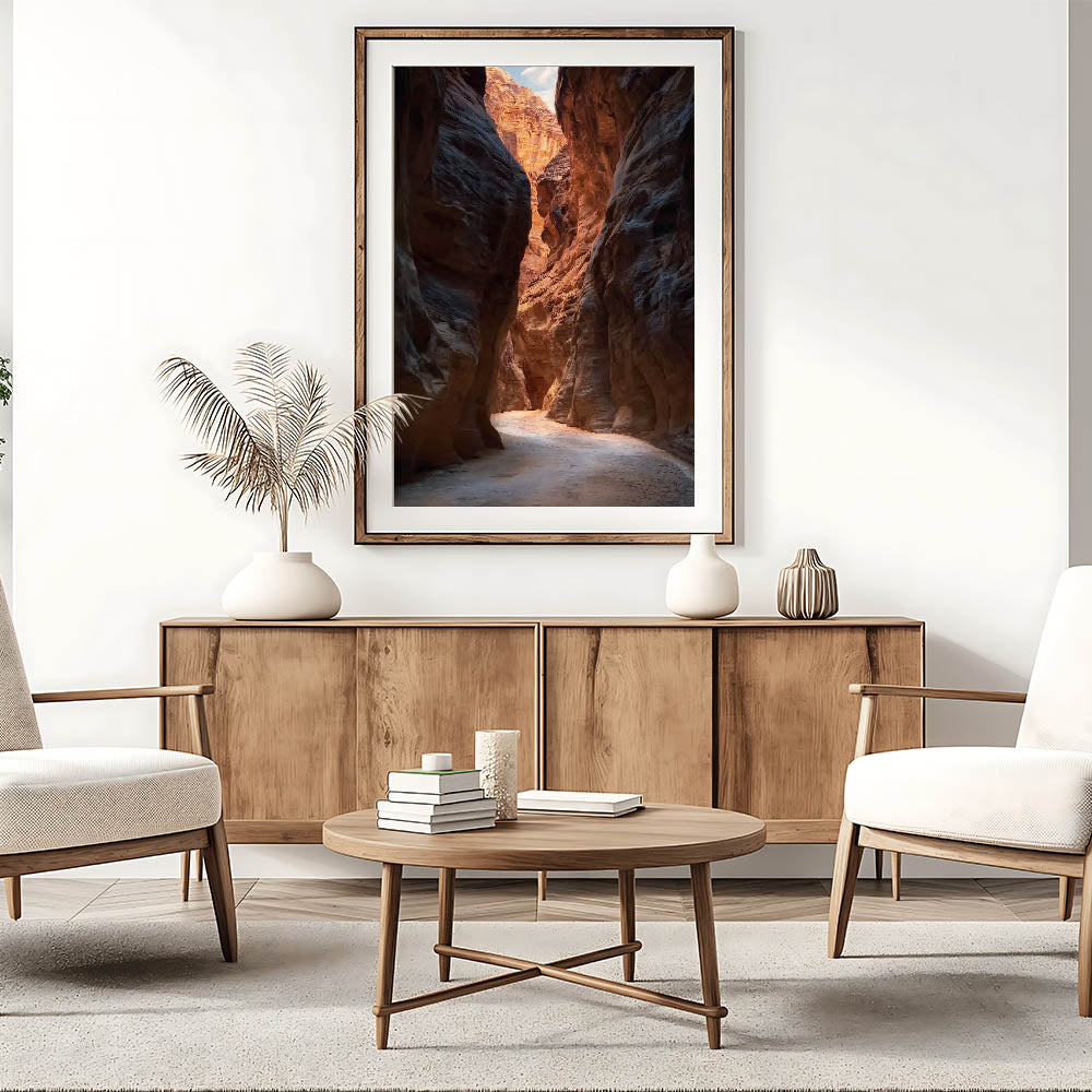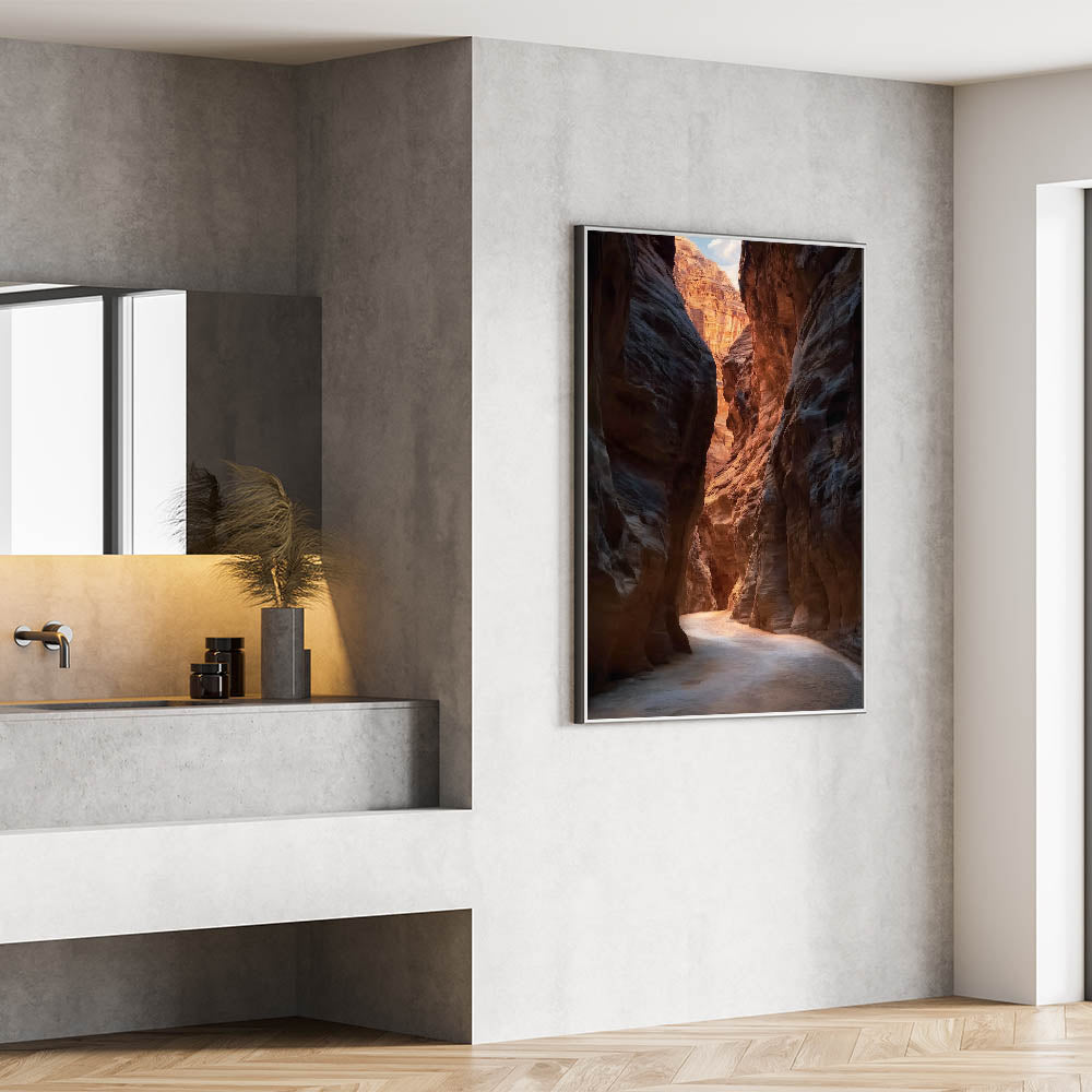 Transform your space with this captivating cave wall art, showcasing a radiant canyon passage illuminated by warm sunlight. The intricate rock formations and soft, glowing textures create a harmonious blend of earthy tones, making this piece a stunning addition to any home or office decor. Perfect for nature enthusiasts, this artwork captures the serene beauty of sandstone canyons.