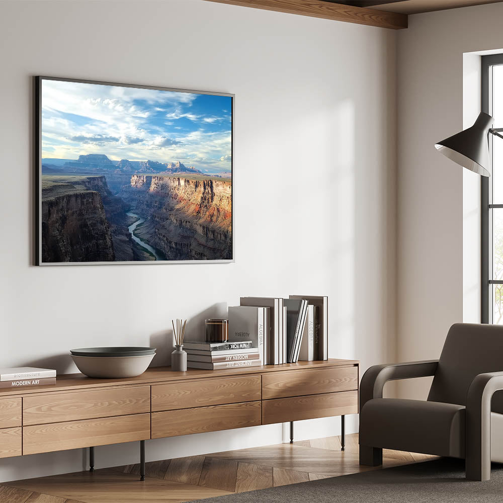 Discover the breathtaking beauty of nature with this Canyon Vista Art. This stunning artwork captures the majestic expanse of the Grand Canyon, highlighting its dramatic cliffs and the winding river below. The vibrant blue sky with scattered clouds adds a sense of serenity, perfectly complementing the rich earthy tones of the canyon. Ideal for living rooms, bedrooms, or offices, this piece transforms any space into a sanctuary of natural beauty.