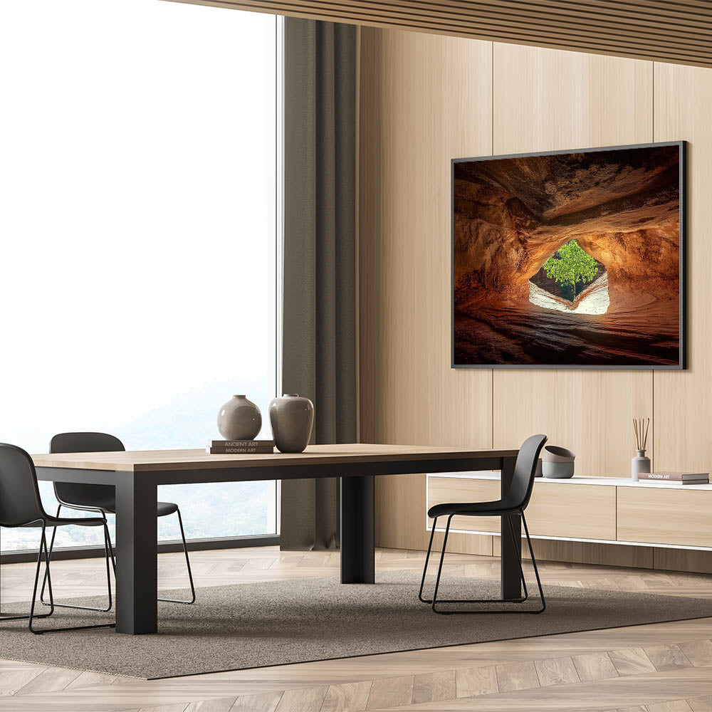 Bring the beauty of nature into your home with this captivating cave view wall art. This high-resolution photograph captures the serene elegance of a vibrant green tree framed perfectly by the natural contours of a cave opening. The rich, warm tones of the cave walls contrast beautifully with the lush greenery outside, creating a harmonious and tranquil scene. Perfect for nature enthusiasts and decor lovers alike, this artwork adds depth and inspiration to any space.