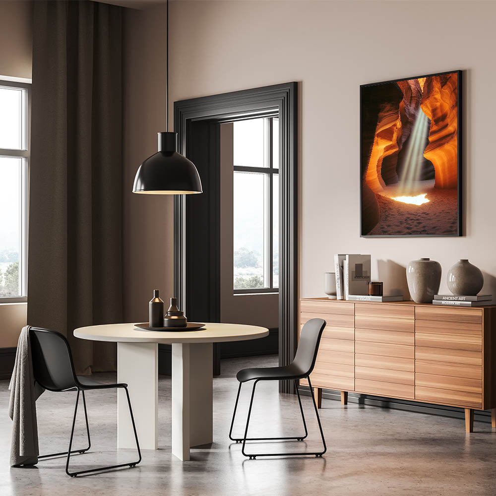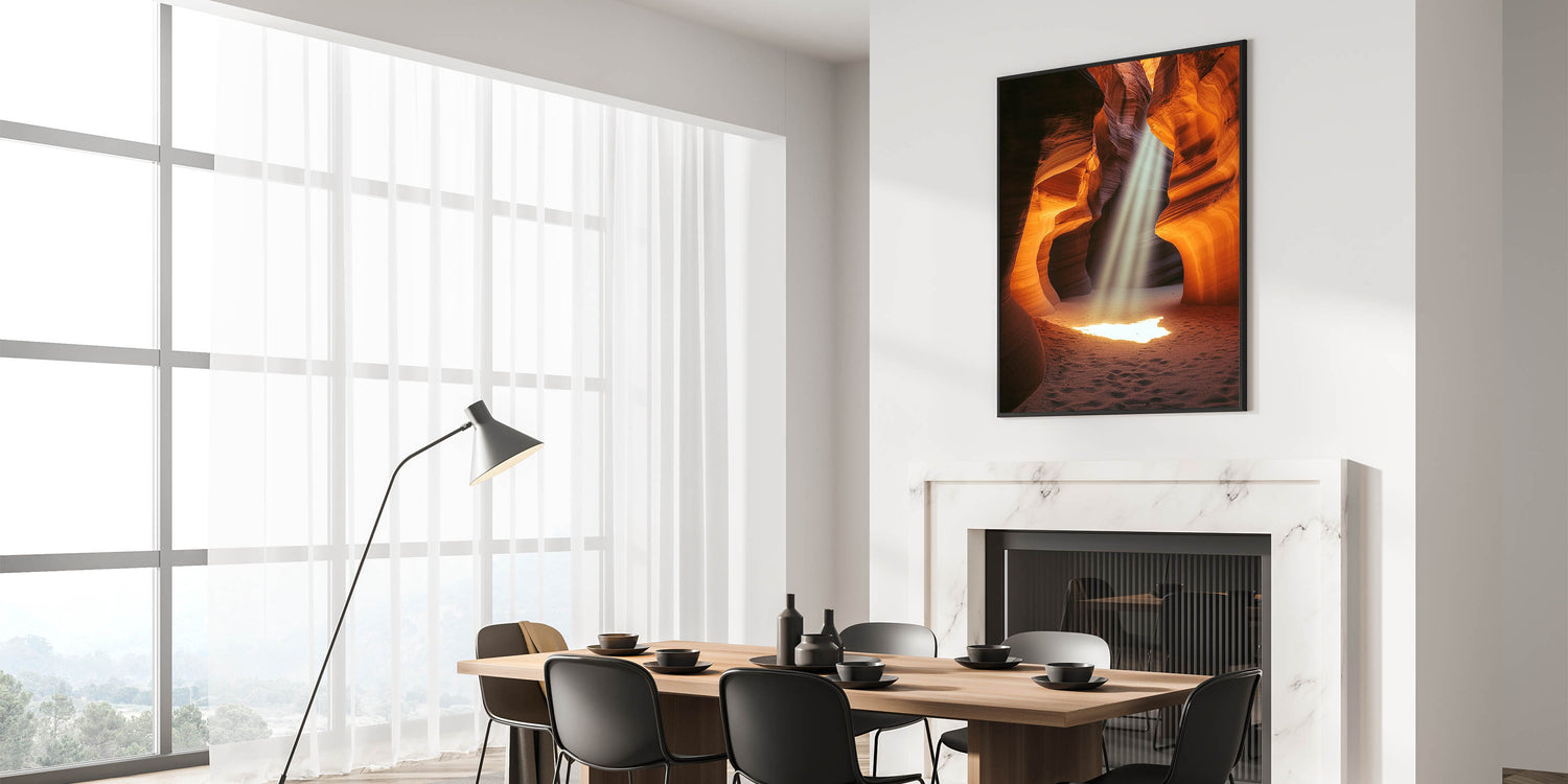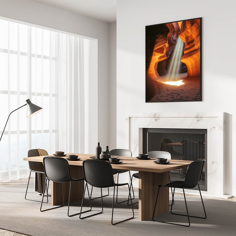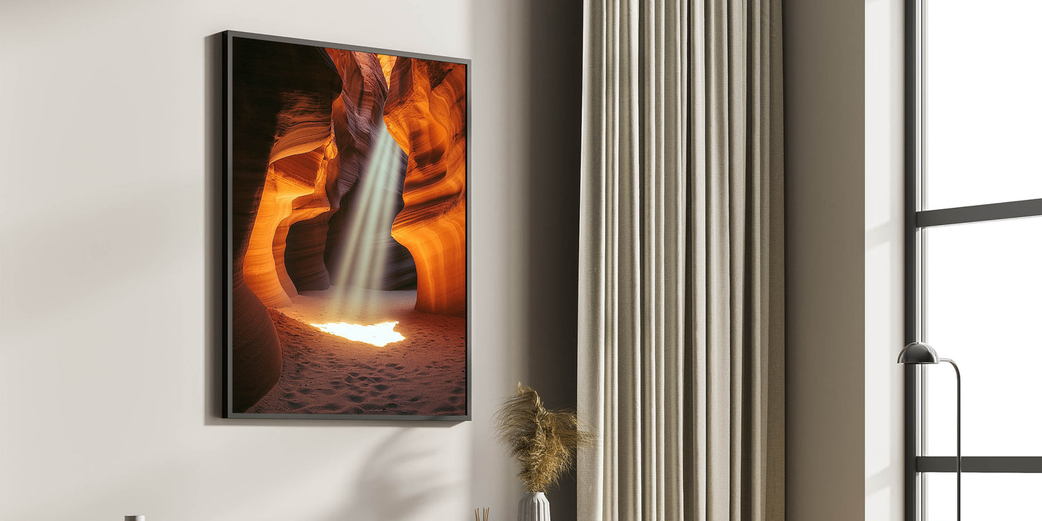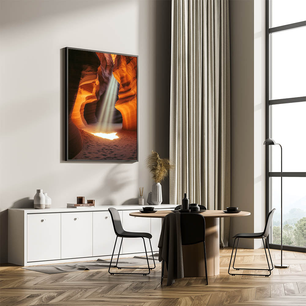 Immerse yourself in the awe-inspiring beauty of nature with this exquisite cave wall art. Capturing a stunning underground cave scene illuminated by a radiant beam of sunlight, this piece showcases the intricate textures and warm hues of sandstone formations. Perfect for creating a tranquil and captivating focal point in any room, this artwork is a must-have for nature lovers and decor enthusiasts alike.