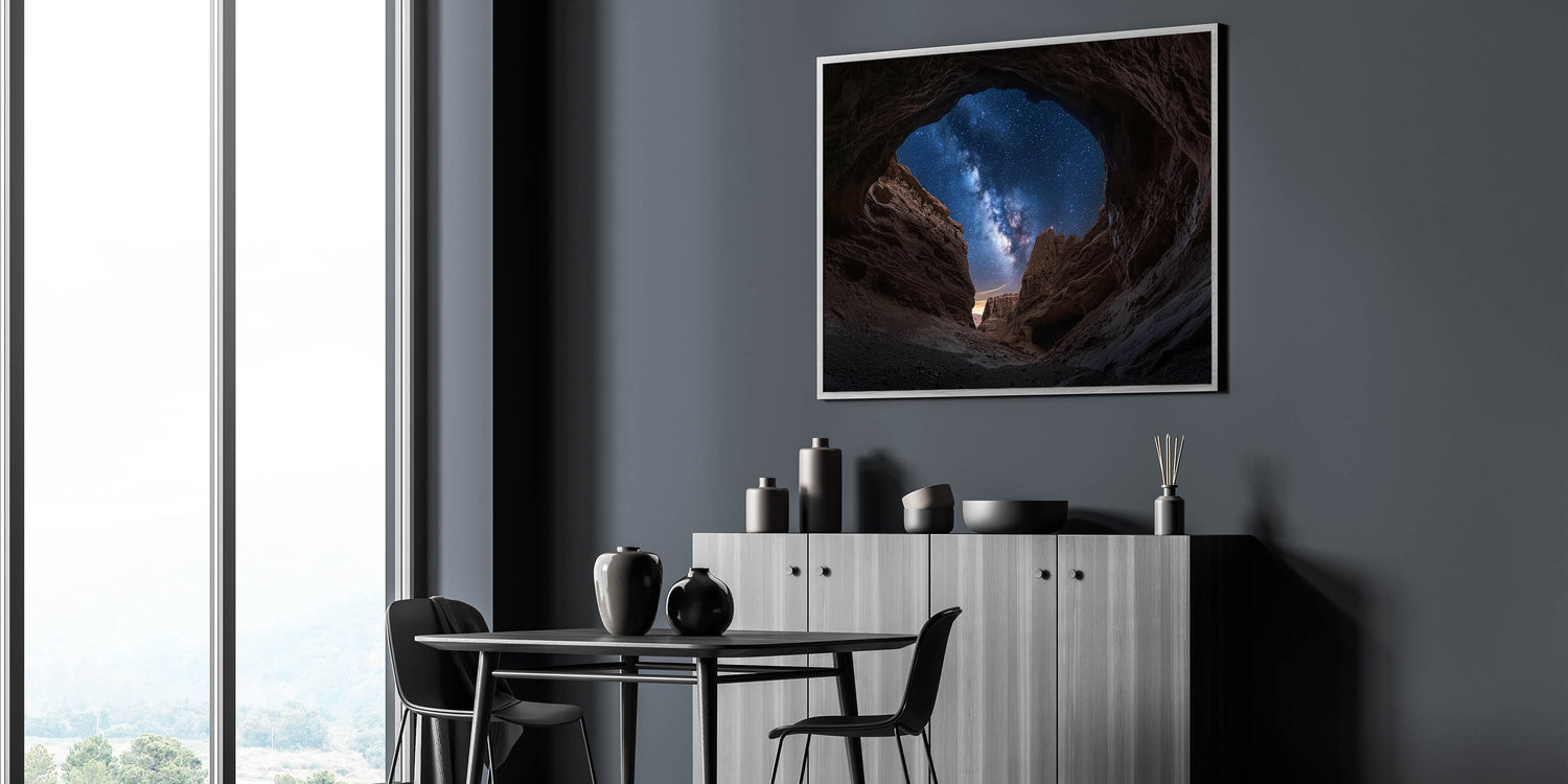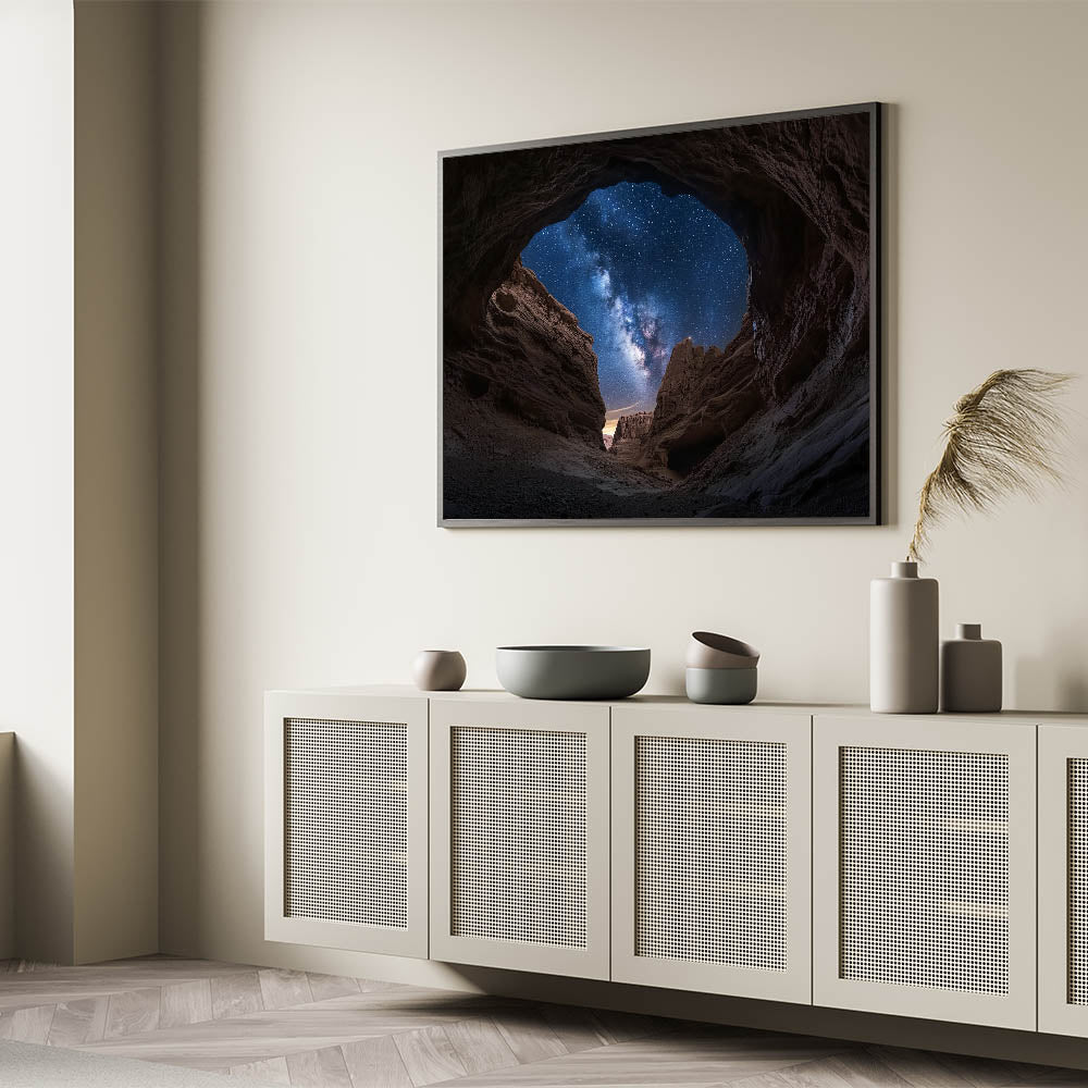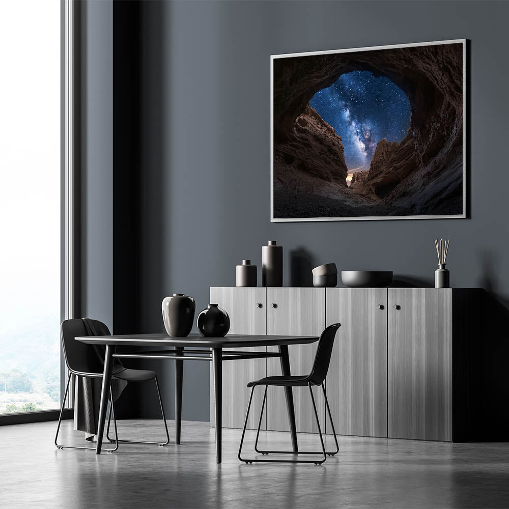 Bring a sense of wonder and tranquility to your decor with this celestial canyon piece. Perfect for stargazers and nature lovers alike, it combines the grandeur of Earth and the vastness of space into a single captivating design. Explore our collection today to transform your space with cosmic elegance.
