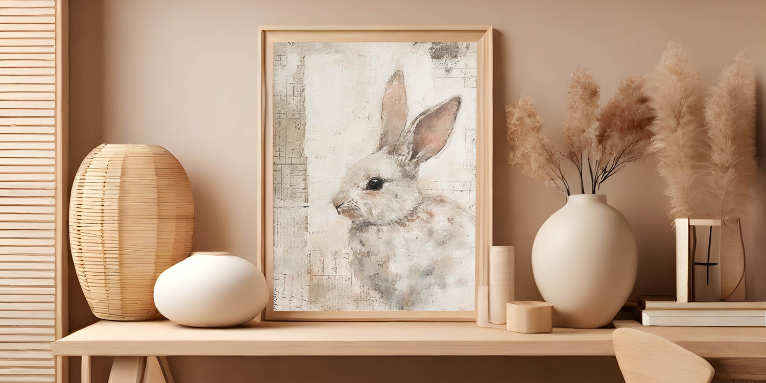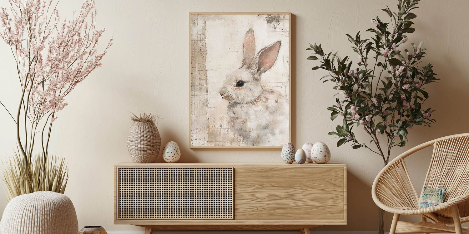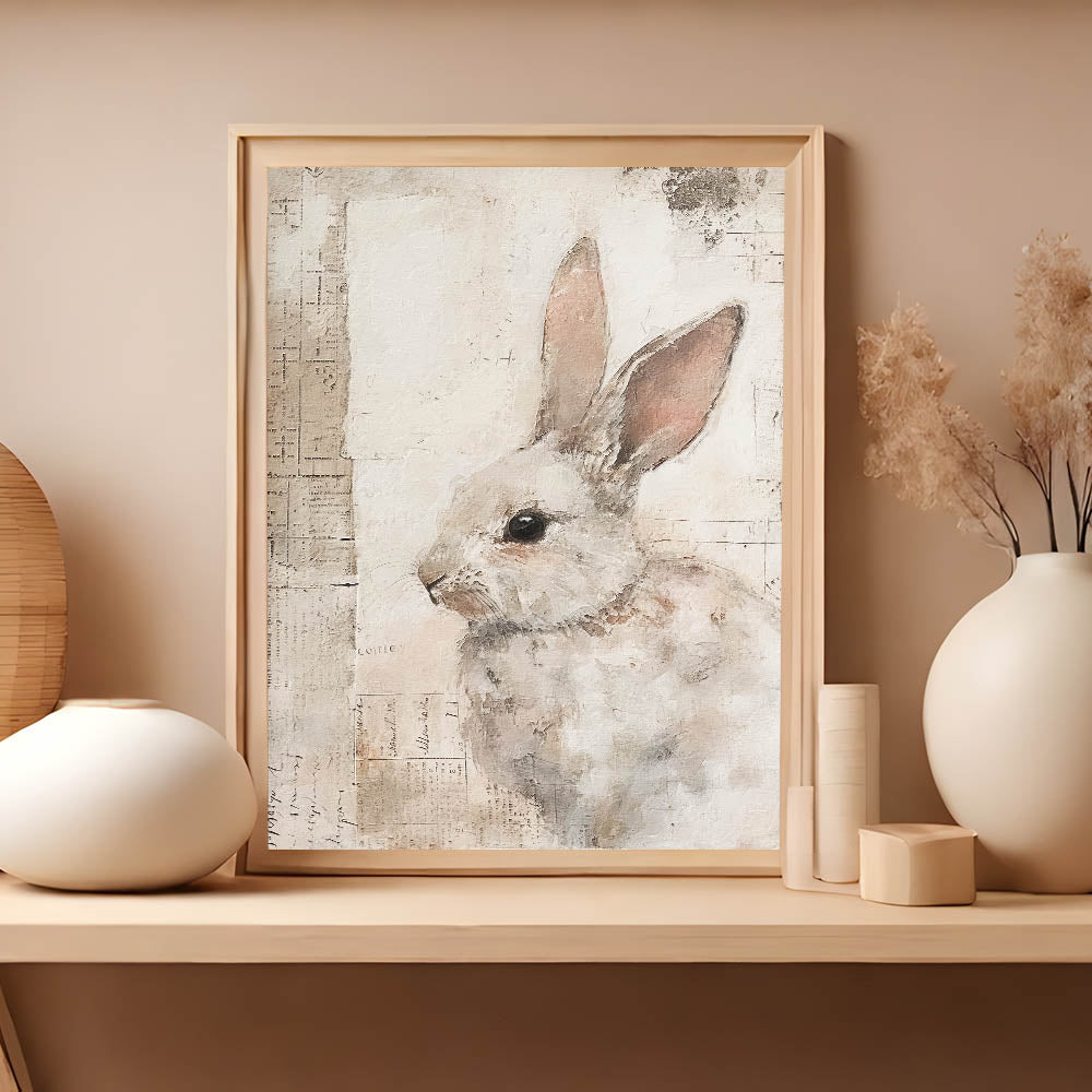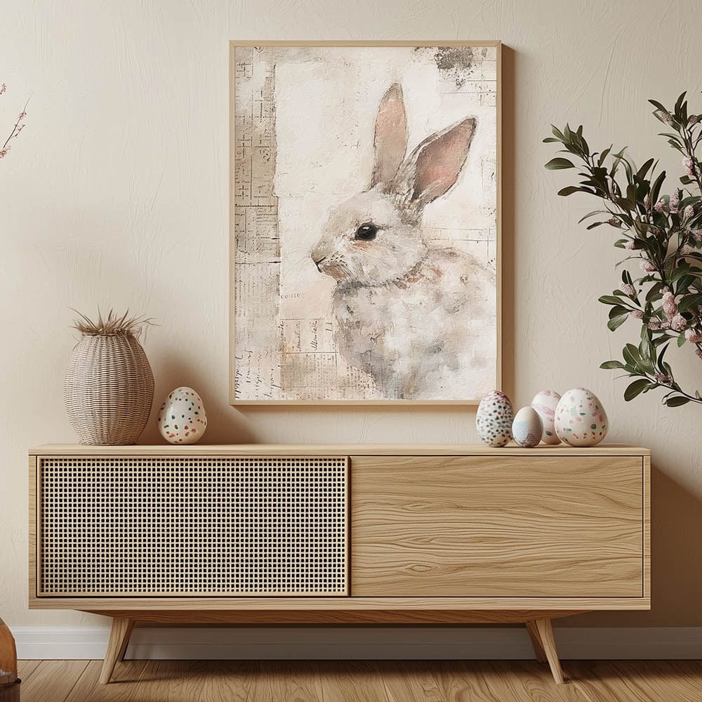 Bring the gentle spirit of spring into your home with this delightful Easter wall art, featuring a charming bunny. The design showcases the bunny’s delicate features against a textured, vintage-inspired background in soft beige and light brown tones. The intricate script details add a nostalgic touch, making this Easter canvas print a timeless piece for your seasonal decorations.
