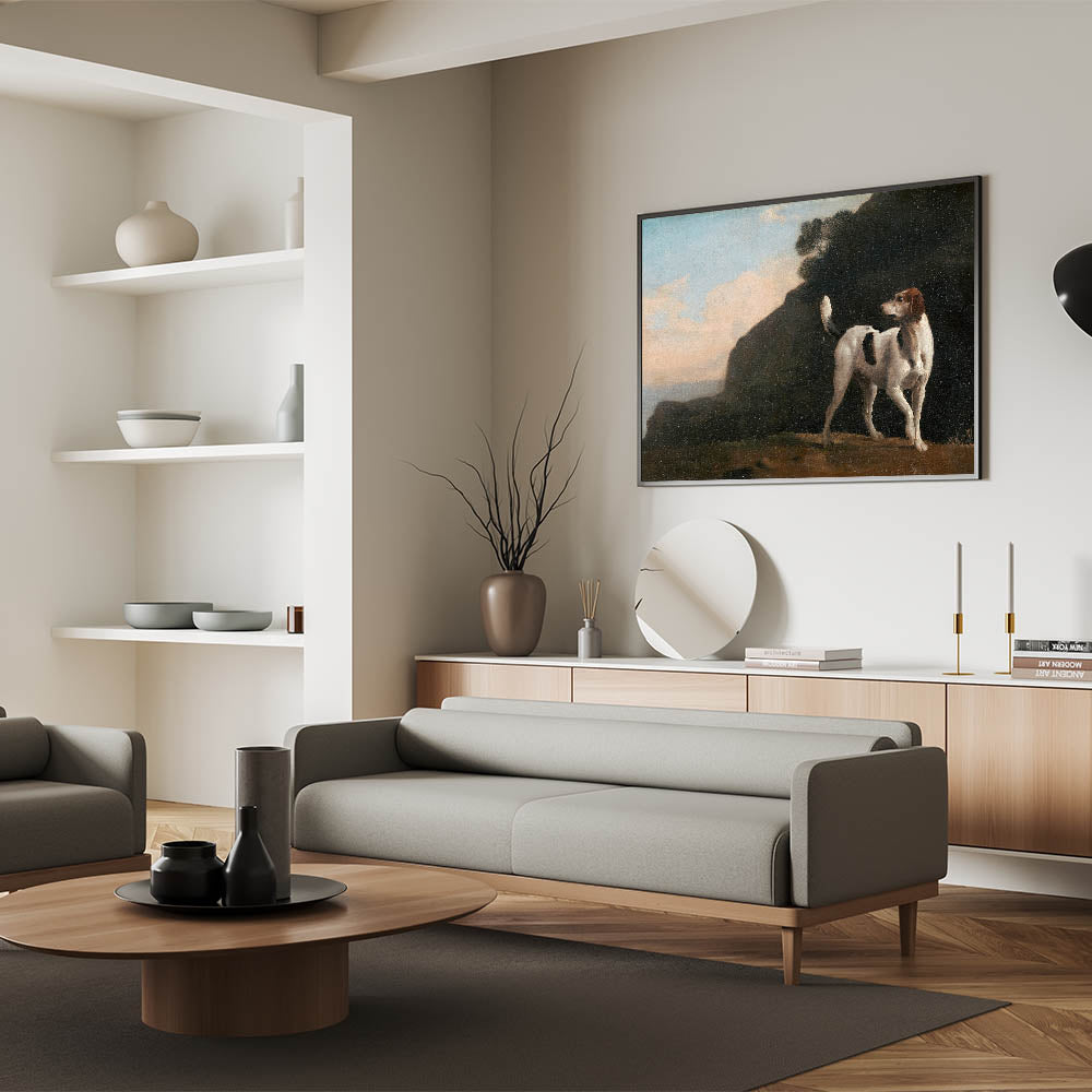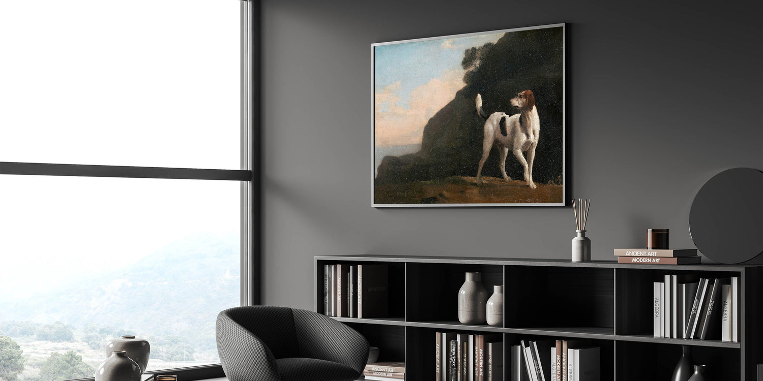 Embrace the timeless elegance of Romanticism with this stunning depiction of a Foxhound by George Stubbs, created in 1760. This exquisite artwork captures the quiet strength and beauty of the dog in a serene natural setting, showcasing the Romantic era's appreciation for animals and landscapes. Perfect for dog lovers and art enthusiasts, this piece adds a sense of history and sophistication to any space.