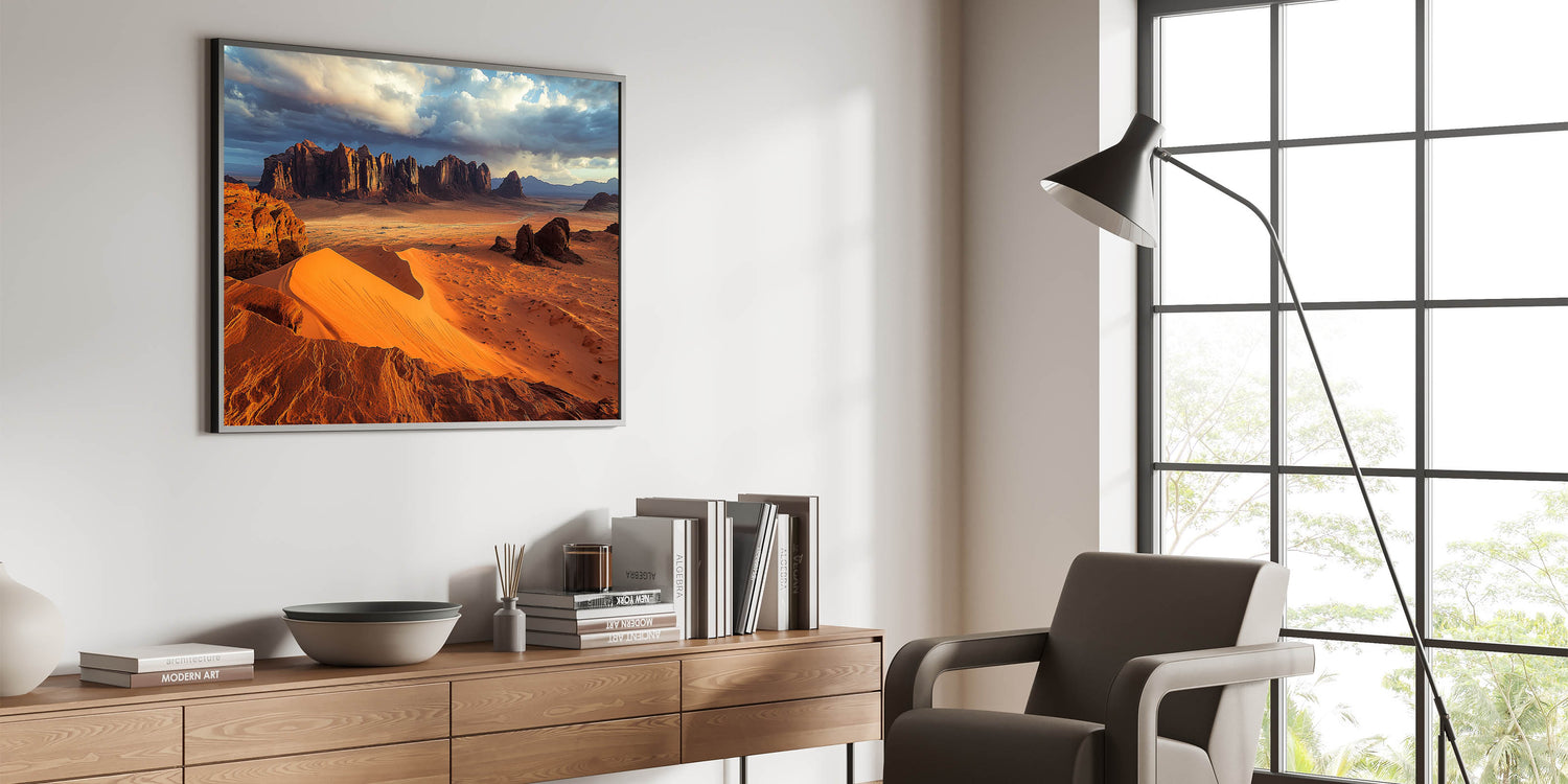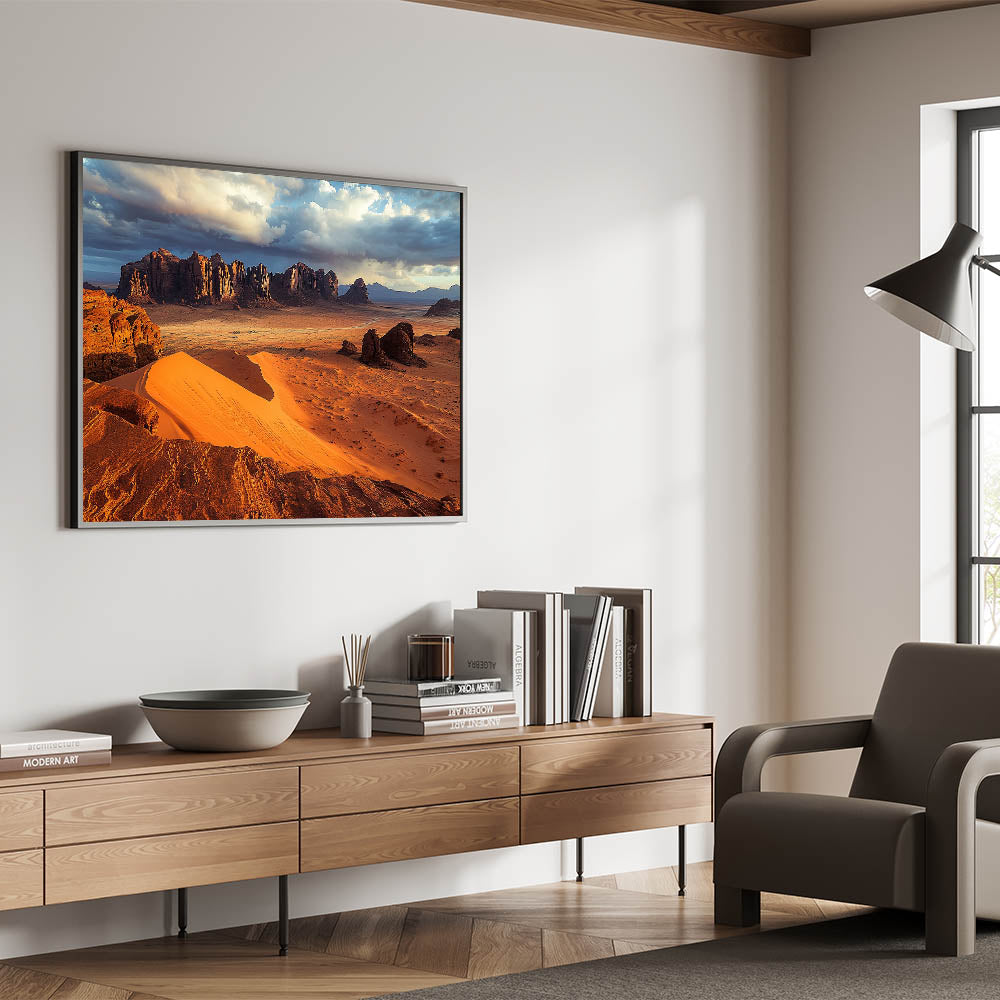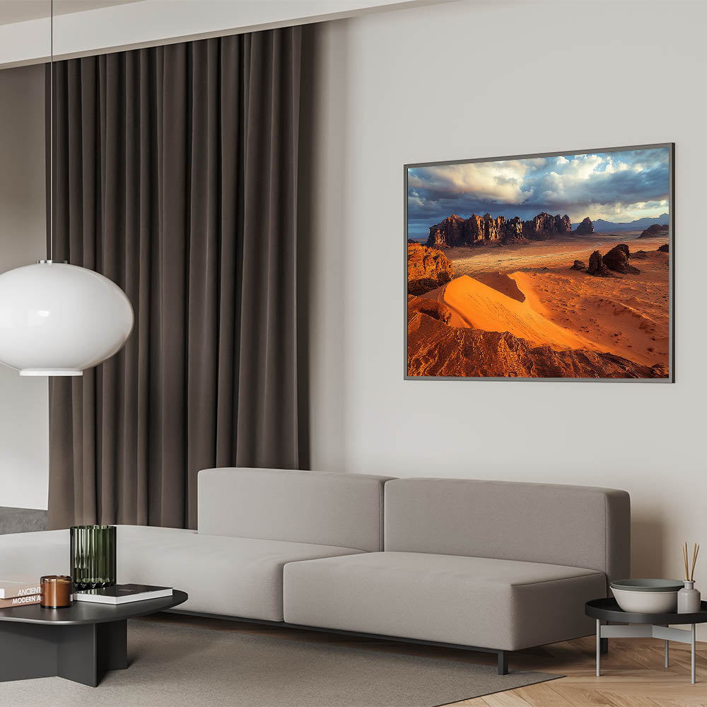 Immerse yourself in the vast beauty of the desert with this cliffs canvas art featuring golden sand dunes stretching toward rugged cliffs under a dramatic sky. The interplay of light and shadow across the dunes and cliffs creates a breathtaking visual that captures the essence of this arid yet stunning landscape.