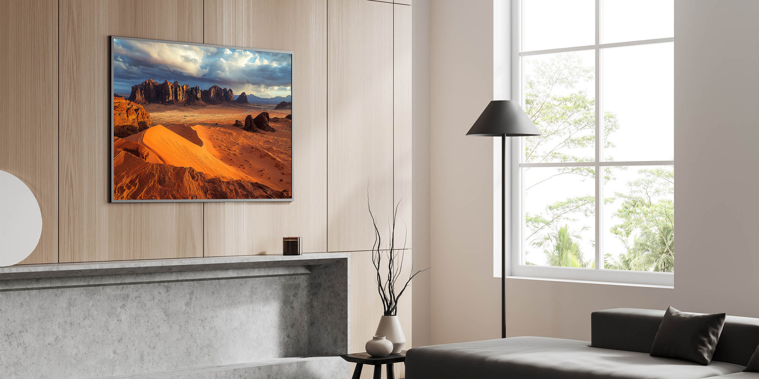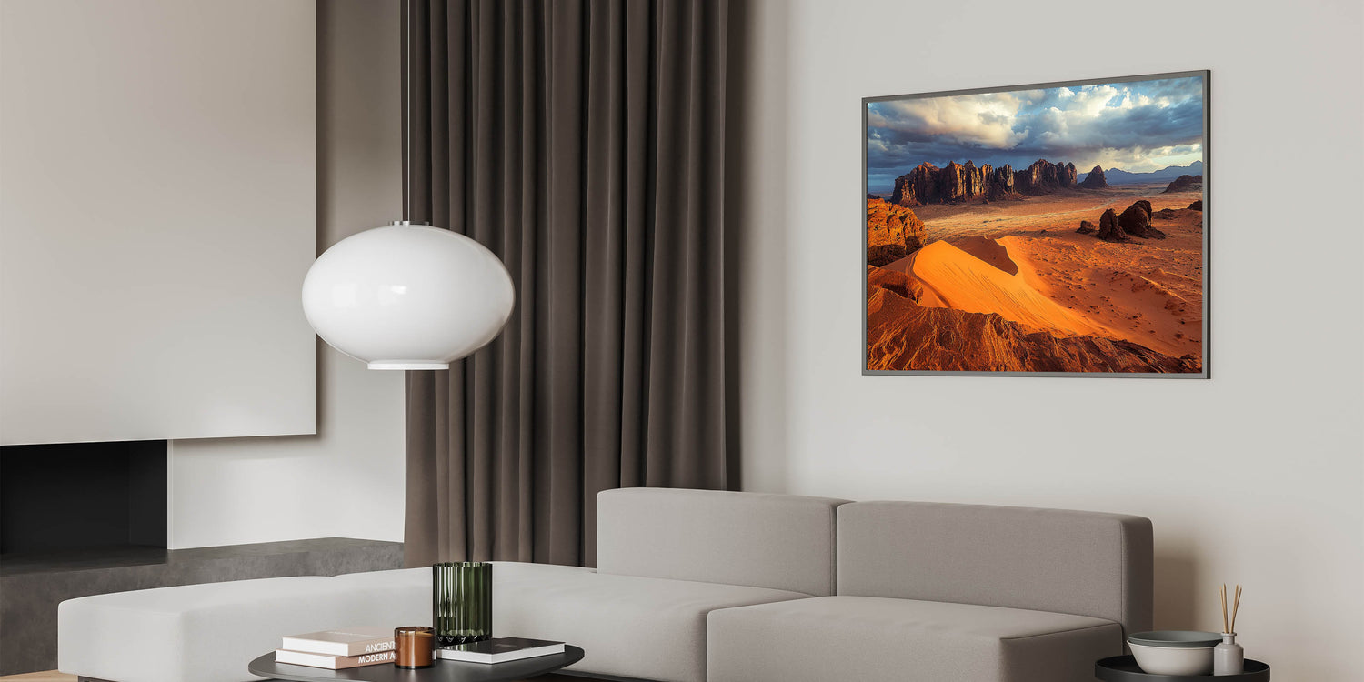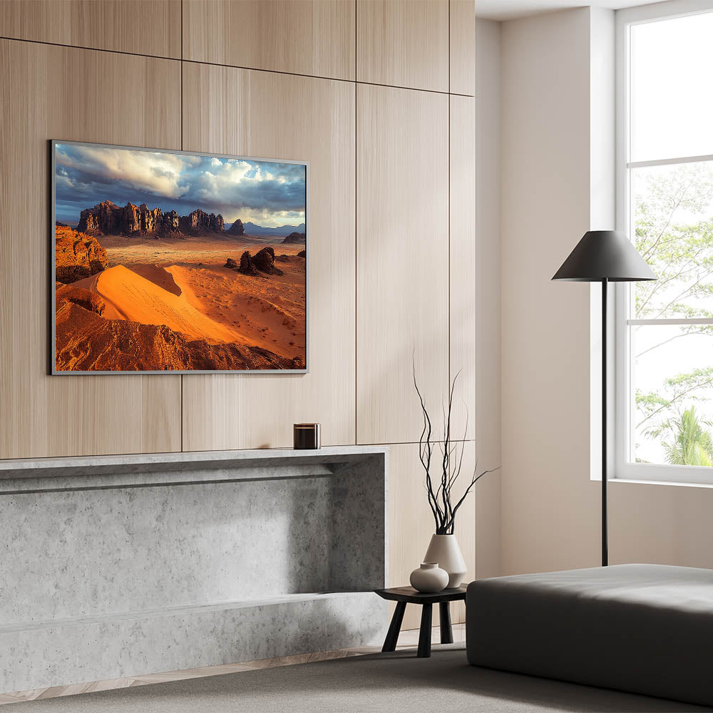 Immerse yourself in the vast beauty of the desert with this cliffs canvas art featuring golden sand dunes stretching toward rugged cliffs under a dramatic sky. The interplay of light and shadow across the dunes and cliffs creates a breathtaking visual that captures the essence of this arid yet stunning landscape.