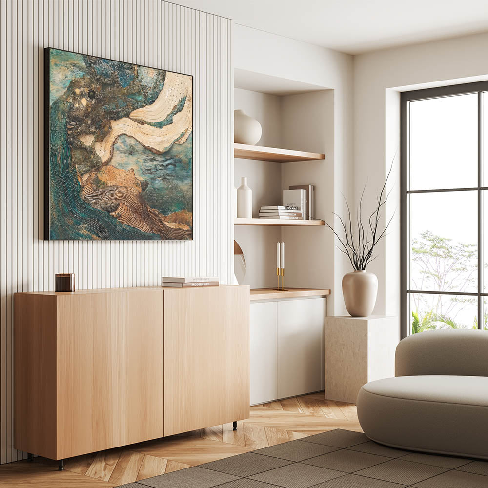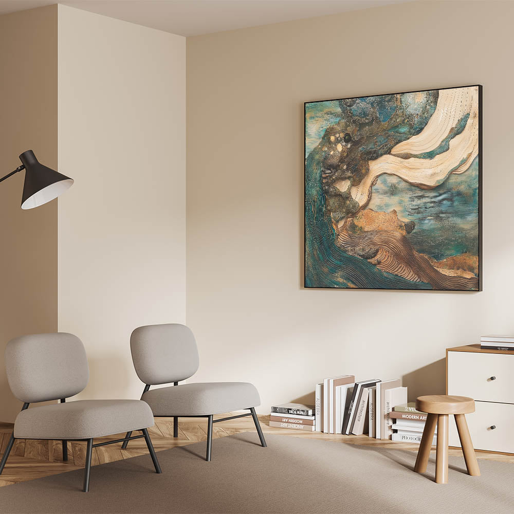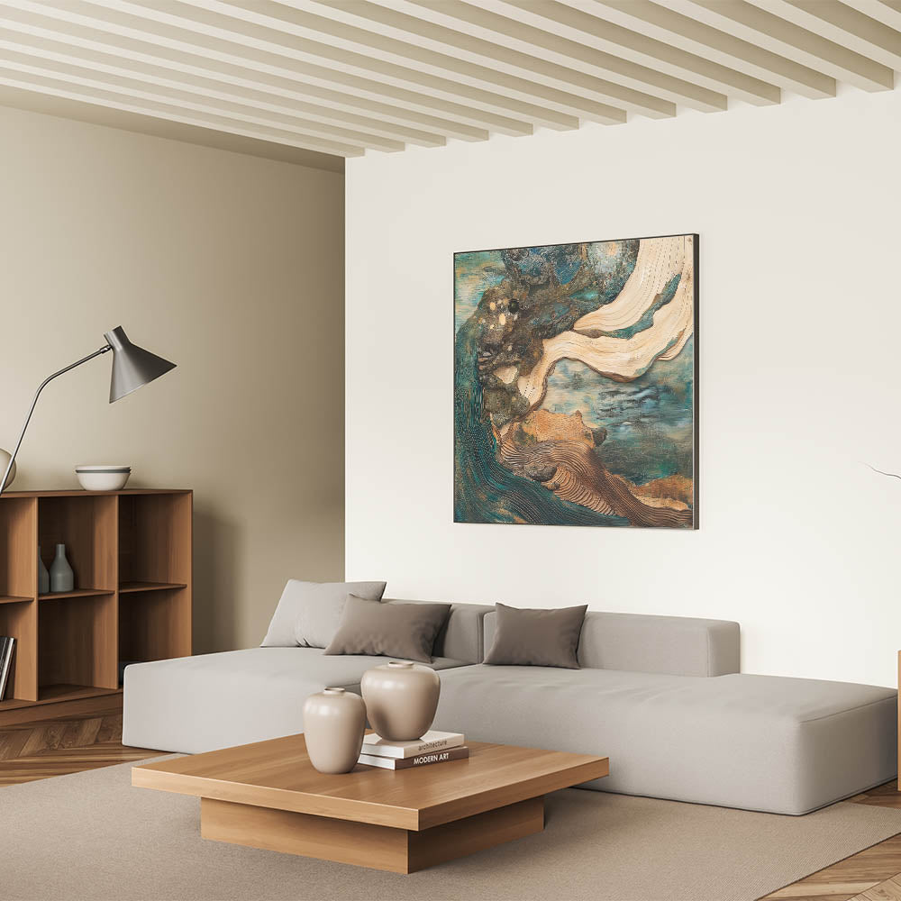 Infuse your space with the natural beauty of this Contemporary Figurative Wall Art, a stunning blend of abstract textures and ocean-inspired hues. Featuring intricate swirls of turquoise, brown, and cream tones, this piece resembles flowing water and organic forms, creating a dynamic and tranquil visual effect.
