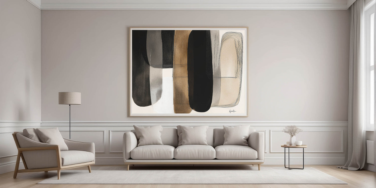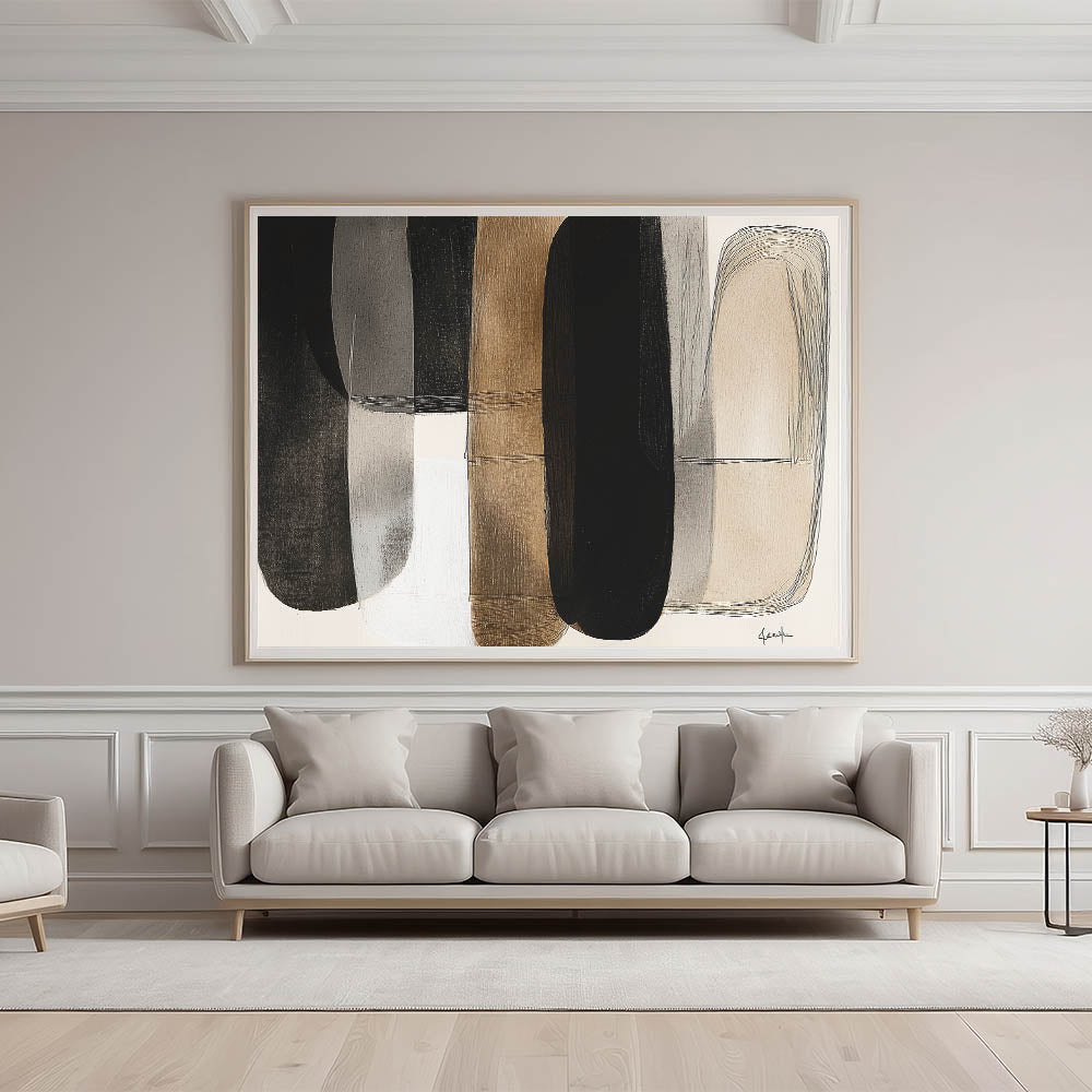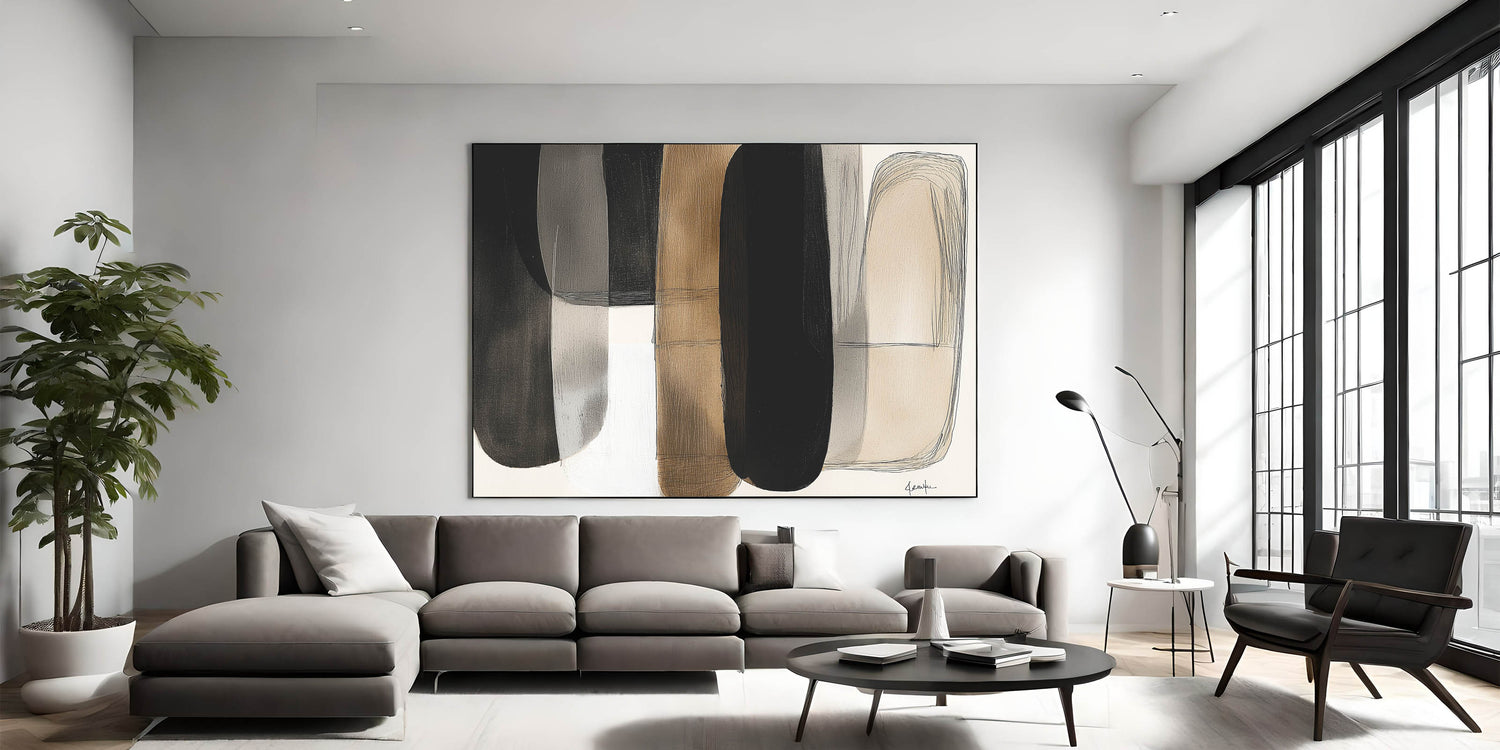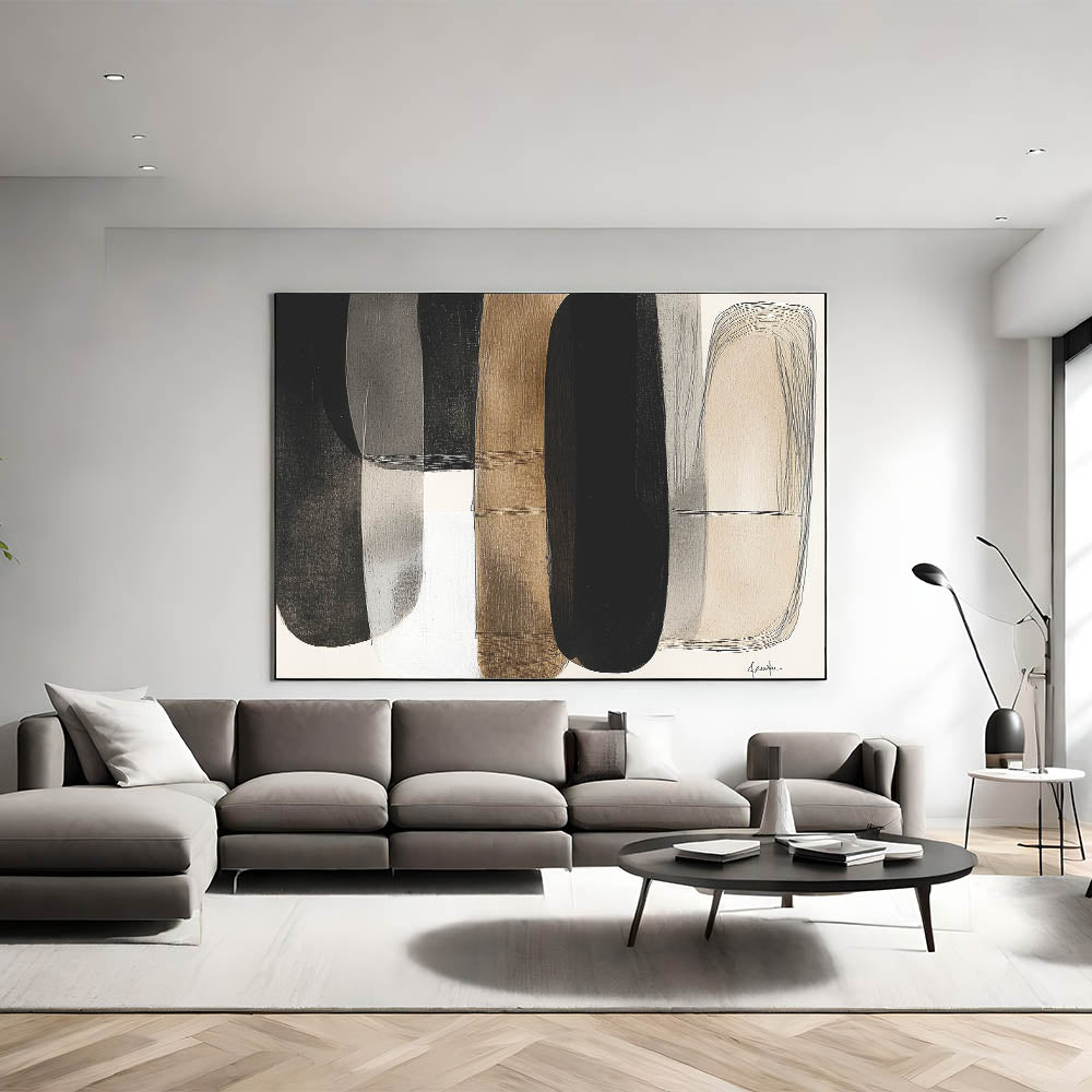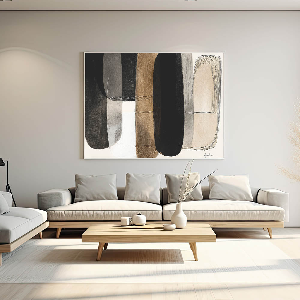 Add a touch of modern elegance to your space with this contemporary minimalist abstract art. Featuring overlapping shapes in a harmonious palette of black, white, beige, and brown, this piece creates a warm and balanced aesthetic. The subtle textures and flowing forms offer depth and sophistication, perfect for modern, industrial, or mid-century interiors.