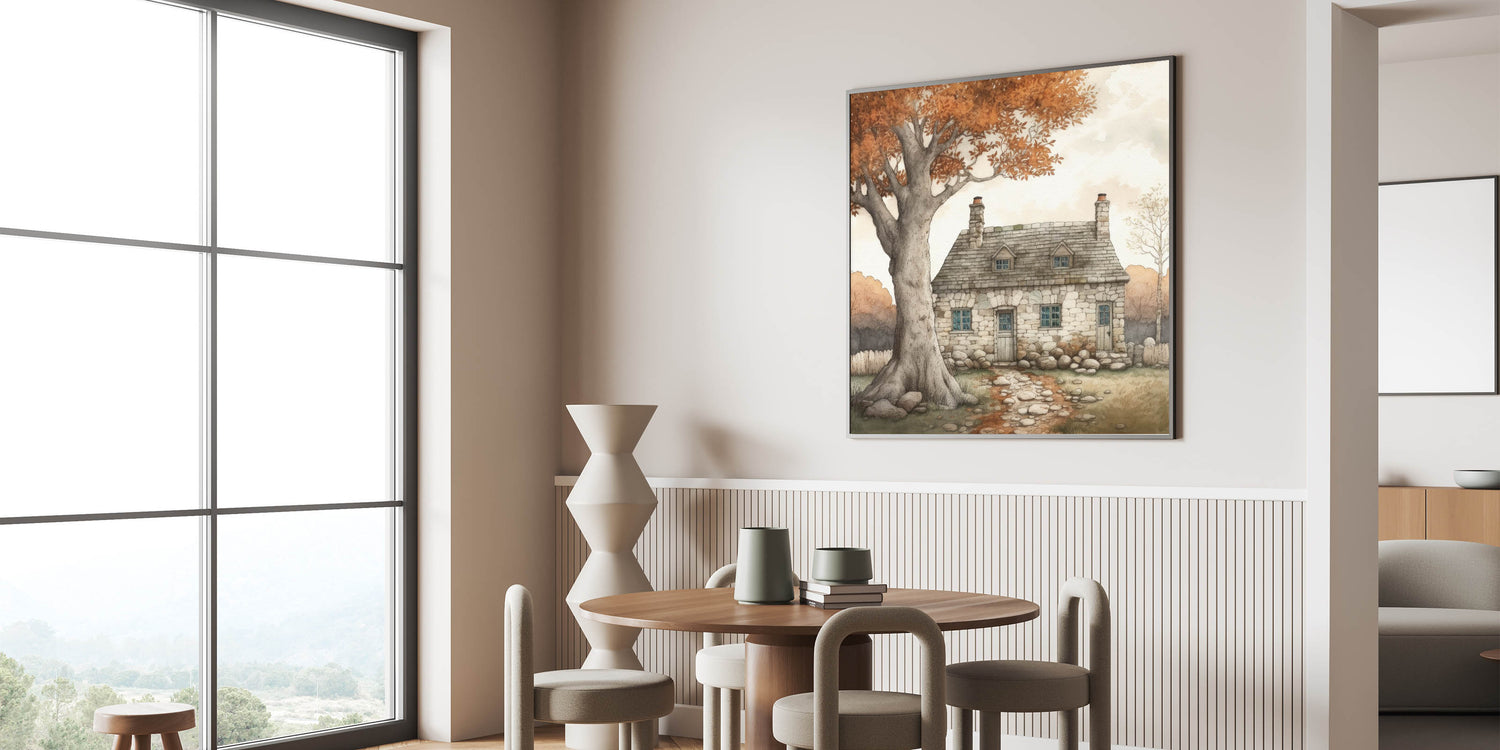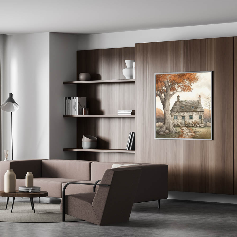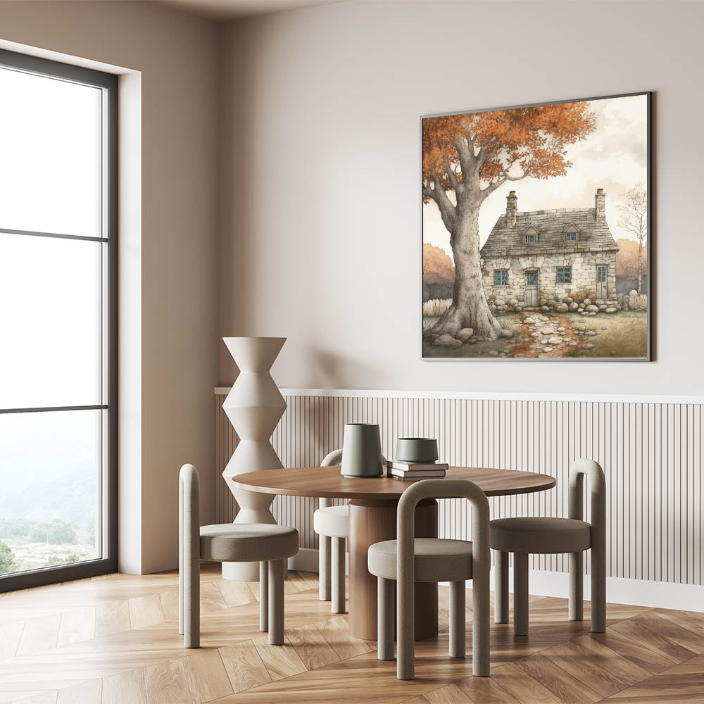 Capture the essence of a peaceful autumn retreat with this charming fall wall art. The artwork showcases a quaint stone cottage nestled under a large tree with golden-brown leaves, perfectly encapsulating the beauty of the harvest season. The soft, watercolor textures and muted tones create a tranquil atmosphere, making this piece ideal for adding a touch of rustic charm to your home decor.