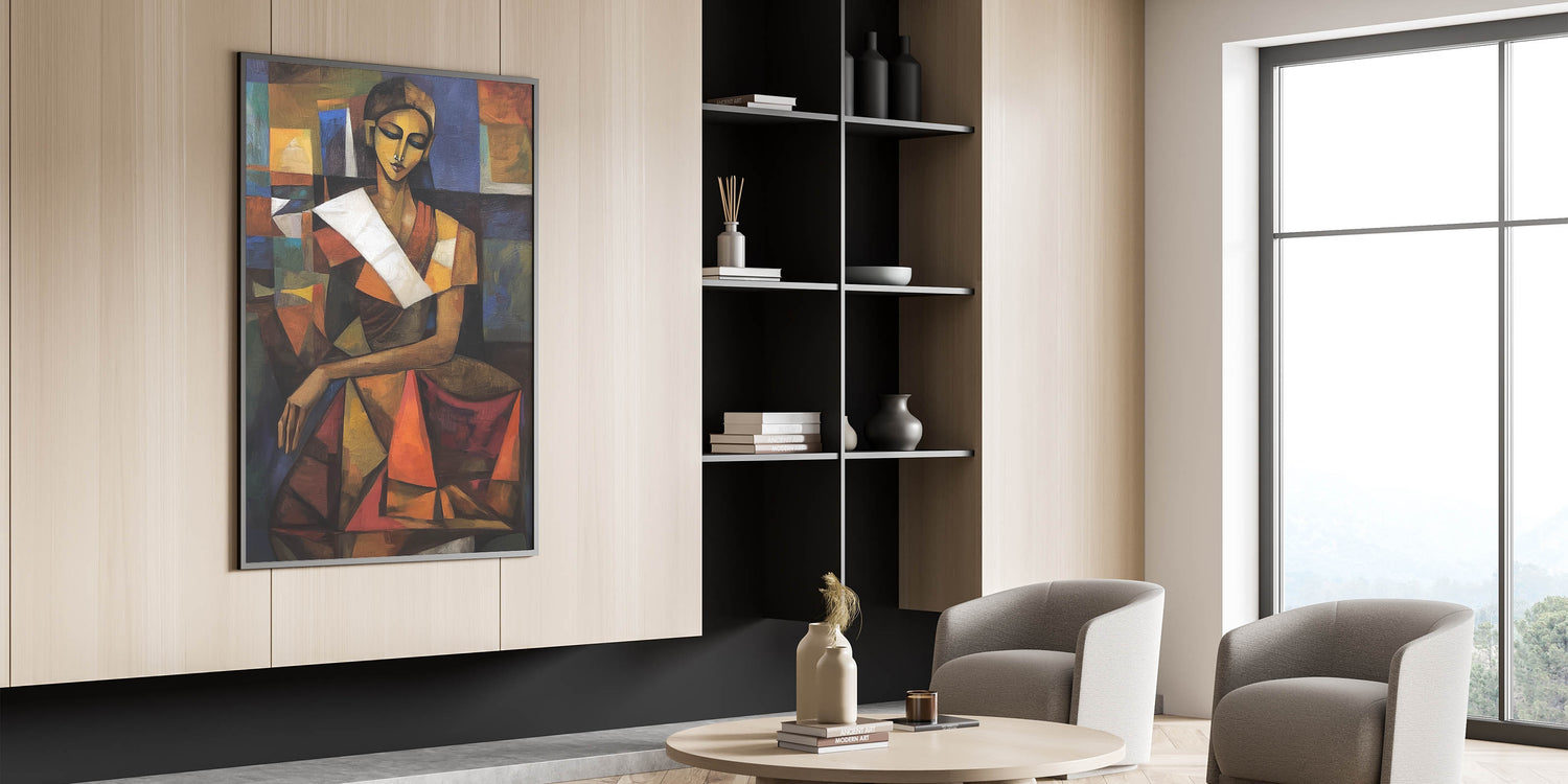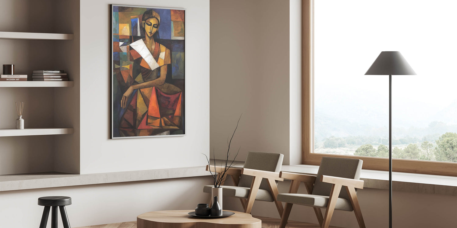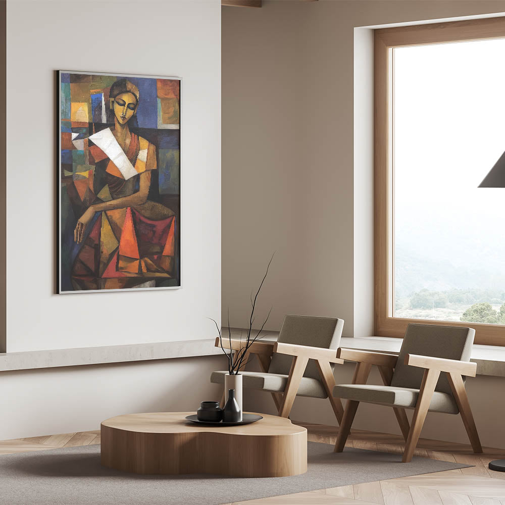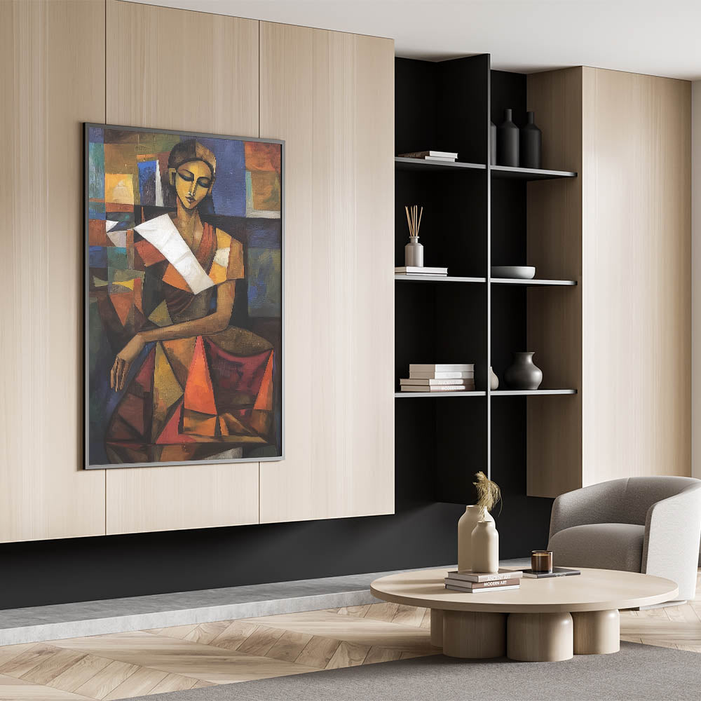 Add sophistication and artistic depth to your space with this Cubist Figurative Abstract Art, featuring a serene female figure in warm earthy tones. The geometric patterns and intricate brushstrokes create a cubist-inspired design that balances emotion and abstraction. With hues of orange, red, brown, and white, this figurative abstract canvas art is an ideal addition to modern or eclectic interiors.