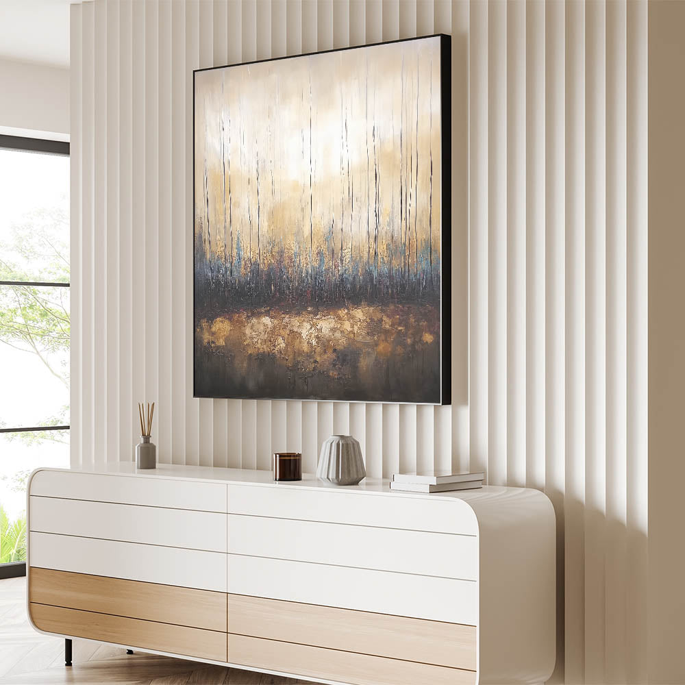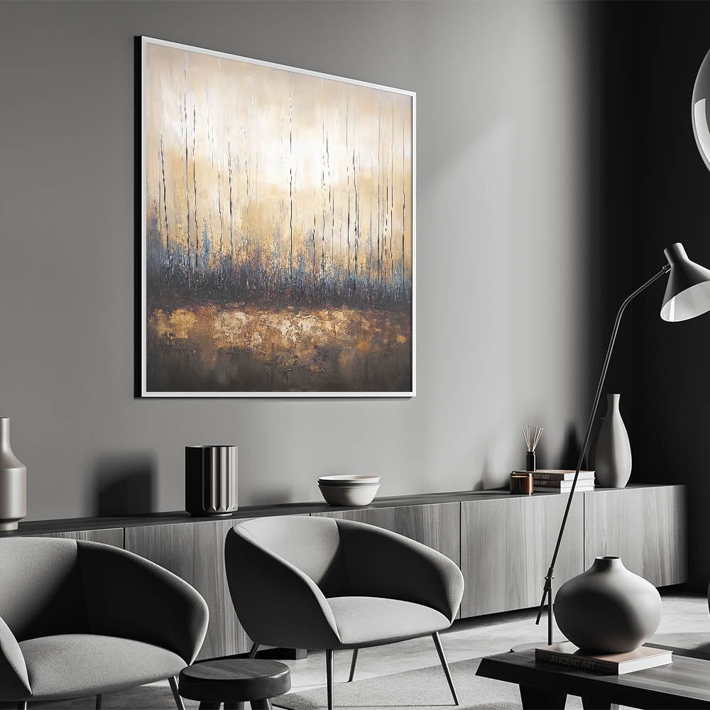 Transform your space with the serene beauty of this Earthy Abstract Tree Line Canvas. Featuring delicate, vertical tree-like forms rising from a richly textured ground, this design is rendered in muted tones of brown, beige, and cream with subtle hints of blue. The gradient effect in the background adds depth and warmth, making it a perfect addition to modern, rustic, or contemporary spaces.