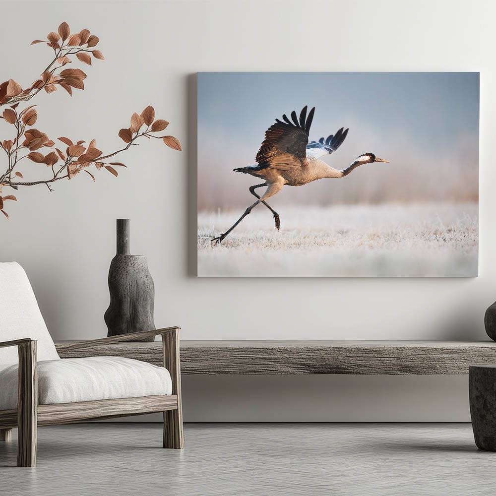 Immerse yourself in the beauty of nature with this stunning wildlife photography wall art featuring a graceful crane in motion. The soft, muted tones of the landscape provide a serene backdrop, highlighting the intricate details of the crane's wings and its poised elegance. Perfect for living rooms, bedrooms, or offices, this artwork brings a sense of calm and natural beauty to any interior.