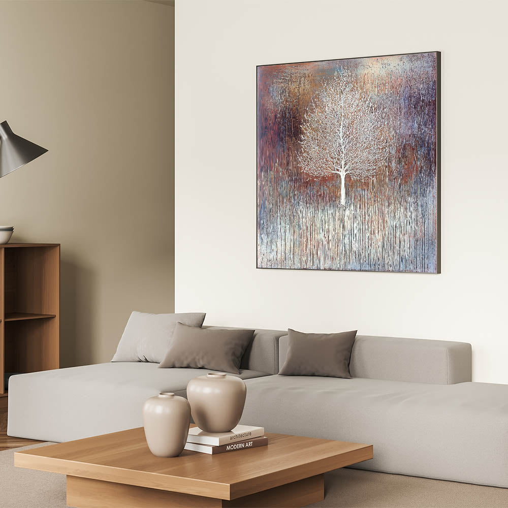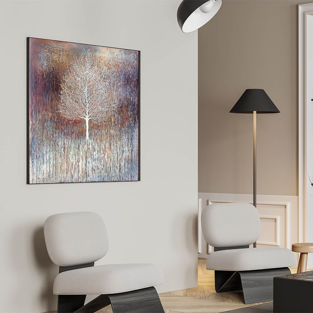 - Vibrant Design: The artwork captures a stunning interplay of white branches with deep hues of brown, orange, and silver tones.