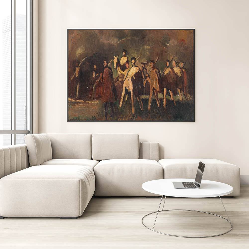 Introduce a sense of drama and movement to your walls with "Expedition," a compelling piece of abstract modern art. This contemporary artwork by Cyprián Majerník portrays a group of figures marching through a moody and atmospheric setting, using earthy tones and expressive strokes to convey strength and unity. Perfect for trendy home decor enthusiasts looking to make a bold statement.
