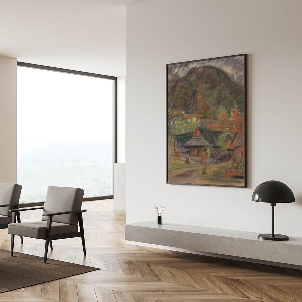 Capture the tranquil charm of rural life with "In a Village" by Arnold Peter Weisz-Kubínčan. This Expressionist artwork features a serene village scene, highlighted by bold yet soft brushstrokes and a harmonious blend of earthy greens, deep browns, and fiery oranges. The artist skillfully depicts the rustic houses, lush surroundings, and a quiet moment of interaction, creating a composition full of warmth and subtle movement.