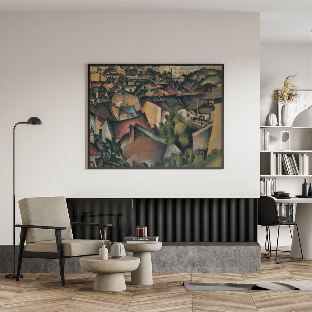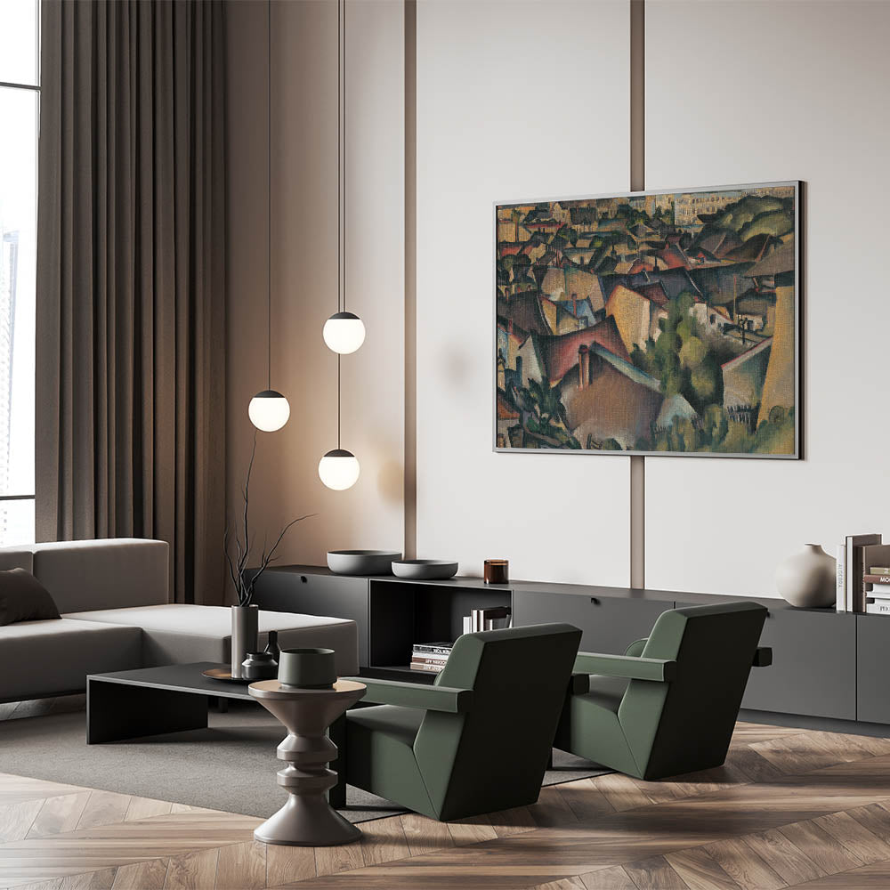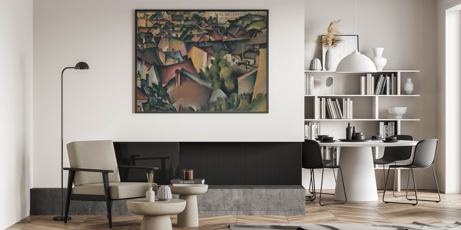 Step into the beauty of urban Expressionism with "Košice in Spring" by Konštantín Bauer. This breathtaking artwork captures a vibrant cityscape, with its dynamic arrangement of rooftops and lush greenery, painted in a harmonious blend of earthy browns, soft yellows, and rich greens. The sweeping perspective reveals the charm of Košice as it awakens in spring, with Bauer’s expressive brushstrokes bringing life and movement to the scene.