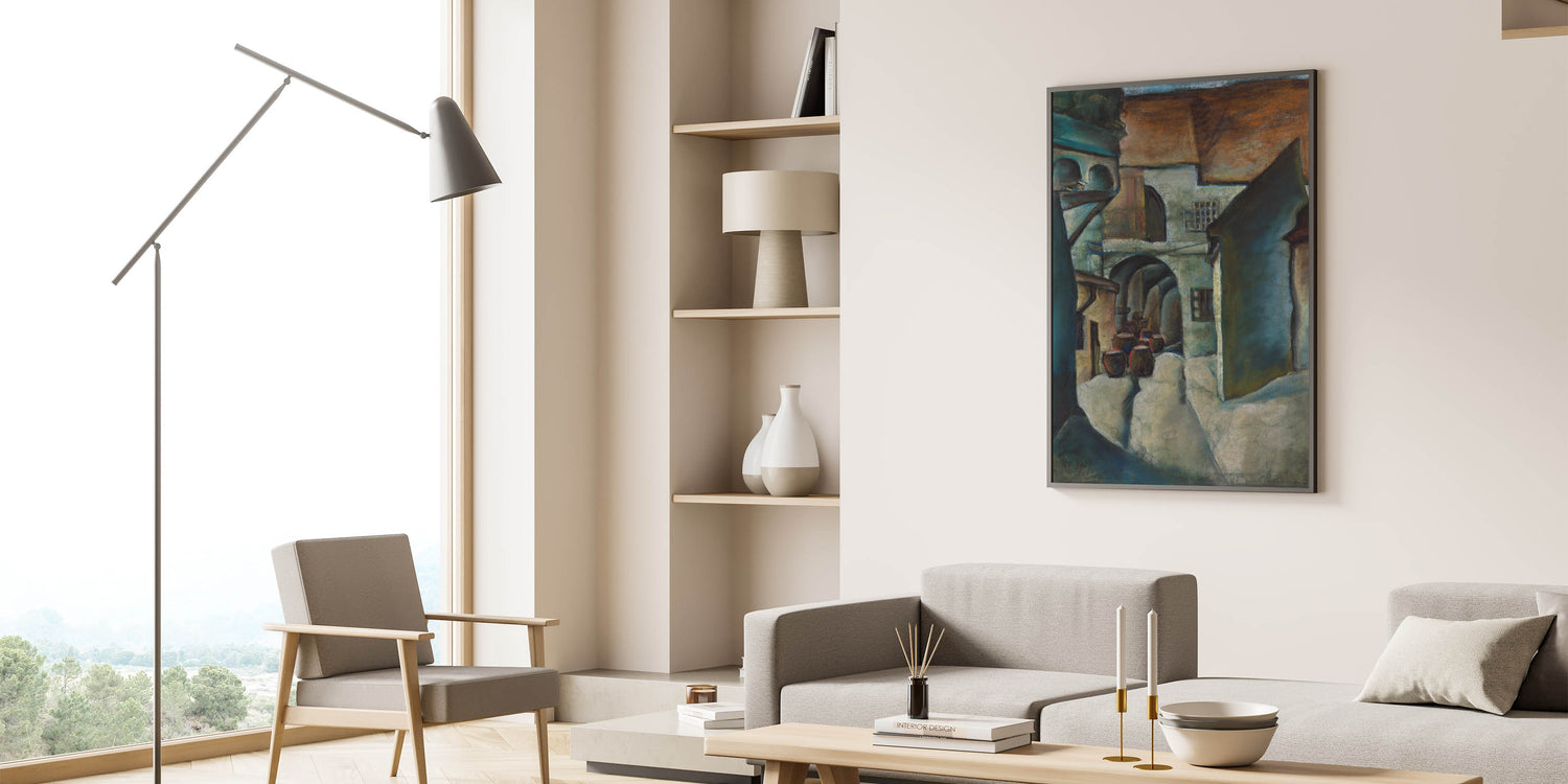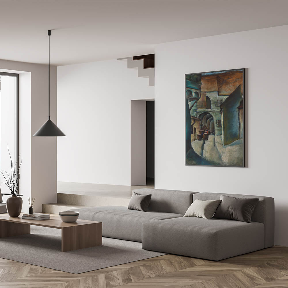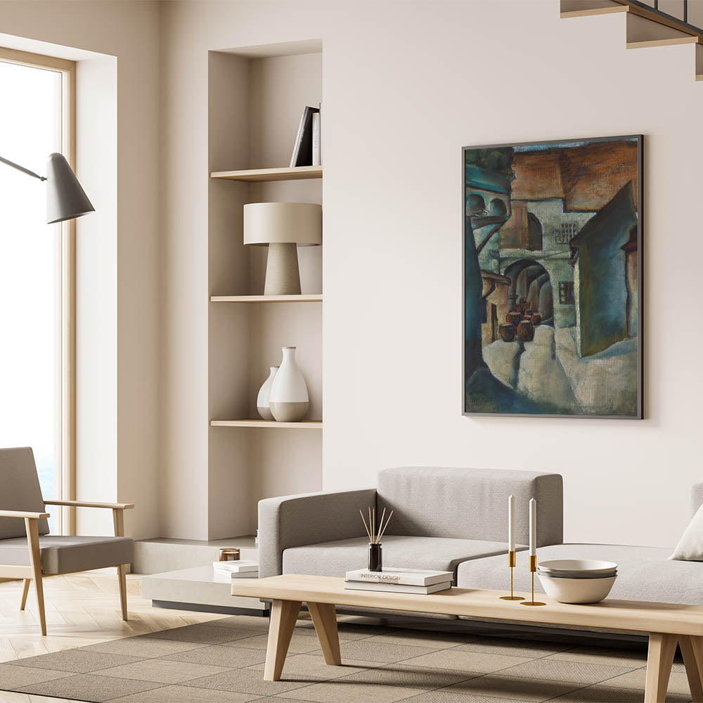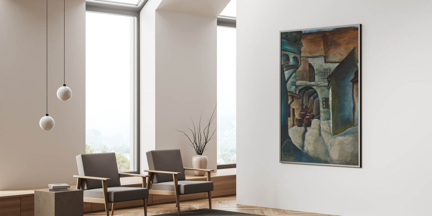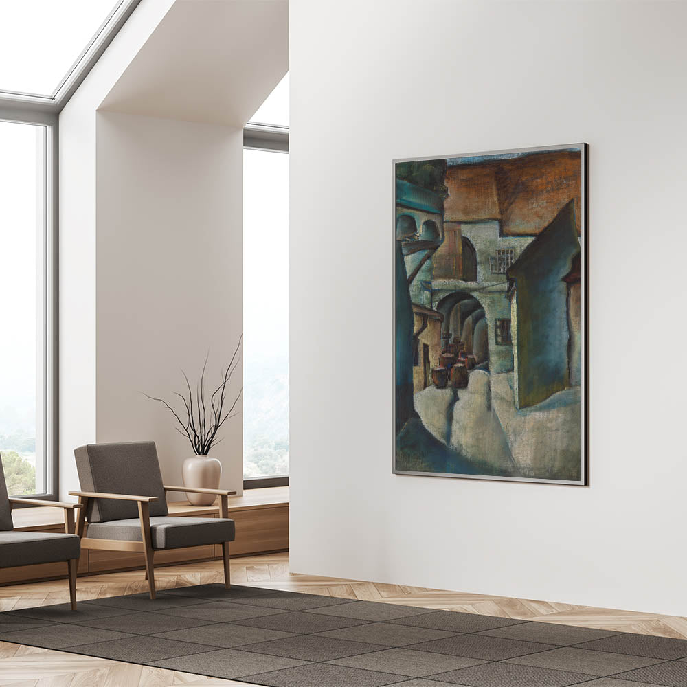 This stunning depiction of a Košice courtyard is ideal for art lovers seeking a piece that blends architectural elegance with the emotive power of Expressionism. Transform your home or office with this evocative work of art that celebrates the beauty of simplicity and space.