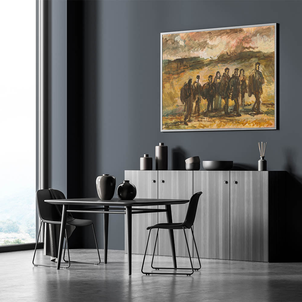 Experience the profound narrative of Refugees on the Move by Cyprián Majerník, a masterpiece that captures the emotional weight of displacement and perseverance. This Expressionist artwork depicts a group of refugees journeying across an expansive landscape, their somber expressions reflecting resilience amidst adversity. Majerník's evocative brushstrokes and earthy tones highlight the gravity of their plight, making this a deeply moving piece that resonates with the human experience.