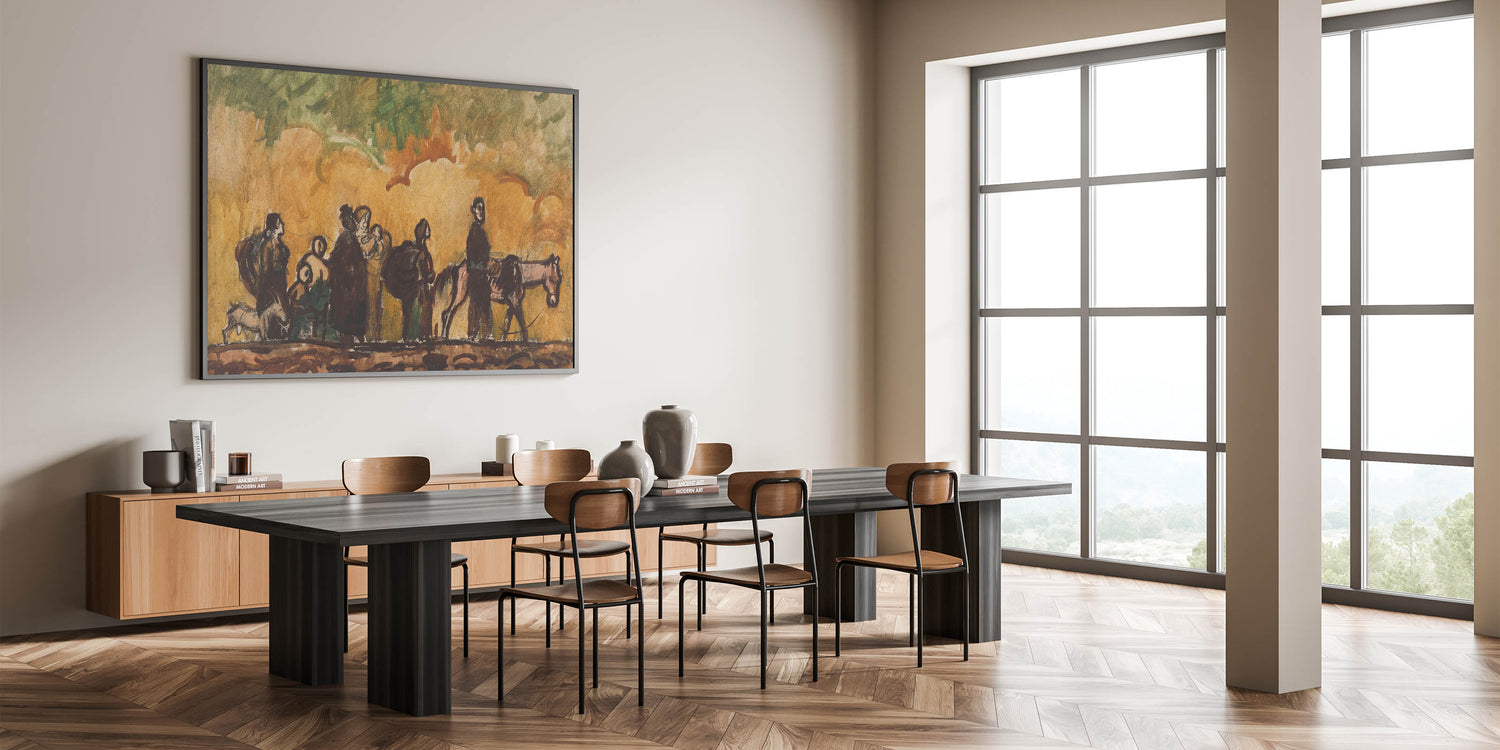 Add a profound narrative to your art collection with Refugees with Horses by Cyprián Majerník. This evocative Expressionist piece captures a group of travelers on a journey, accompanied by their horses, under a swirling sky of warm tones. The earthy color palette and dynamic brushstrokes highlight themes of resilience and survival, making it a deeply moving representation of human perseverance. Ideal for collectors of emotive and impactful art, this piece is a testament to the power of storytelling through Expressionism.