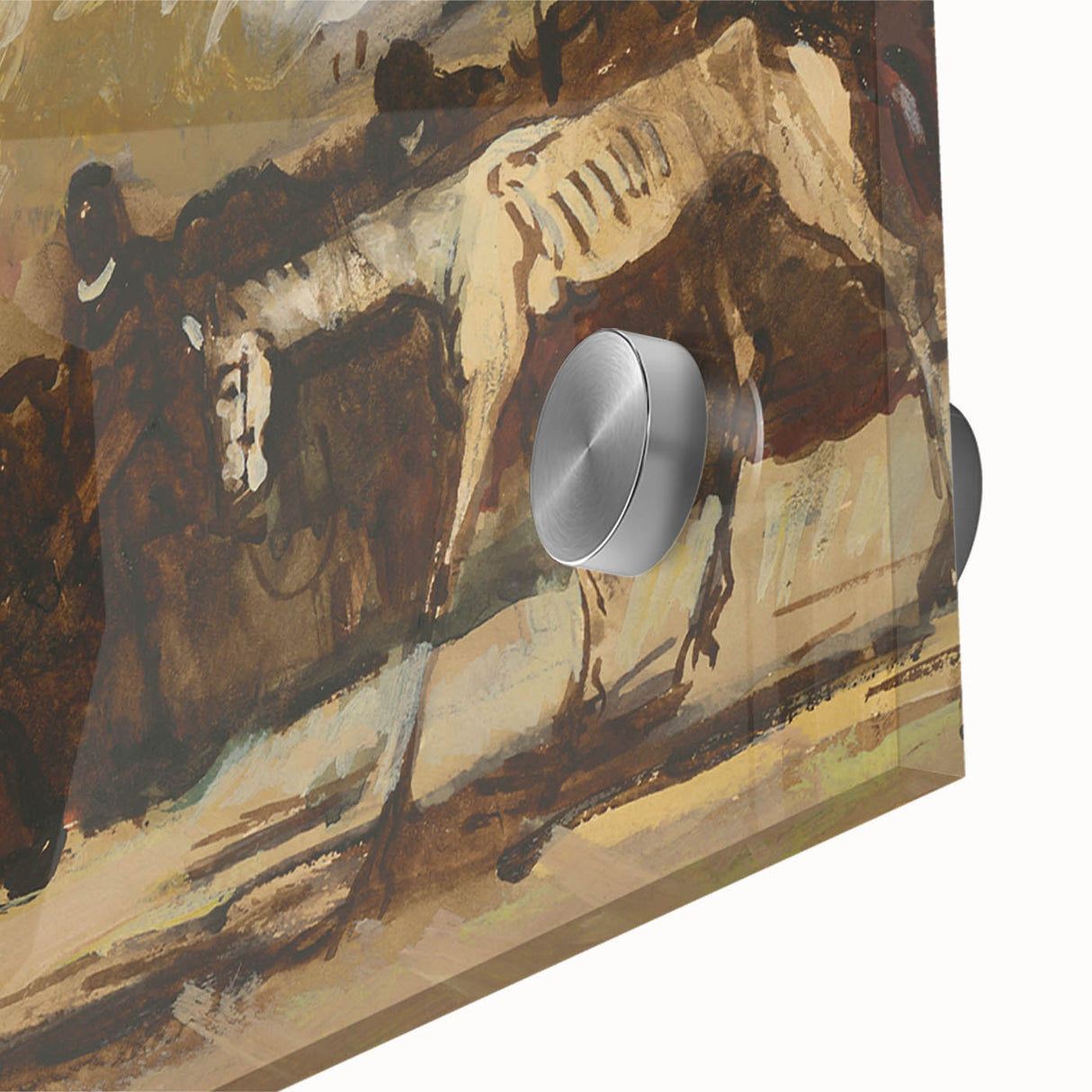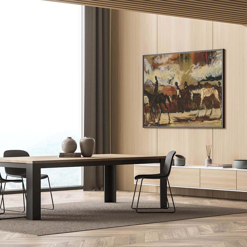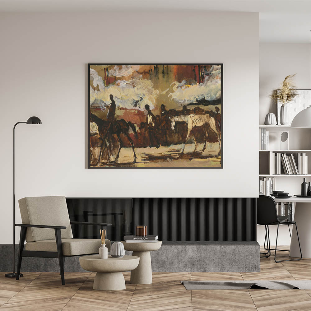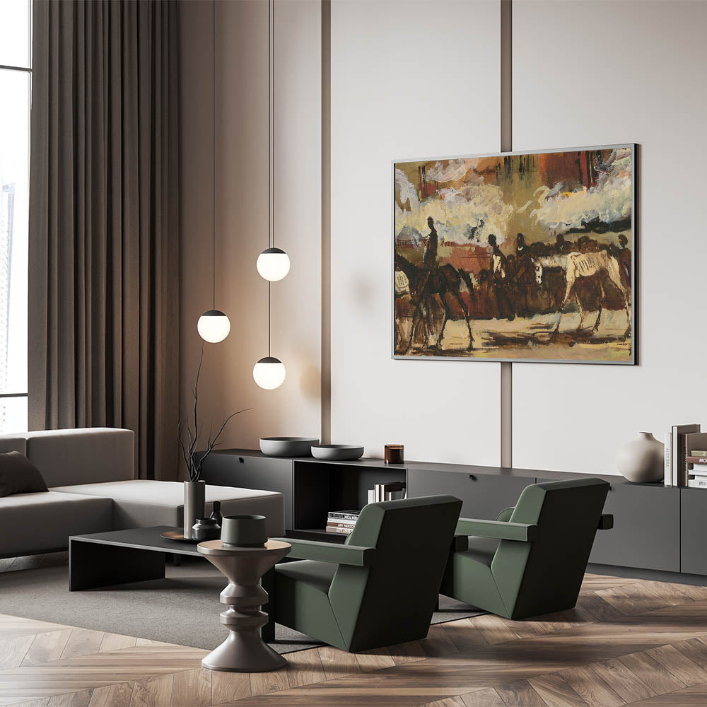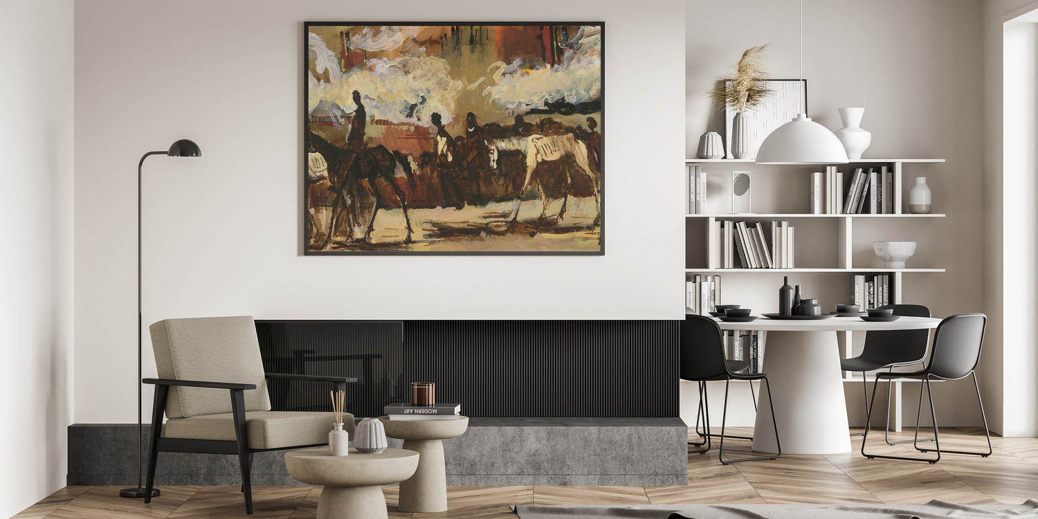 Explore the evocative world of Expressionism with Riders by Cyprián Majerník. This powerful artwork portrays a group of skeletal horses and figures against a turbulent, smoky background. The stark contrasts of white, brown, and red tones convey a somber narrative, capturing themes of perseverance and the fragility of life. Majerník's expressive brushstrokes create a dynamic and poignant composition that resonates deeply, making it a remarkable centerpiece for any art collection.