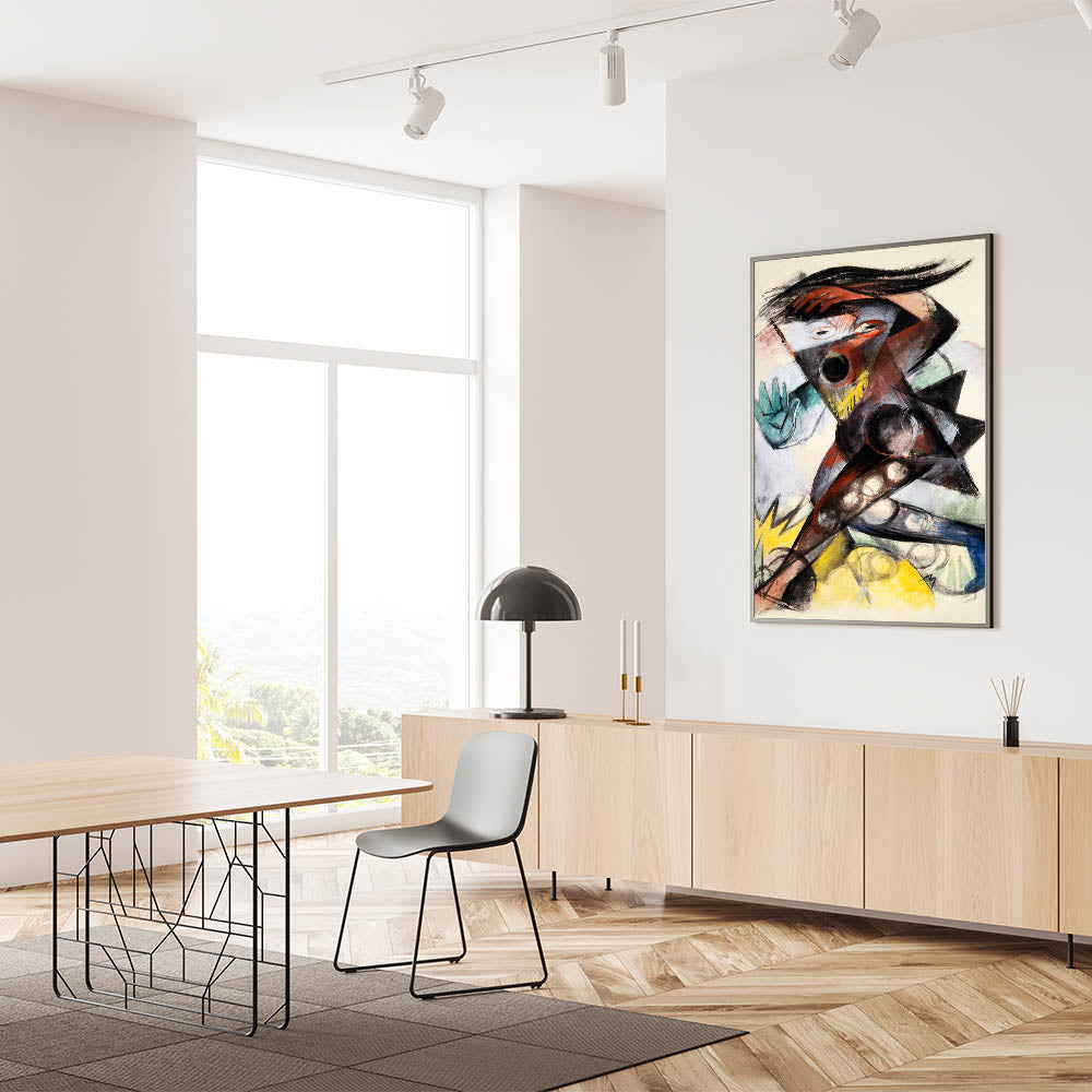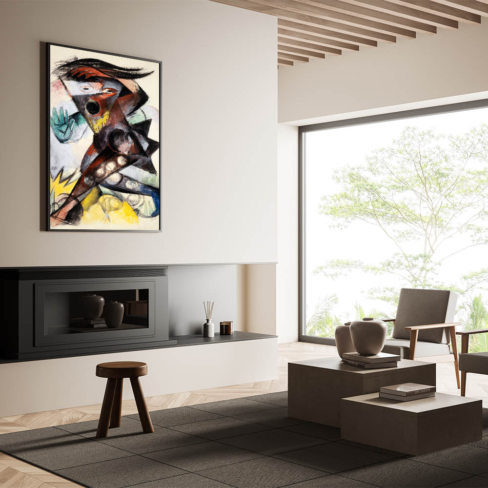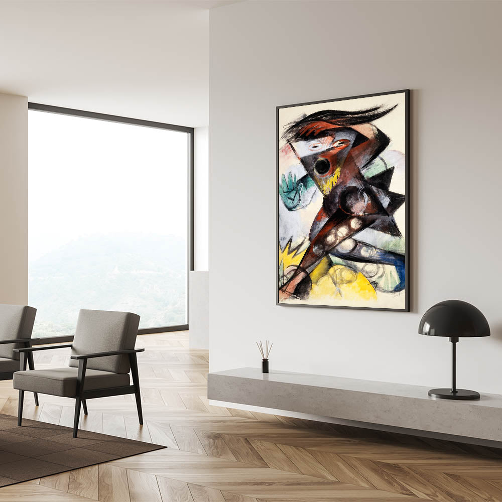 Discover the bold expression of Franz Marc’s "Caliban – Figurine for The Tempest," an abstract masterpiece inspired by Shakespeare's iconic play. This painting captures the chaotic and primal energy of Caliban, blending intense yellows, deep reds, and earthy browns with geometric and fluid shapes. The dramatic contrasts and dynamic brushstrokes evoke the raw emotion and complexity of the character, making this artwork a captivating addition to any space.