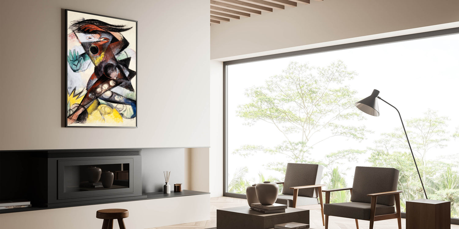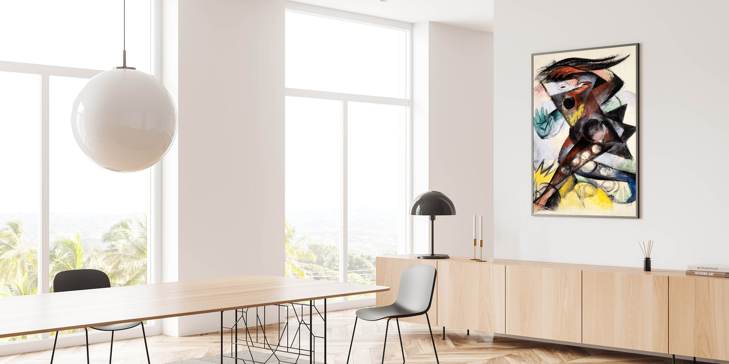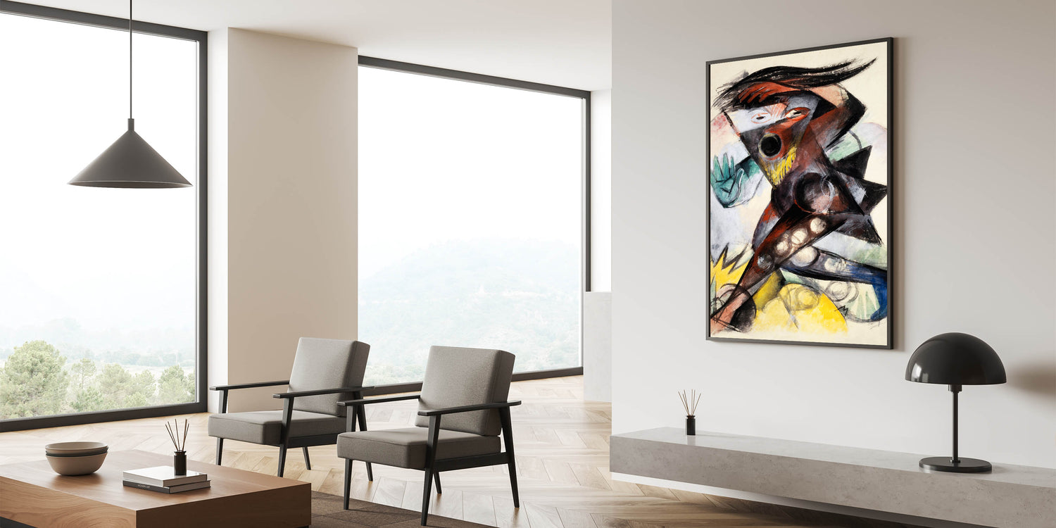 Discover the bold expression of Franz Marc’s "Caliban – Figurine for The Tempest," an abstract masterpiece inspired by Shakespeare's iconic play. This painting captures the chaotic and primal energy of Caliban, blending intense yellows, deep reds, and earthy browns with geometric and fluid shapes. The dramatic contrasts and dynamic brushstrokes evoke the raw emotion and complexity of the character, making this artwork a captivating addition to any space.