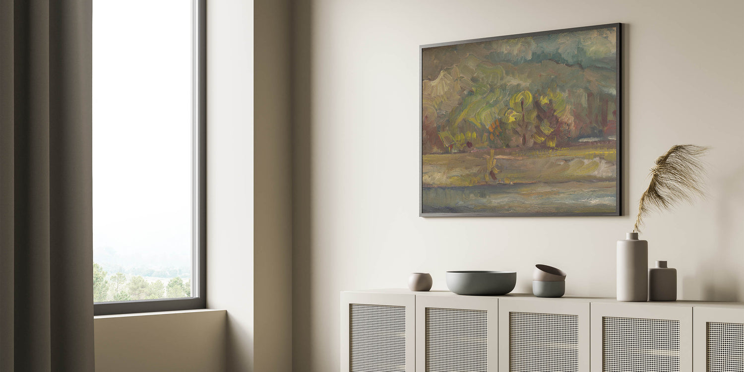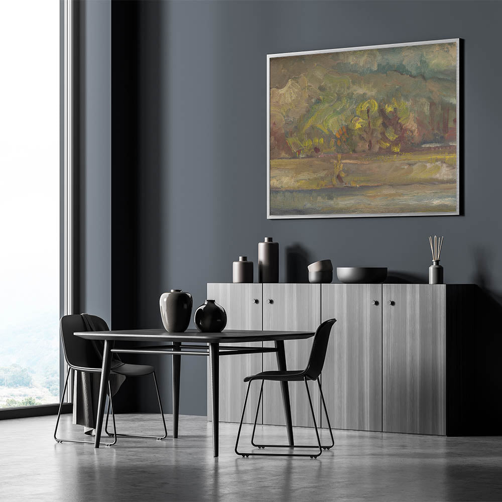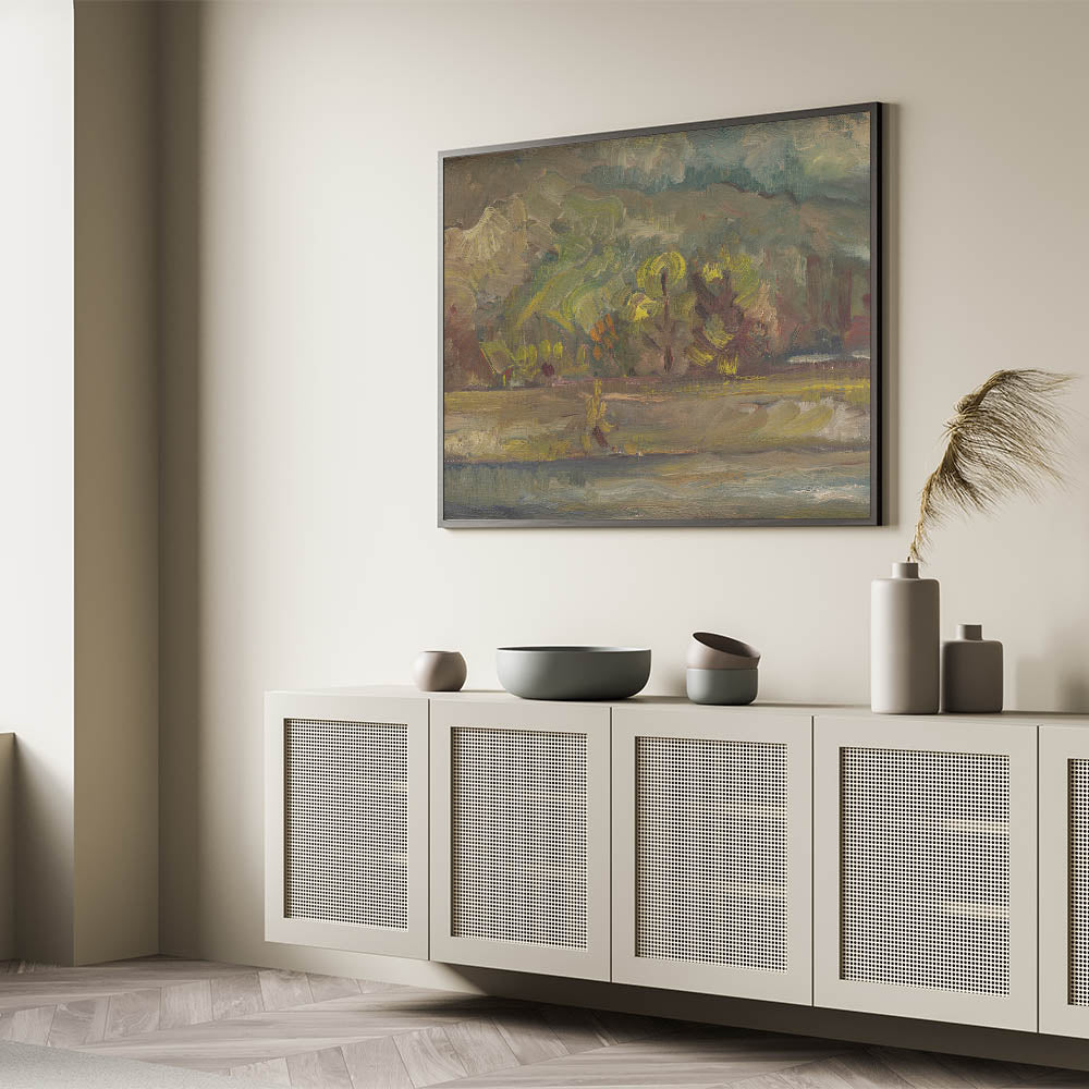 Transform your space with this mesmerizing Expressionist river landscape by Arnold Peter Weisz-Kubínčan. The painting features a dynamic interplay of earthy tones, greens, and yellows, creating a vibrant and emotive depiction of nature. The swirling brushstrokes and layered textures capture the essence of a serene yet lively riverside scene, making this artwork a perfect choice for art lovers and modern interiors.