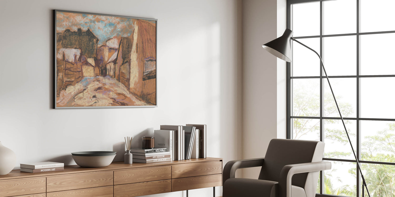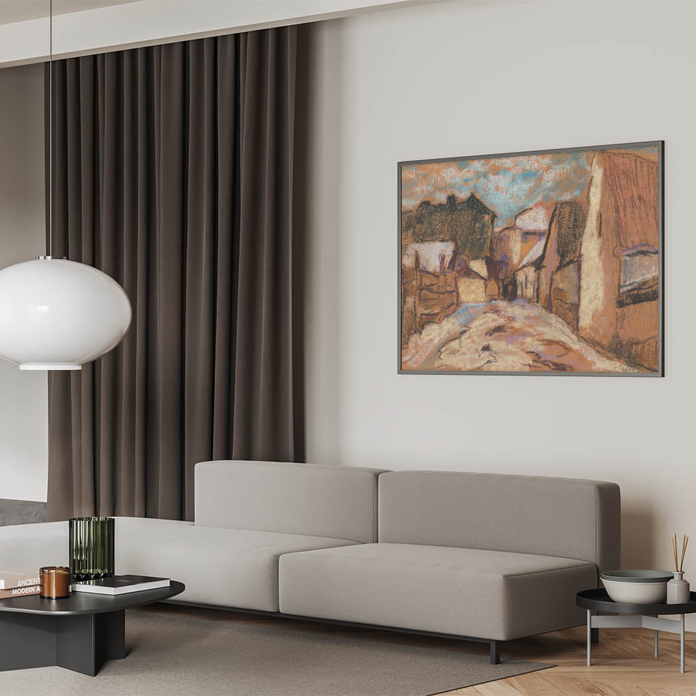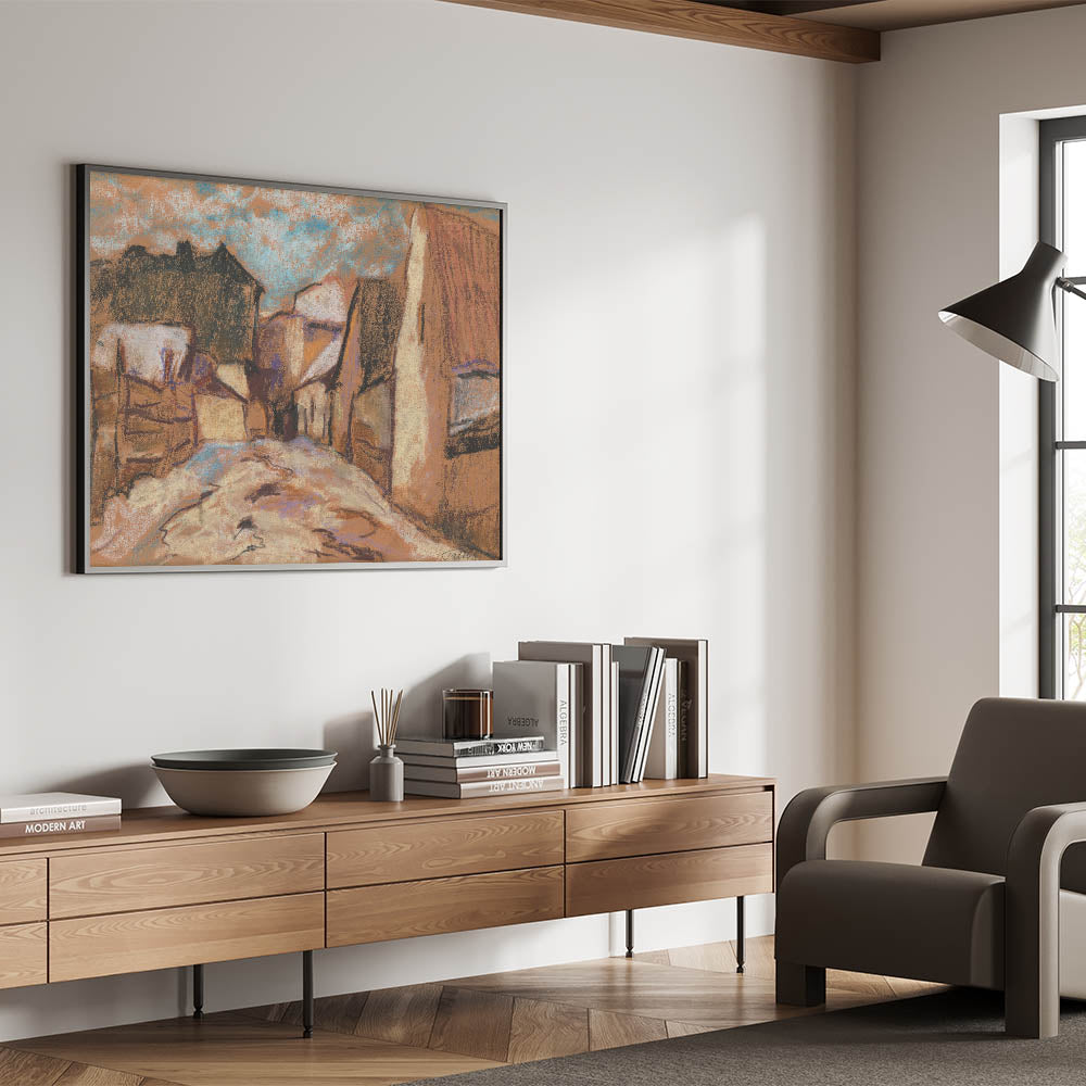 Introduce warmth and nostalgia to your space with "Rustic Alley" by Zolo Palugyay. This Expressionist artwork depicts a sunlit rural street with earthy tones and dynamic strokes that bring the scene to life. The rustic charm of weathered walls and soft pastel highlights evokes a sense of history and simplicity, making it an exceptional choice for those who appreciate the beauty of timeless village landscapes.