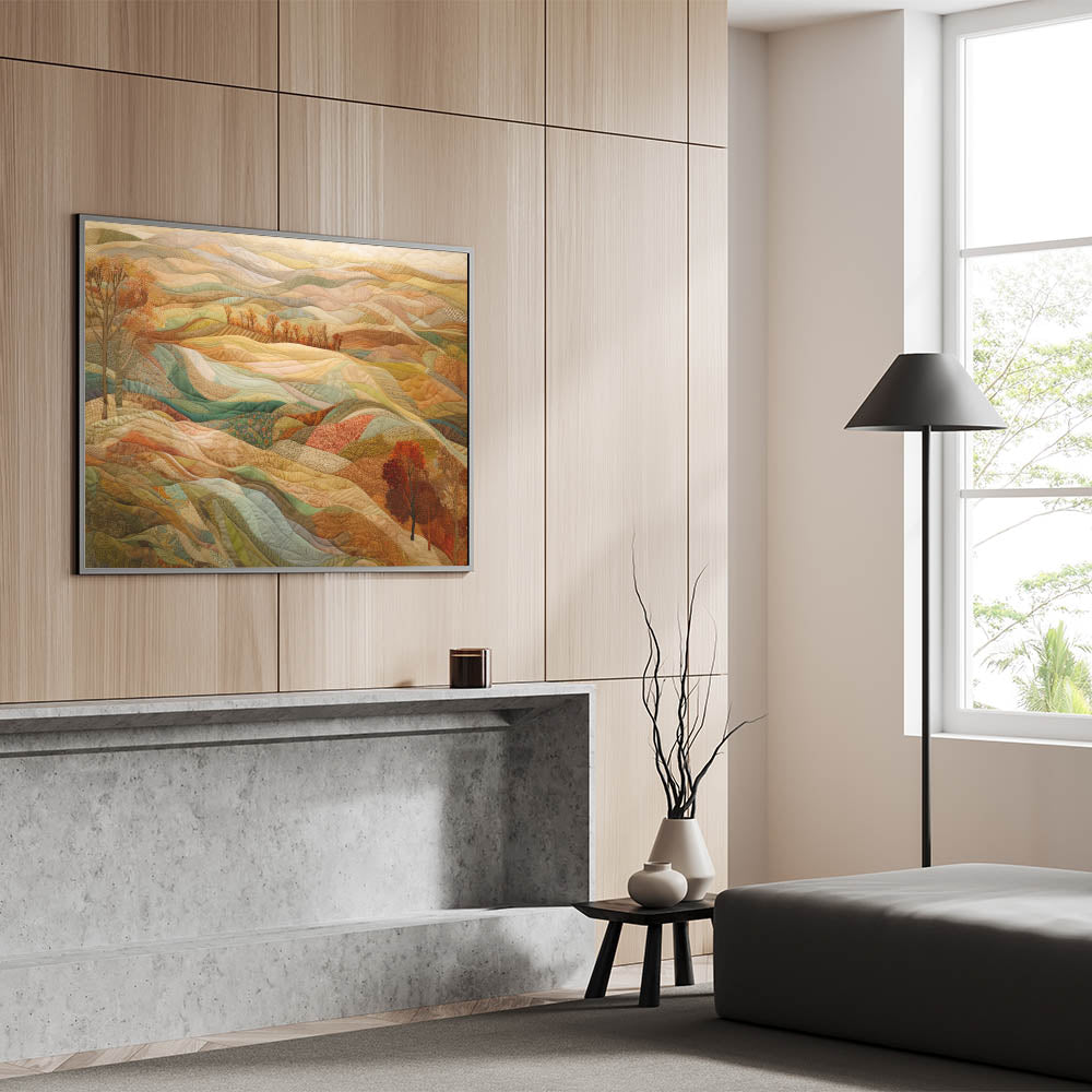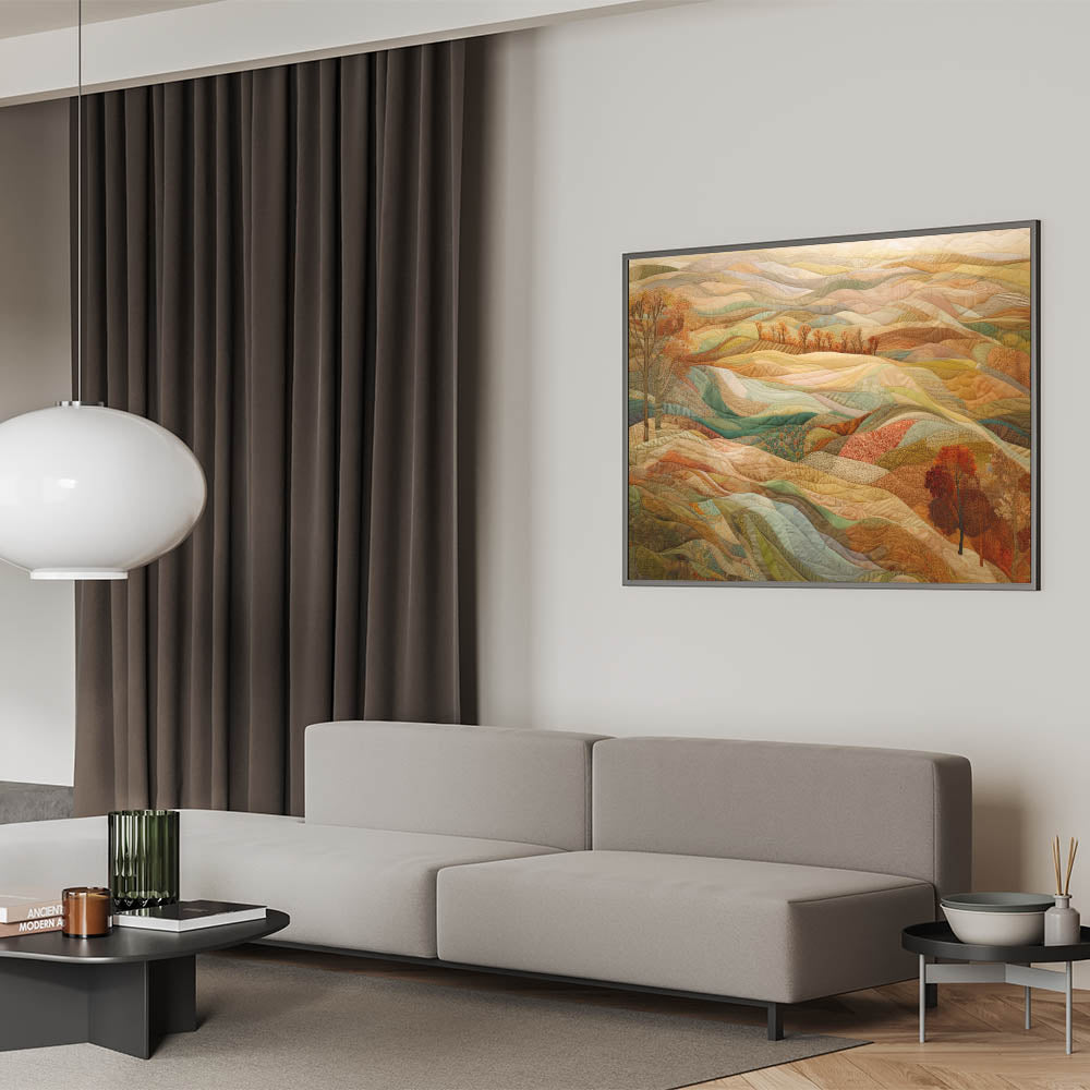 Immerse your space in the serene beauty of autumn with this fall-inspired wall art, showcasing a quilt-like landscape of rolling hills. The harmonious blend of warm fall tones, including soft browns, muted greens, and vibrant oranges, captures the essence of harvest season. This unique artwork beautifully combines rustic fall scenery with nature-inspired details, making it an ideal choice for those who appreciate cozy and inviting wall decor.