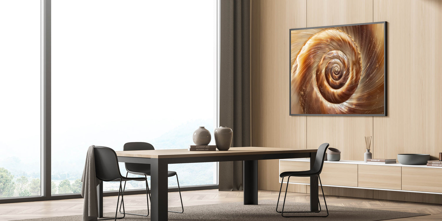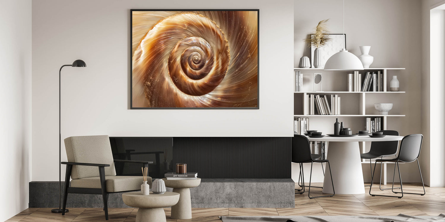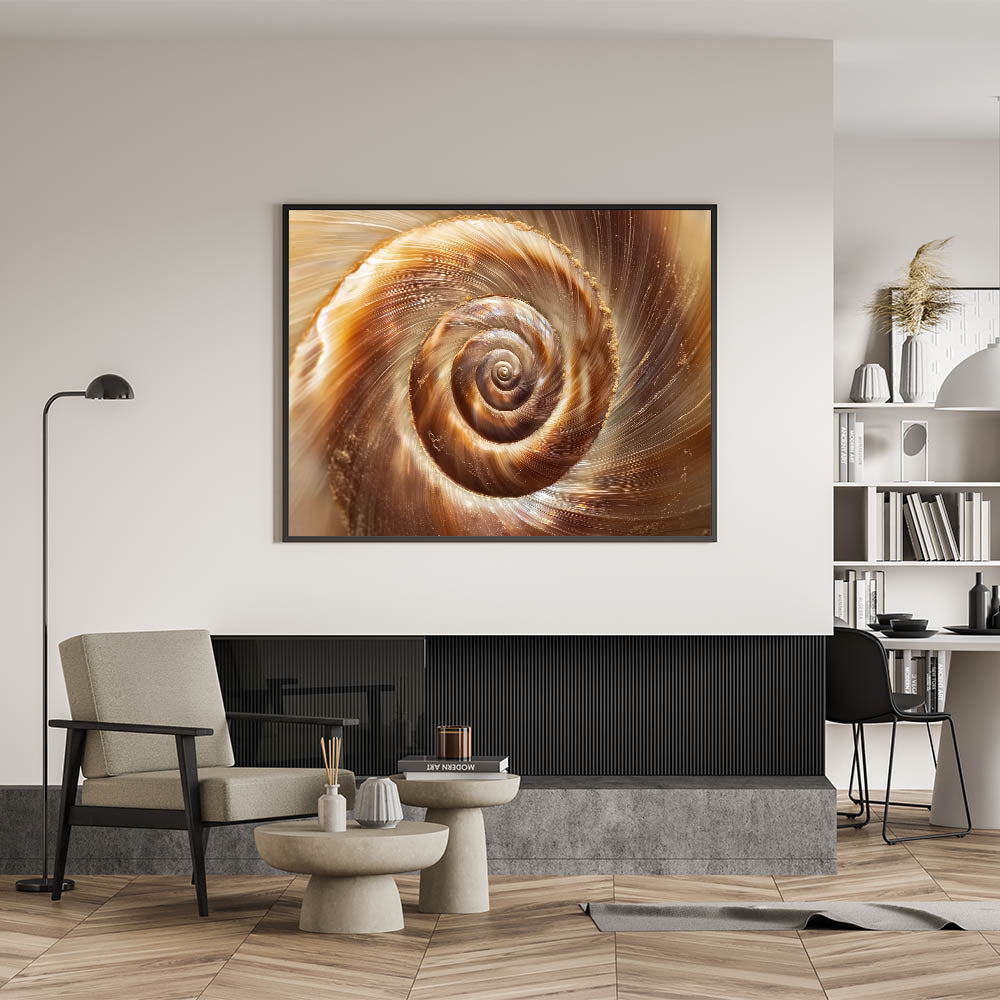 Enhance your home decor with the organic beauty of this spiral shell close-up wall art. Showcasing mesmerizing swirls in earthy tones of beige, brown, and amber, this piece captures the intricate textures and timeless charm of nature’s artistry. Its warm hues and dynamic composition make it a stunning focal point for any room.